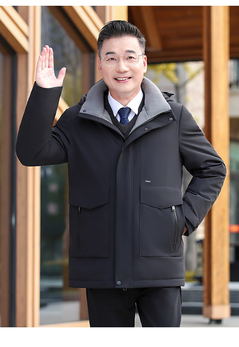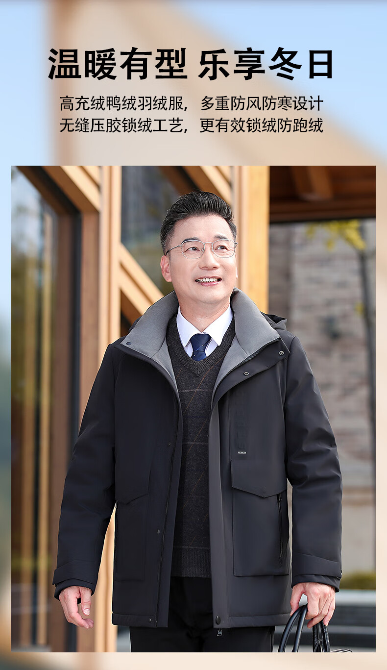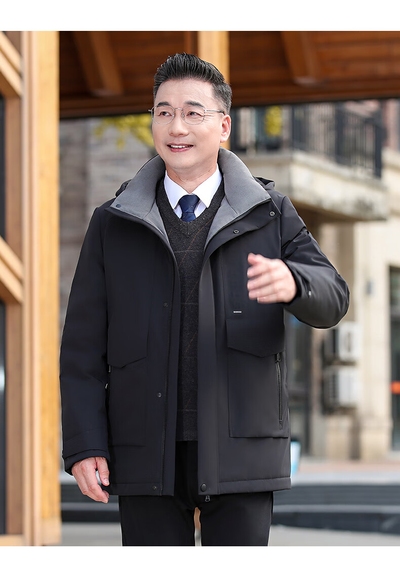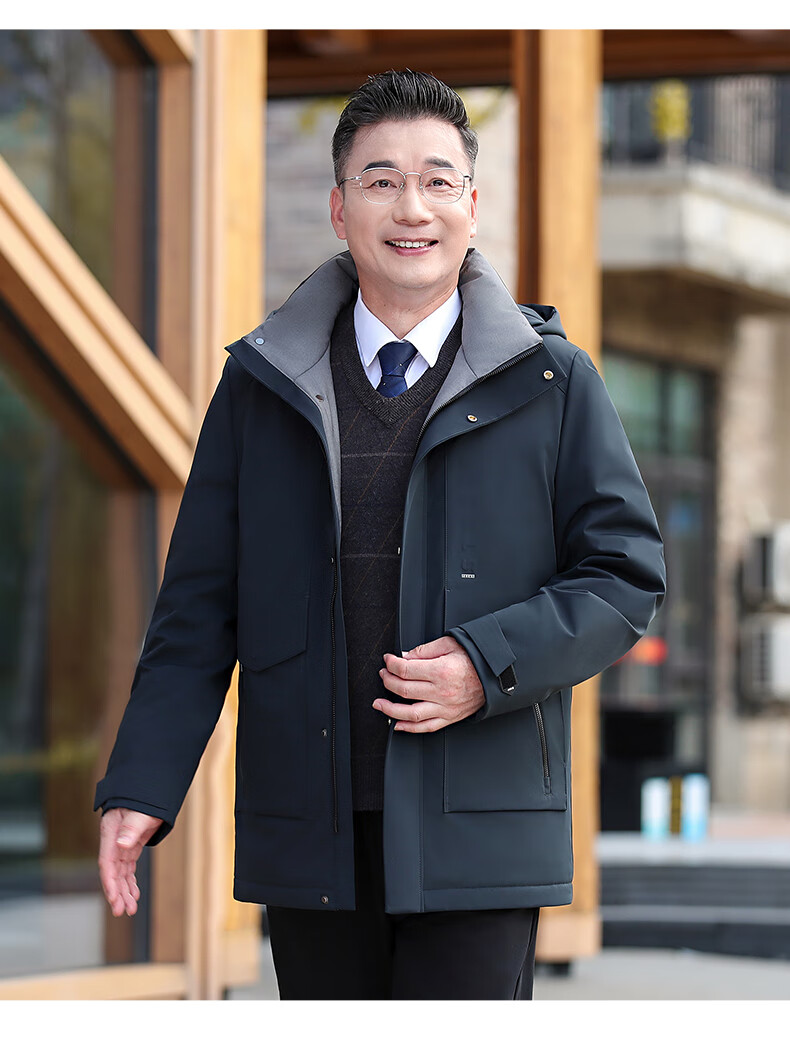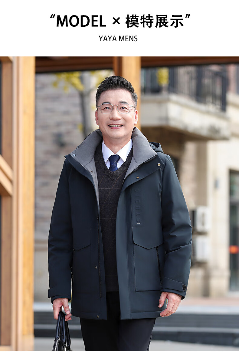 YAYA middle-aged and elderly short down jacket 2024 winter new men's business casual hooded daddy warm jacket HG navy blue L (175)