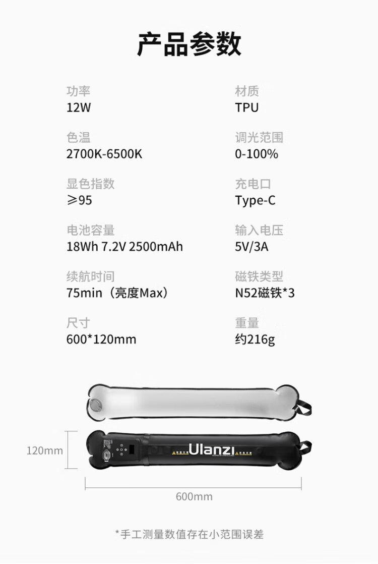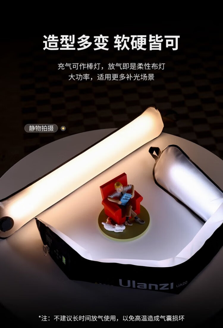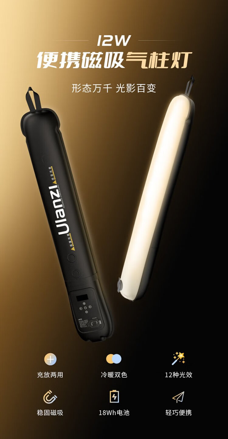 Ulanzi 12W/20W two-color thermomagnetic air column lamp, film and television photography inflatable fill light handheld LED light stick live broadcast wedding camping outdoor portable soft light 20W air column lamp | built-in battery | 55min battery life