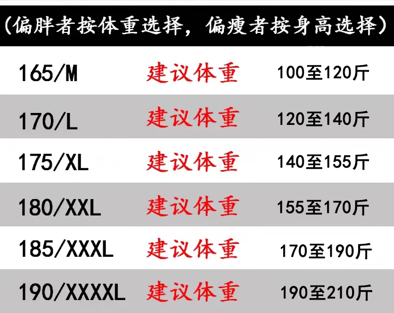 China (cm) 160-165/84-86 165-170 / 88-90 167-172 / 92-96 168-173 / 98-102 170-176 / 106-110