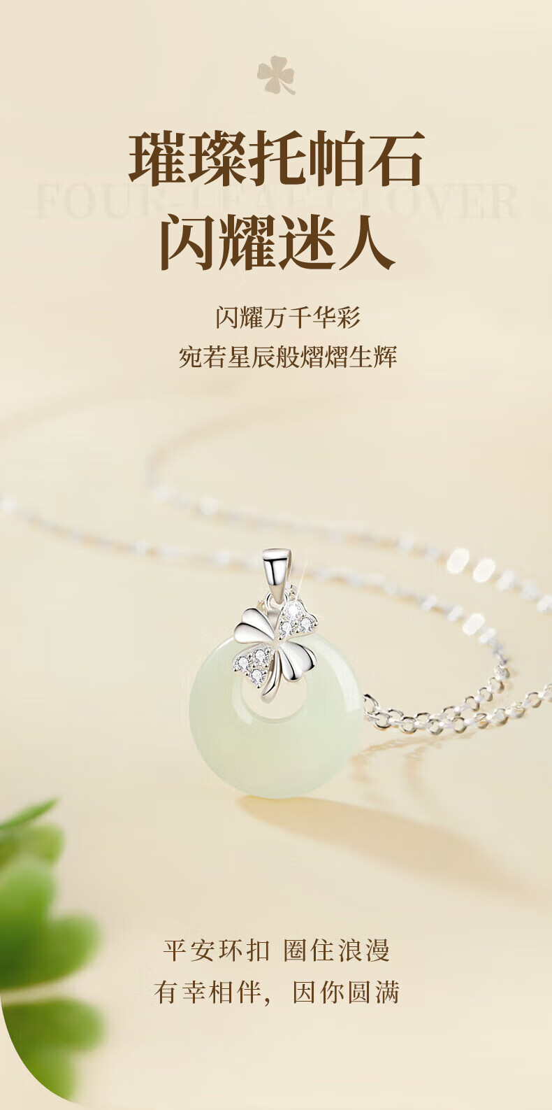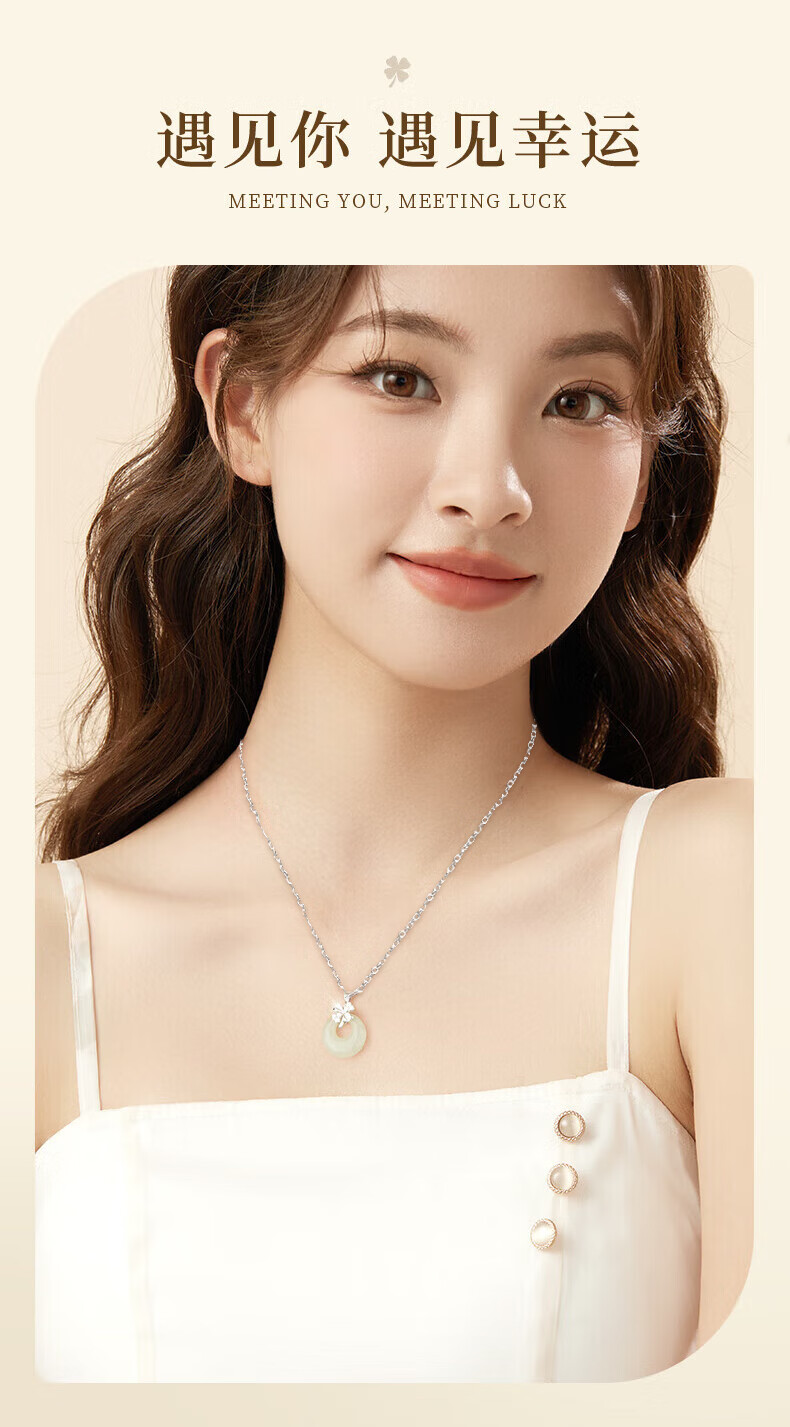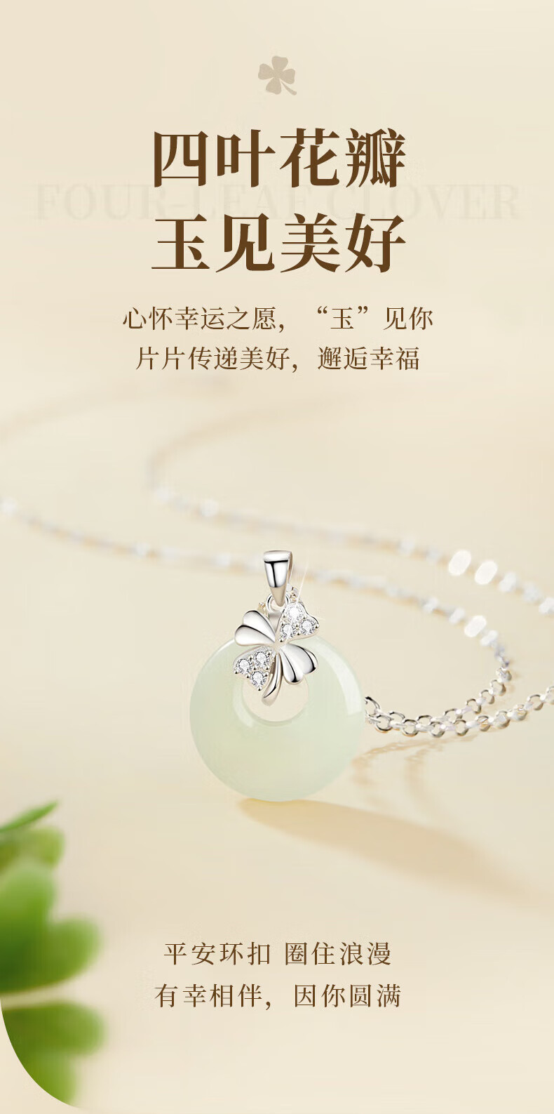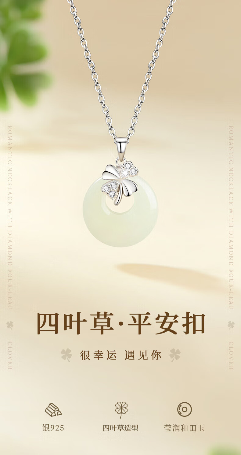 China Gold Hetian Jade Peace Buckle Silver Necklace Women's Four Leaf Clover Jade Pendant Girl Birthday Gift Girlfriend Wife Wedding Anniversary Four Leaf Clover Peace Buckle Necklace Jingsuda