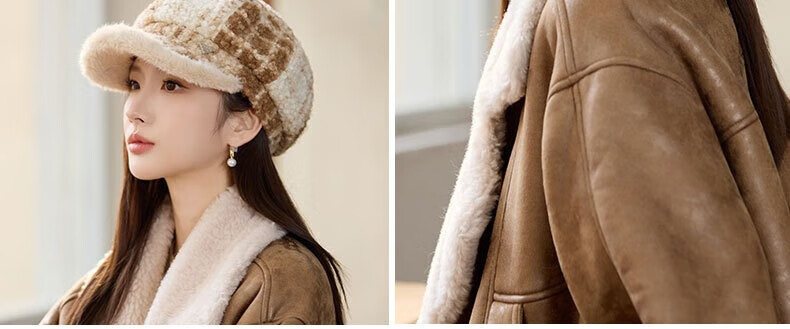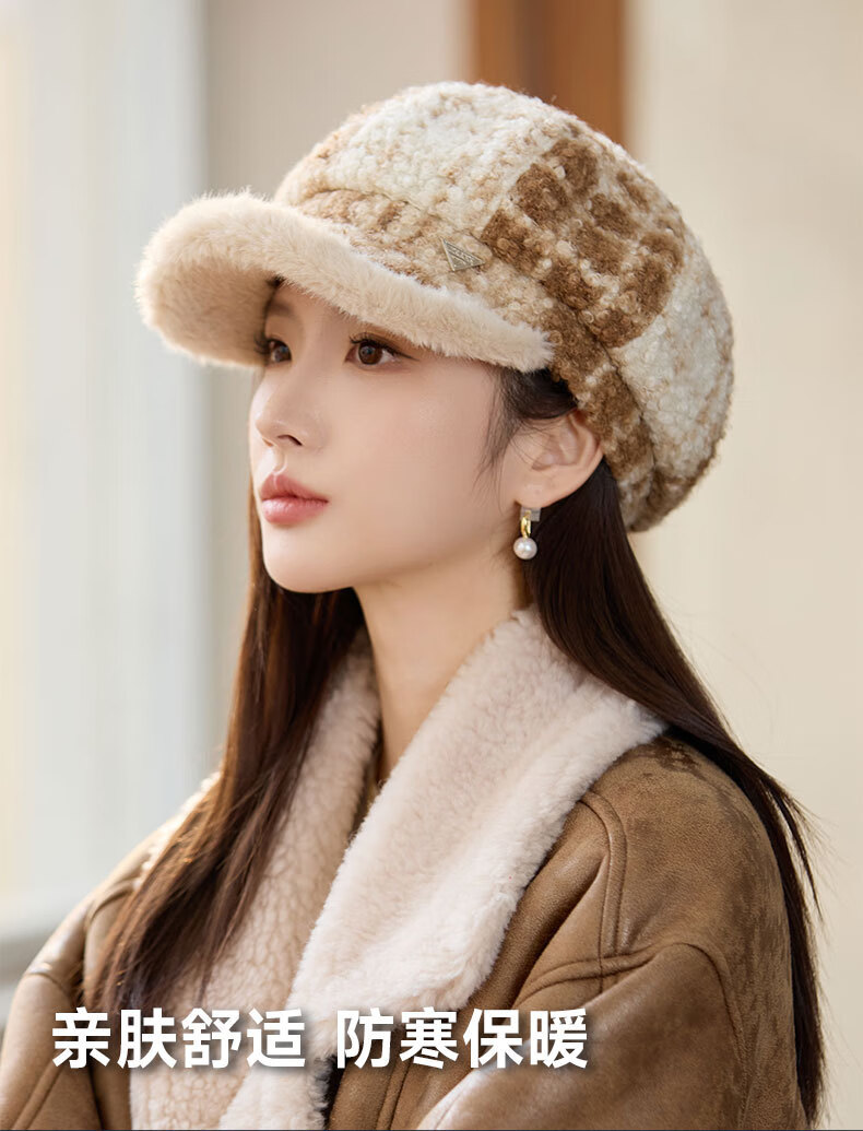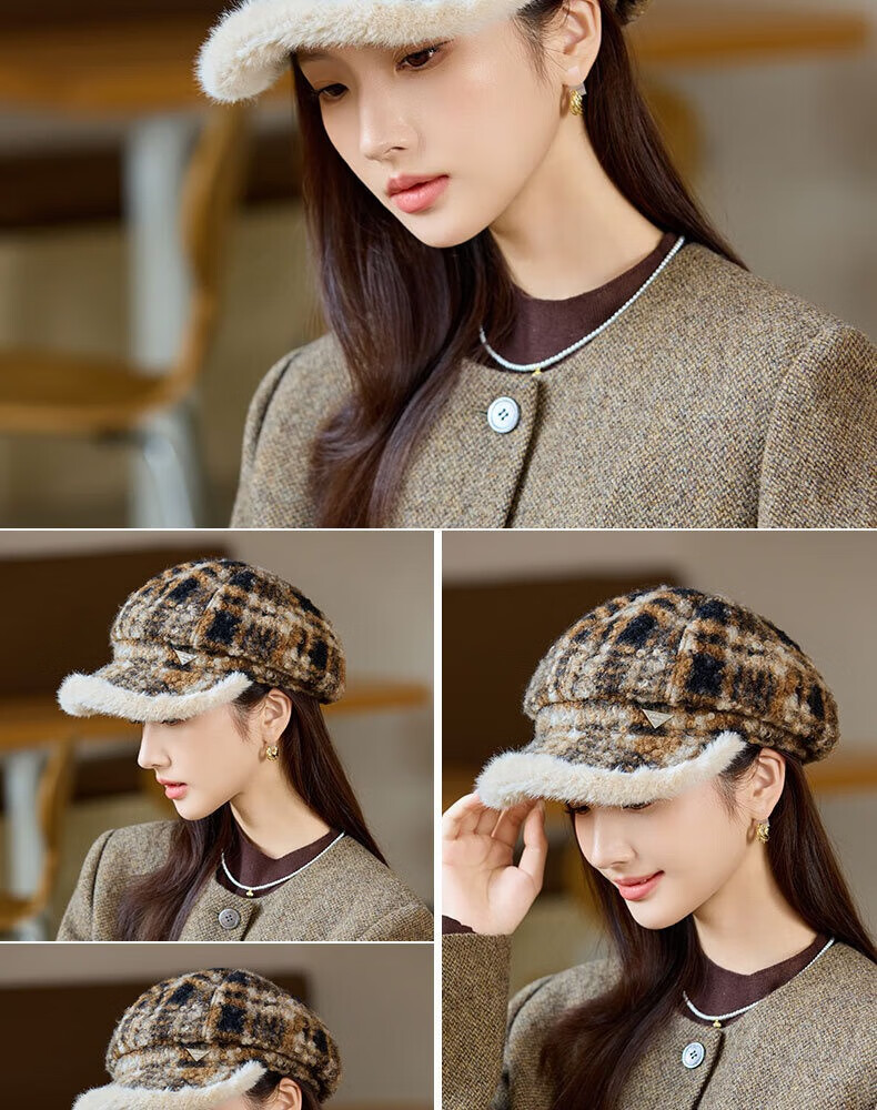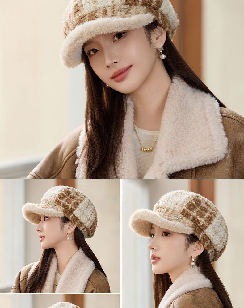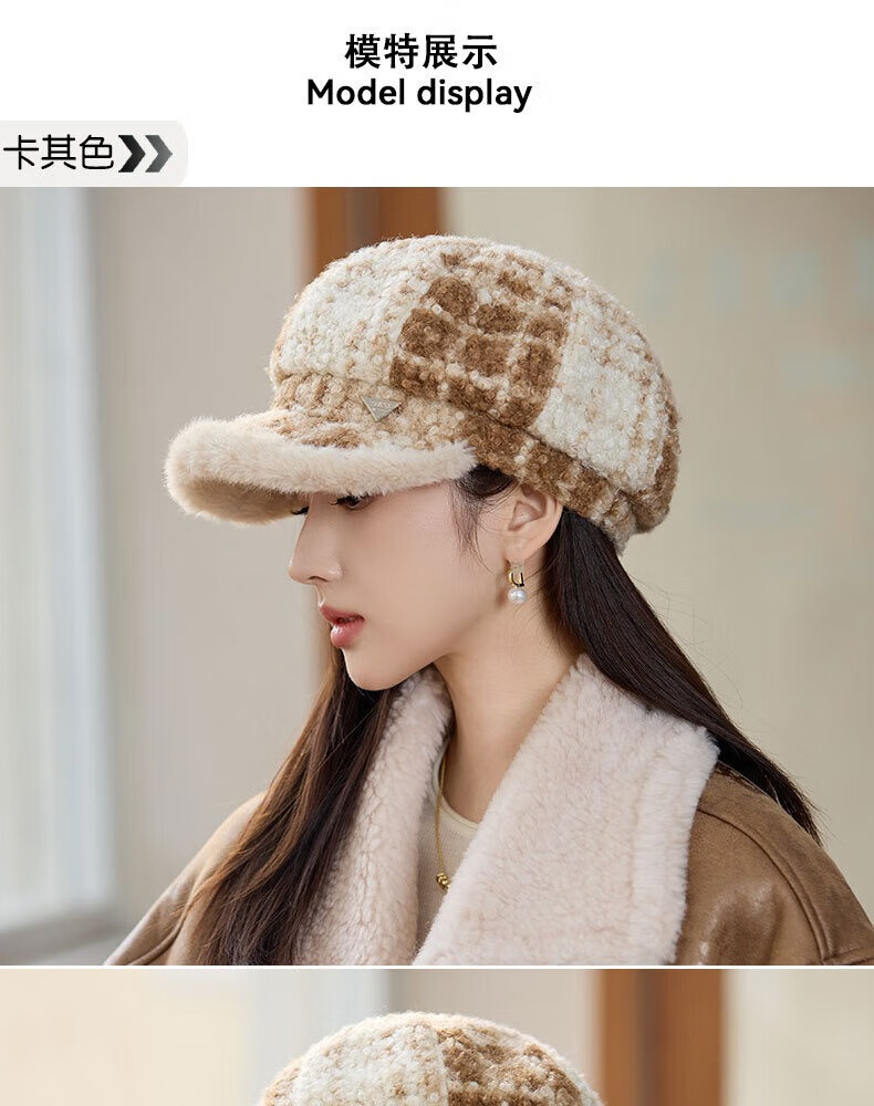 Jimmy Leaf lamb wool octagonal hat women's autumn and winter warm beret big head suitable for showing face small newsboy hat painter hat khaki color one size M (56-58cm)