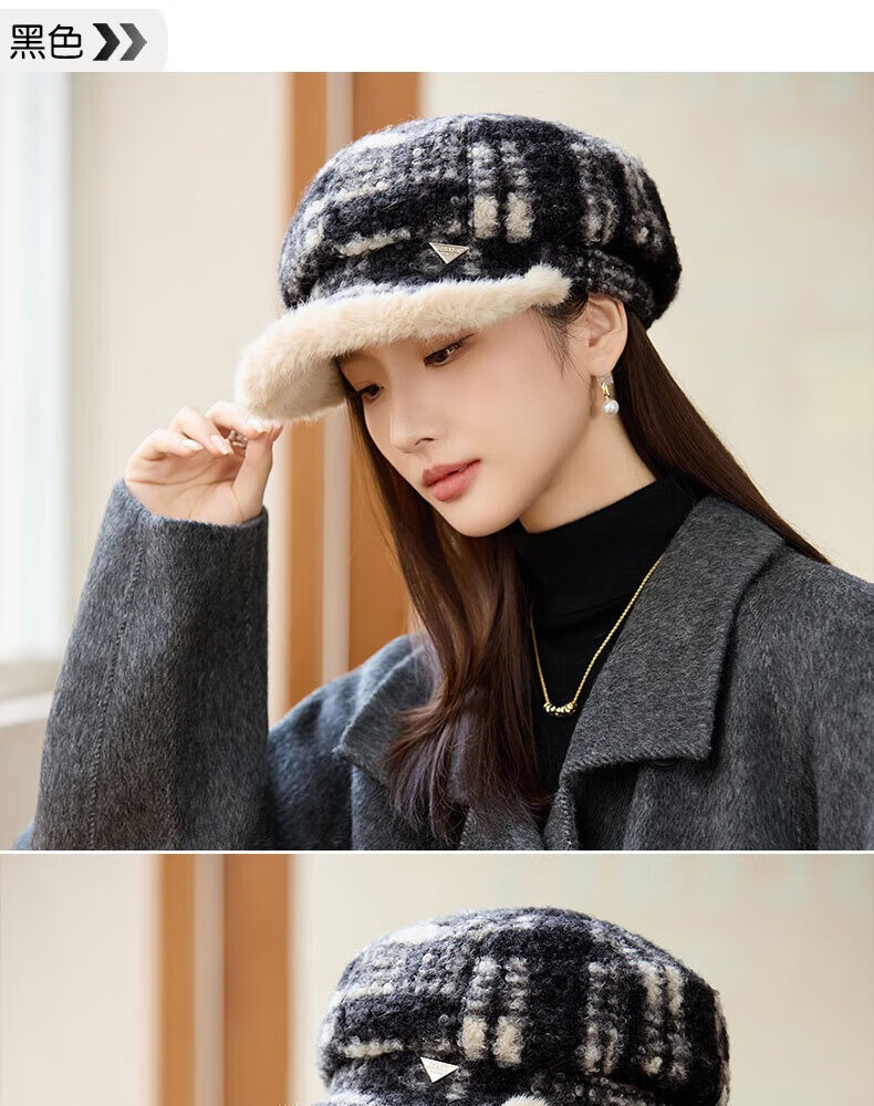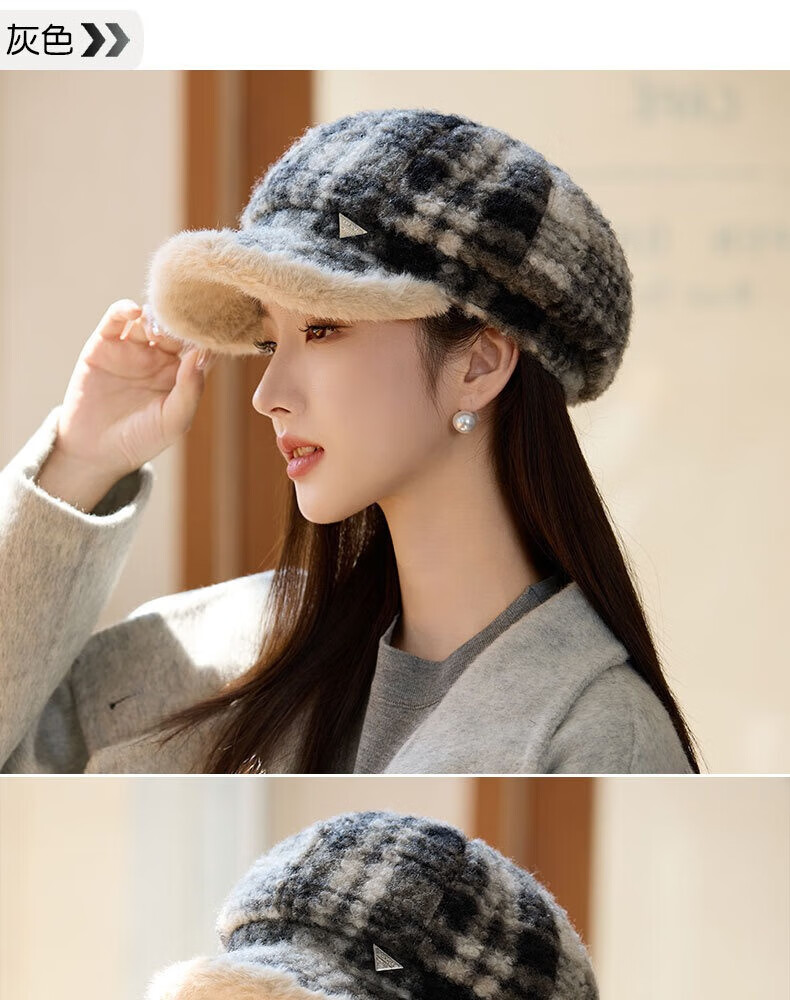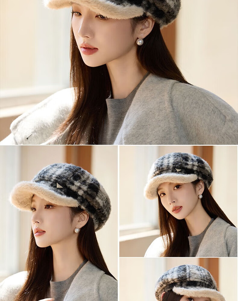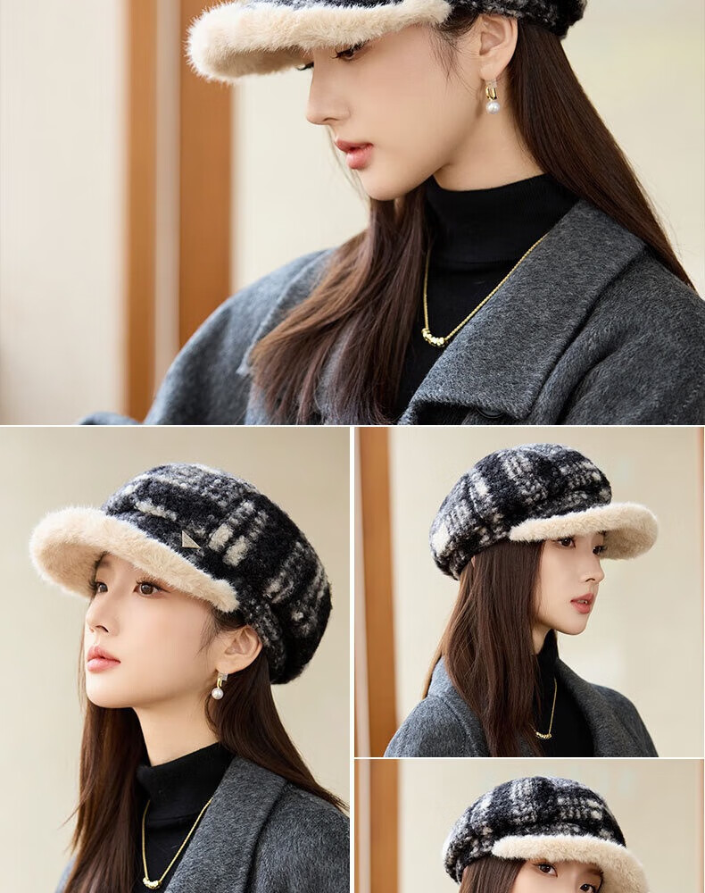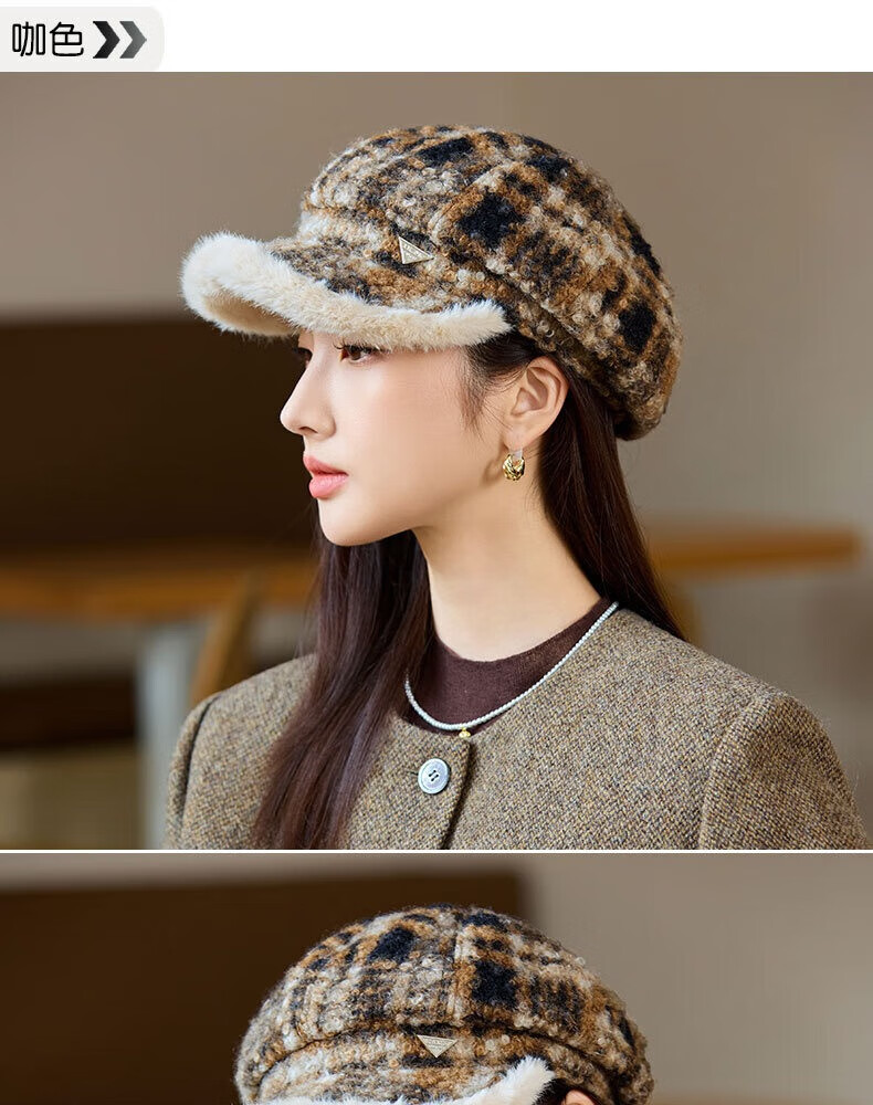 Jimmy Leaf lamb wool octagonal hat women's autumn and winter warm beret big head suitable for showing face small newsboy hat painter hat khaki color one size M (56-58cm)