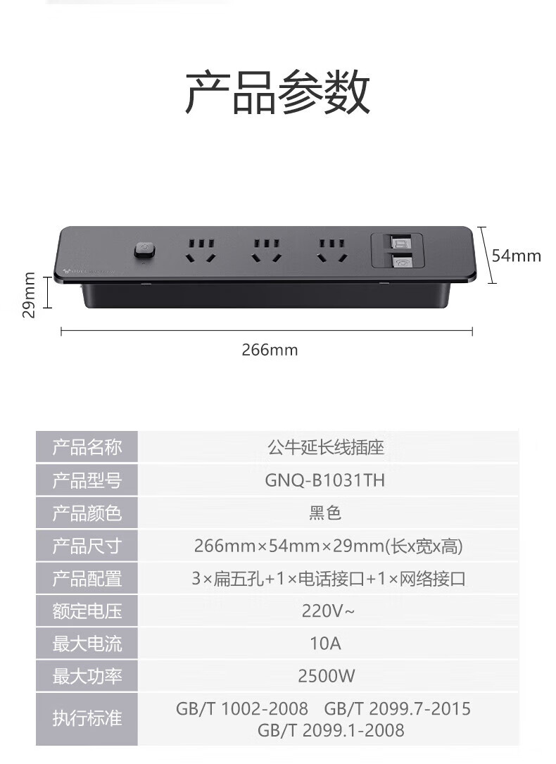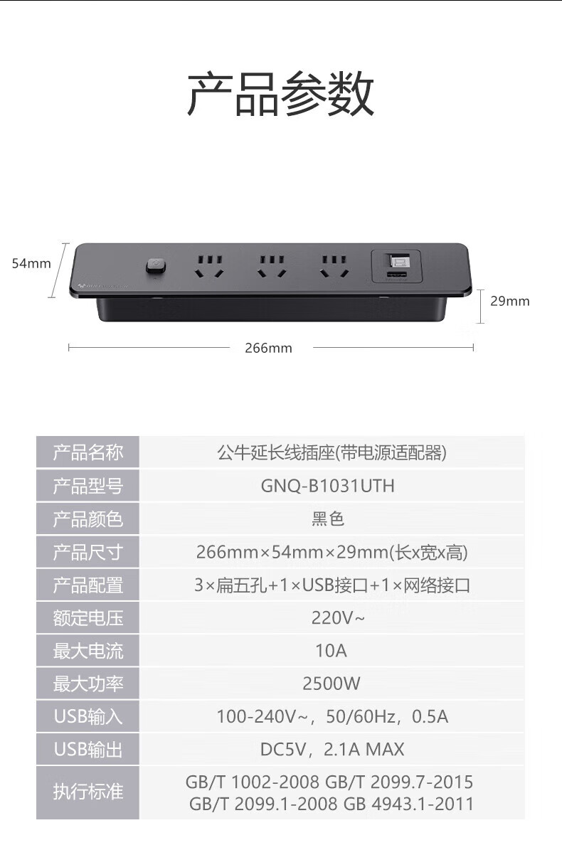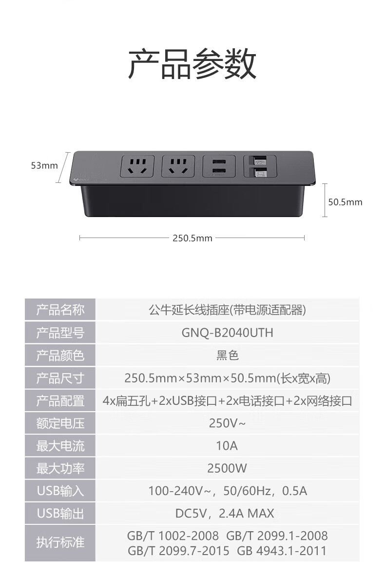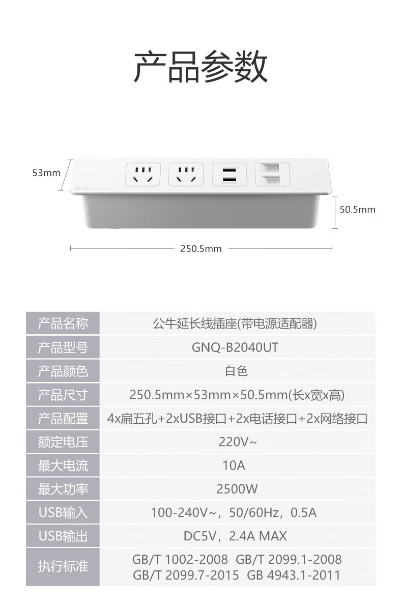 BULL Embedded Socket Panel Desktop Porous Furniture Desk Cabinet Cabinet Plug Strip Strip with Line One-Button Master Control Five Holes with USB Telephone Whole House Electrician Electrical Materials Two 5 Holes + 2 USB/Add Cable Total 1.8 Meters/Black