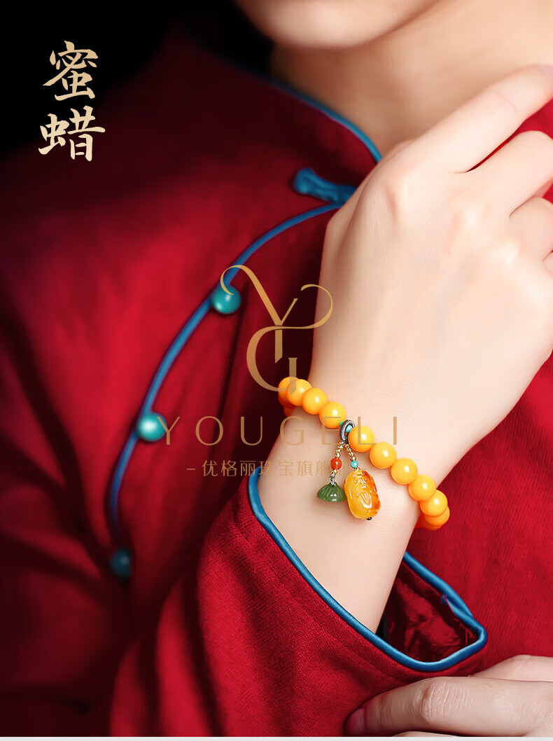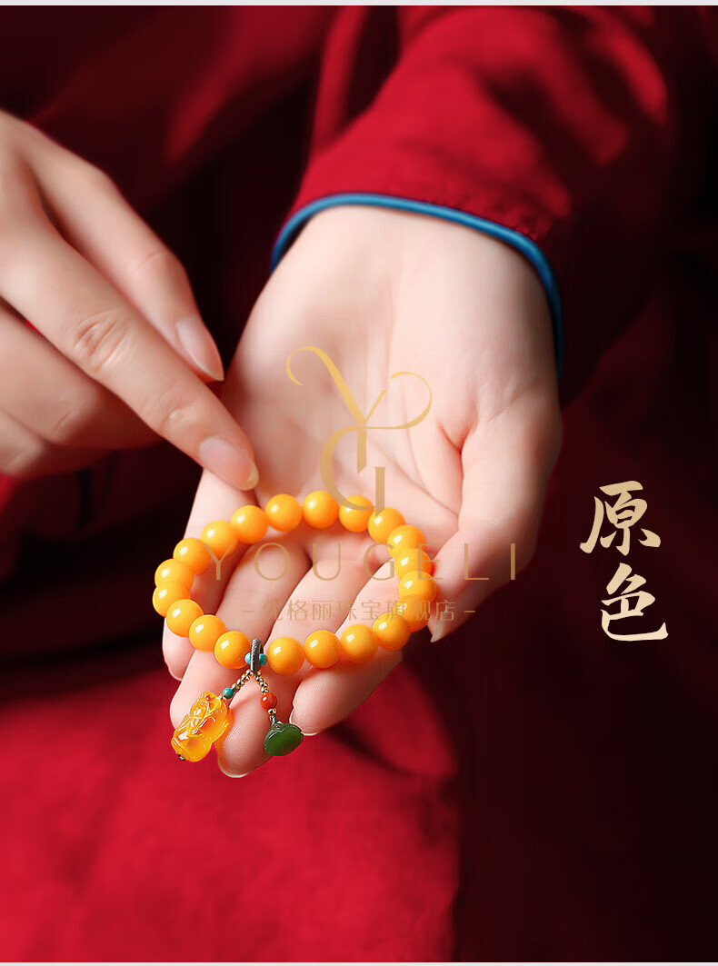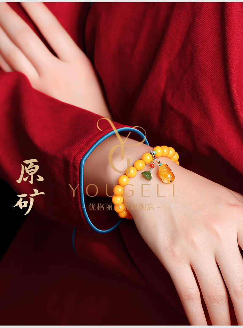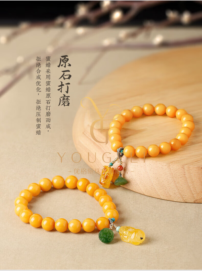 Yogurt natural beeswax bracelets for women, yellow round beads, amber beeswax single circle Pixiu accessories bracelet, beads 8mm