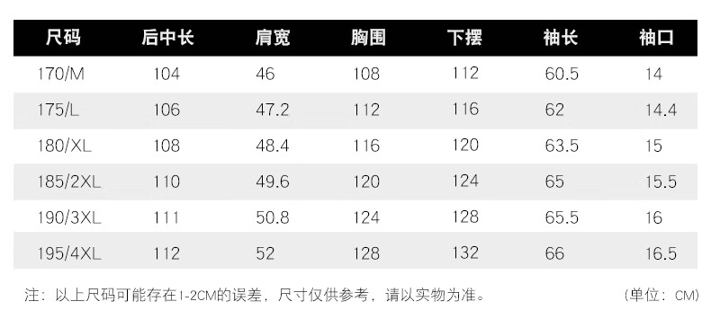 China (cm) 165 / 88-90 170 / 96-98 175 / 108-110 180 / 118-122 185 / 126-130