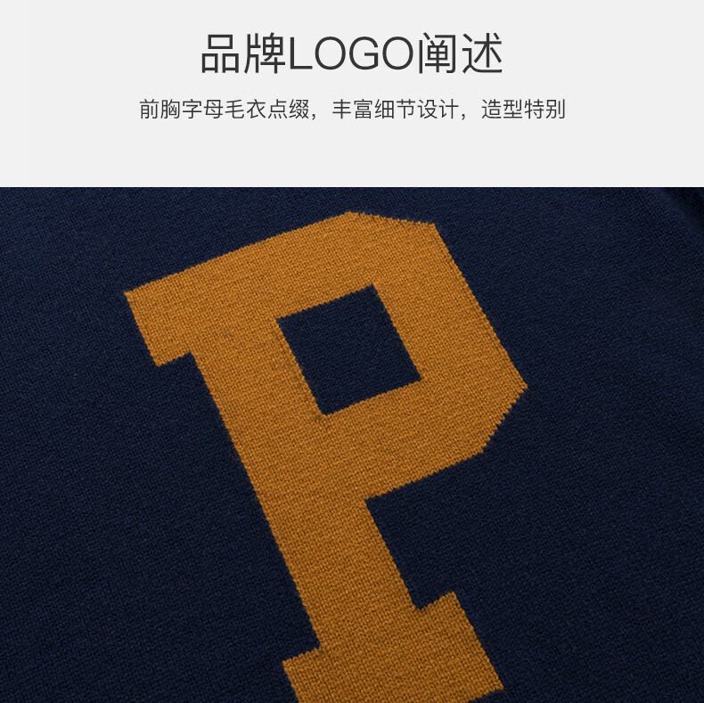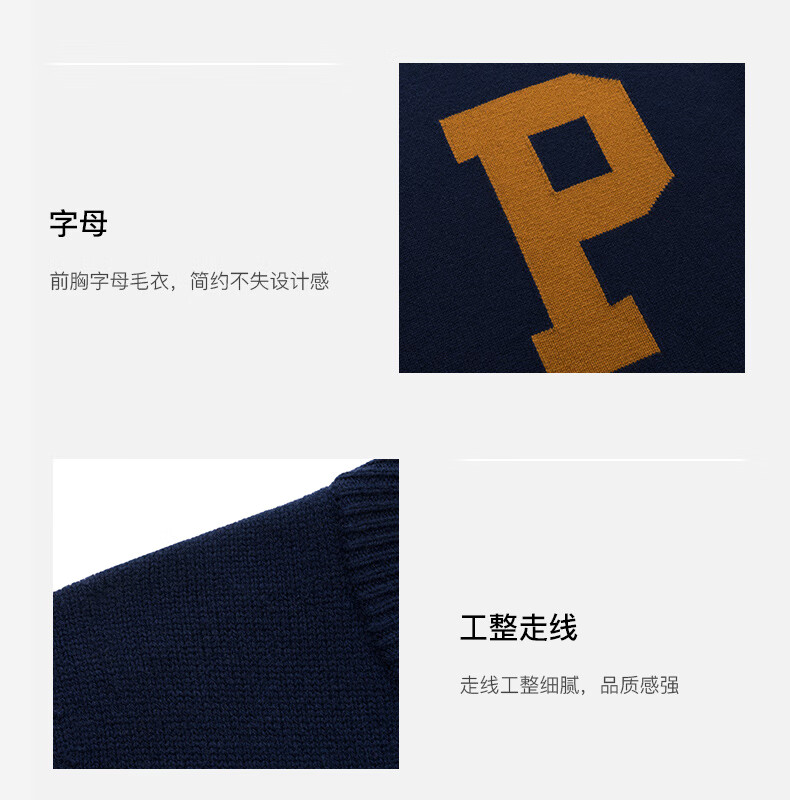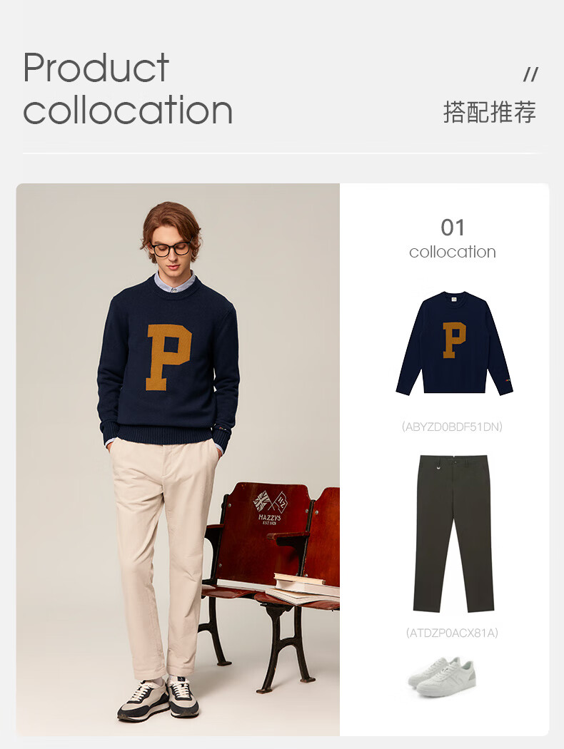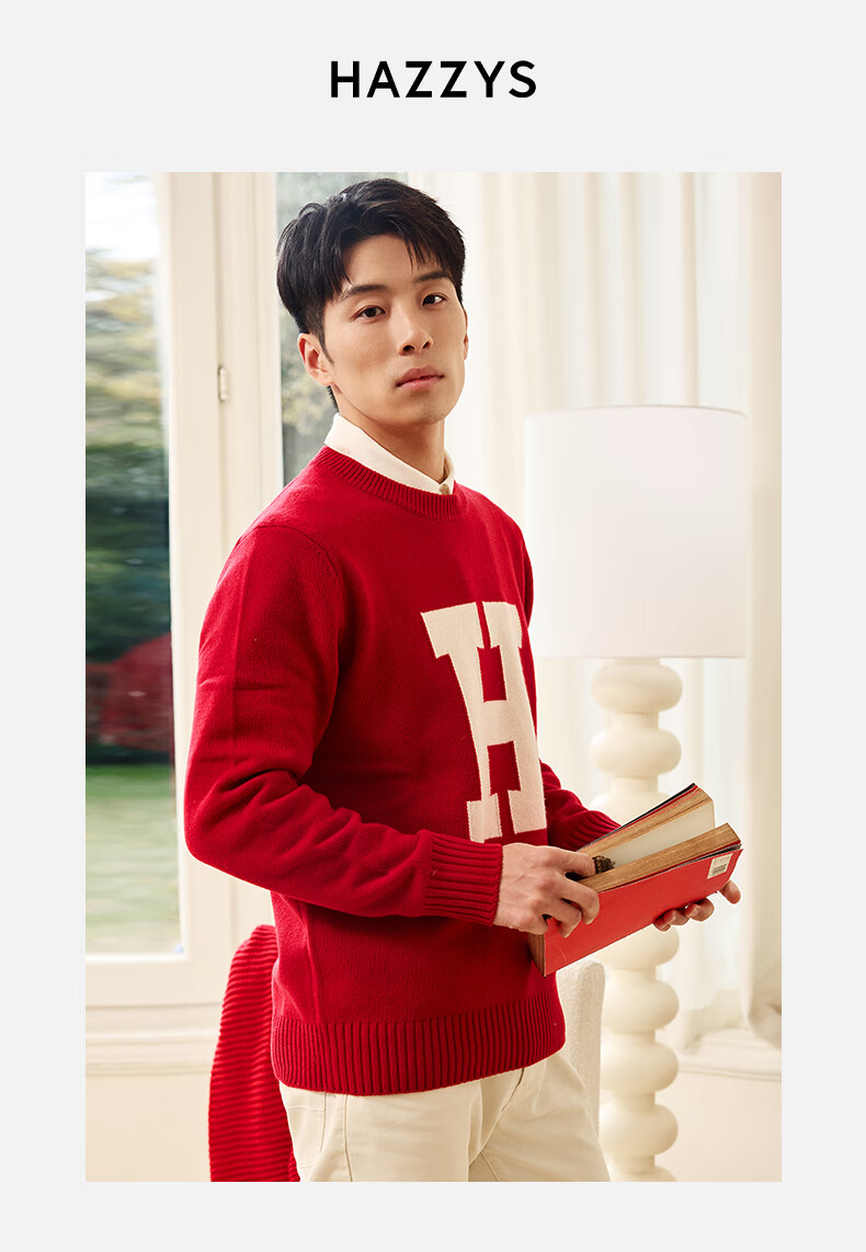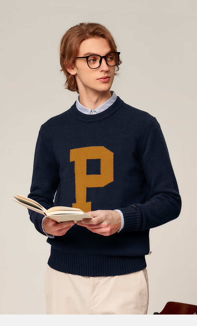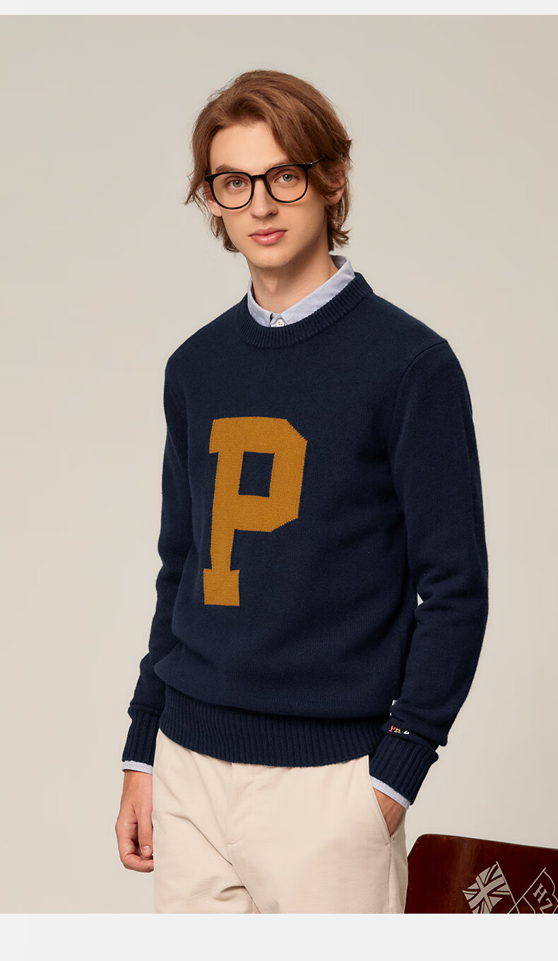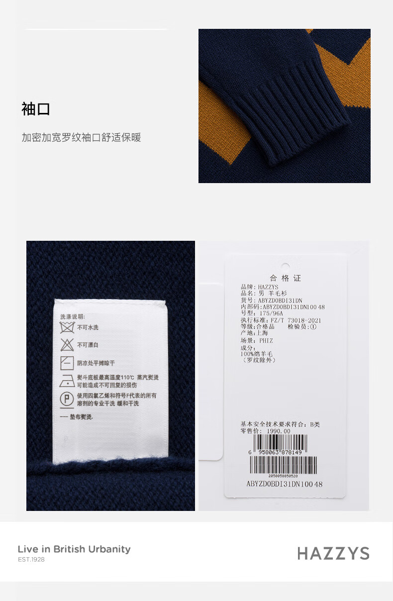 HAZZYS Men's Autumn and Winter Sweaters PHIZ Series Letter Knitted Wool Sweater Men's ABYZD0BDI31 Dark Navy Blue DN M (170/92A 46)