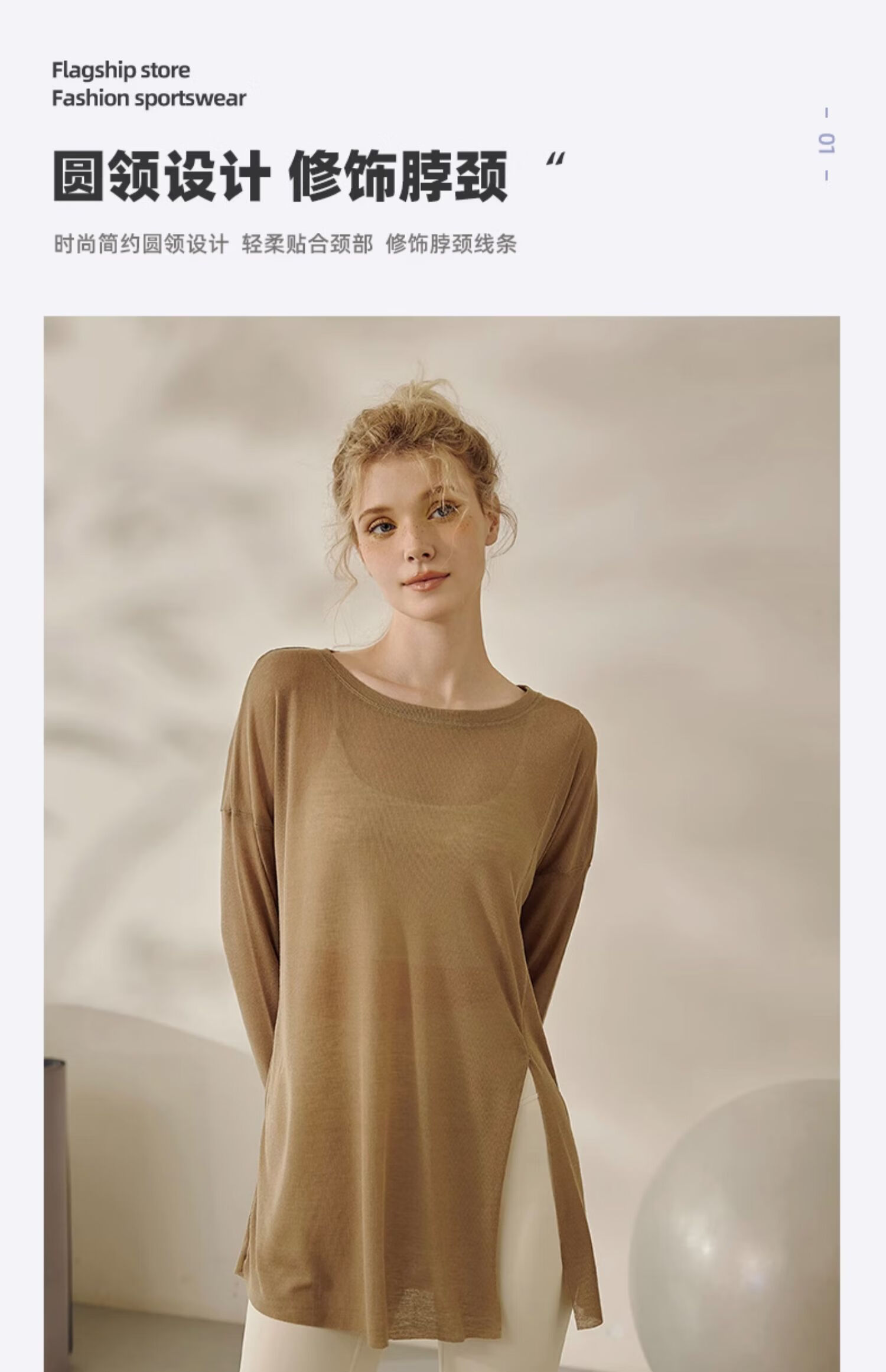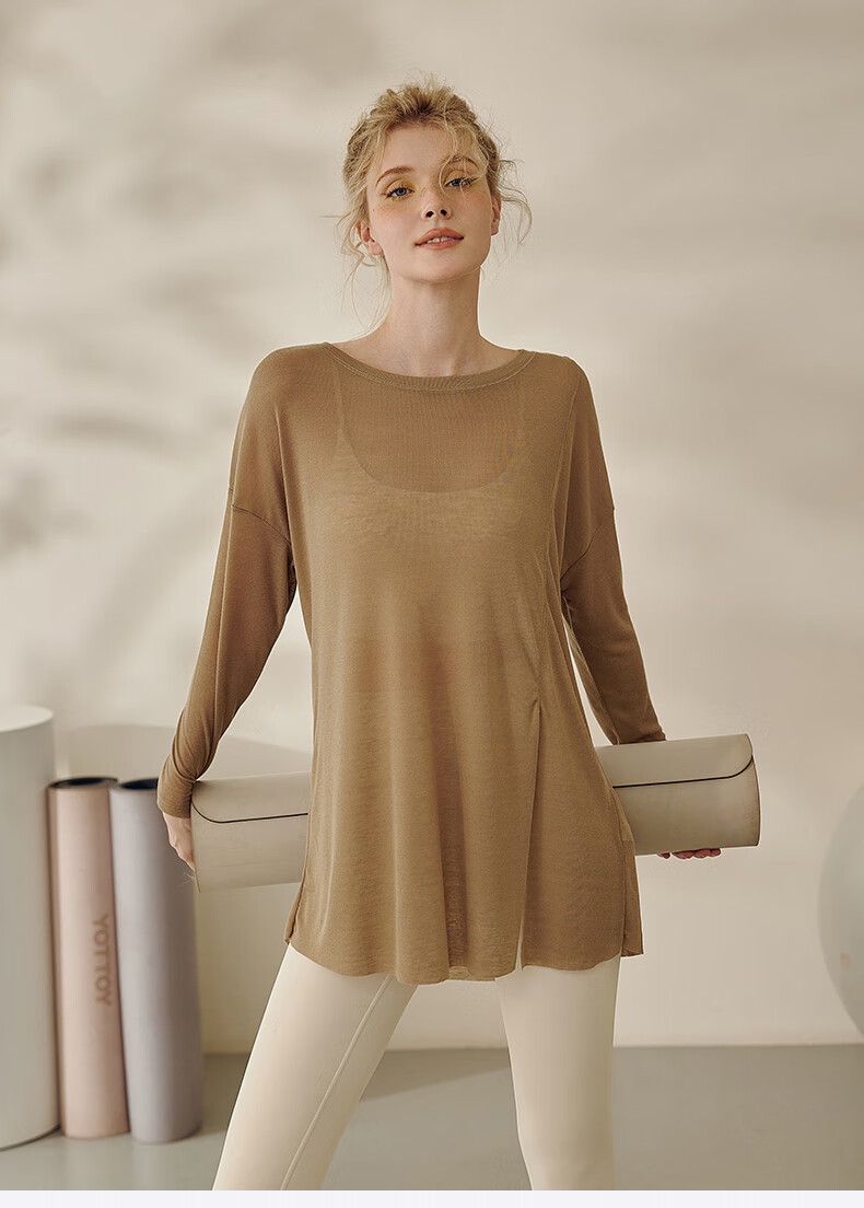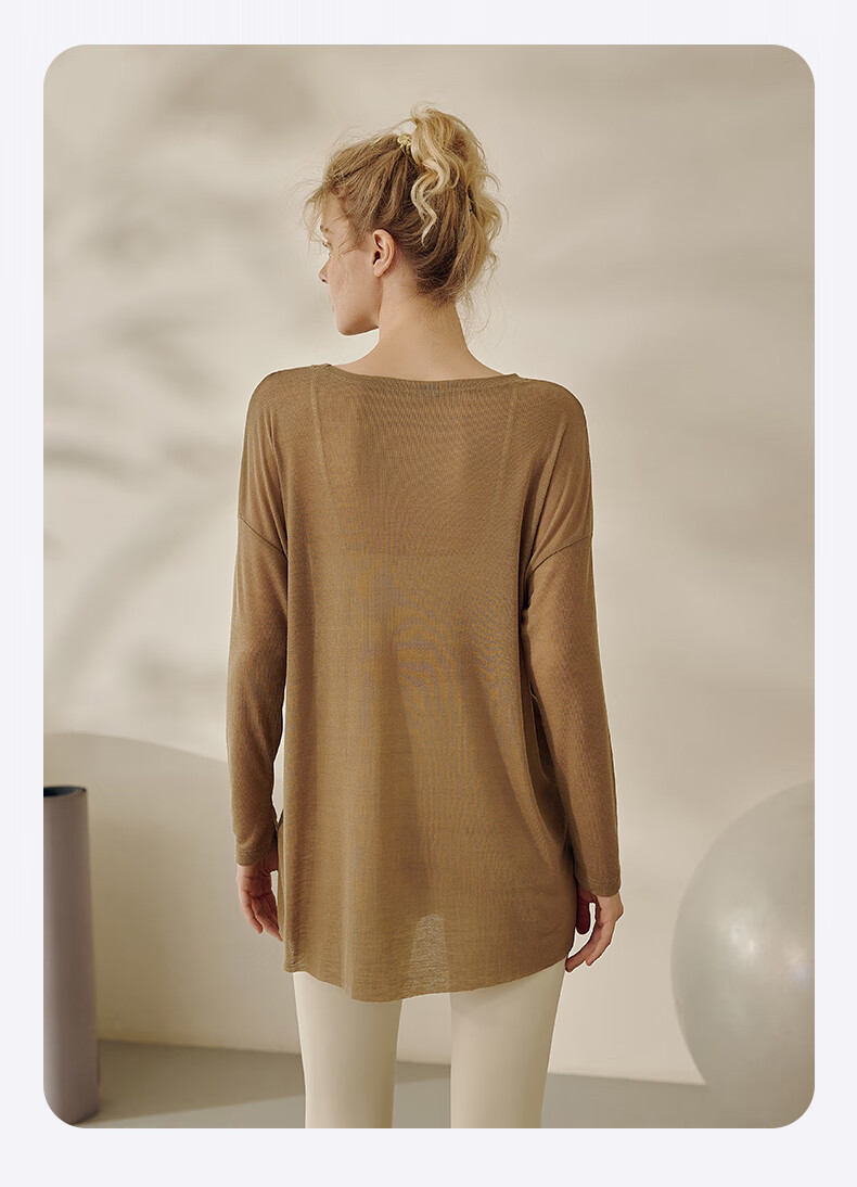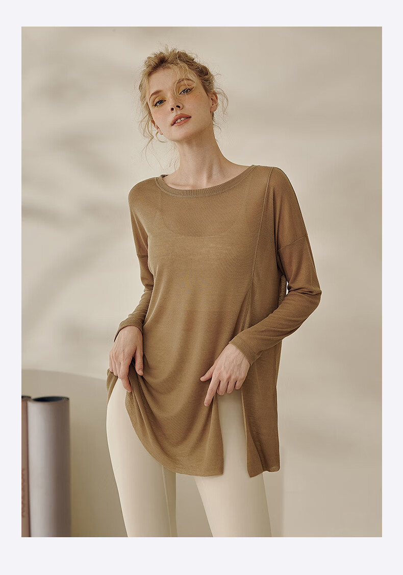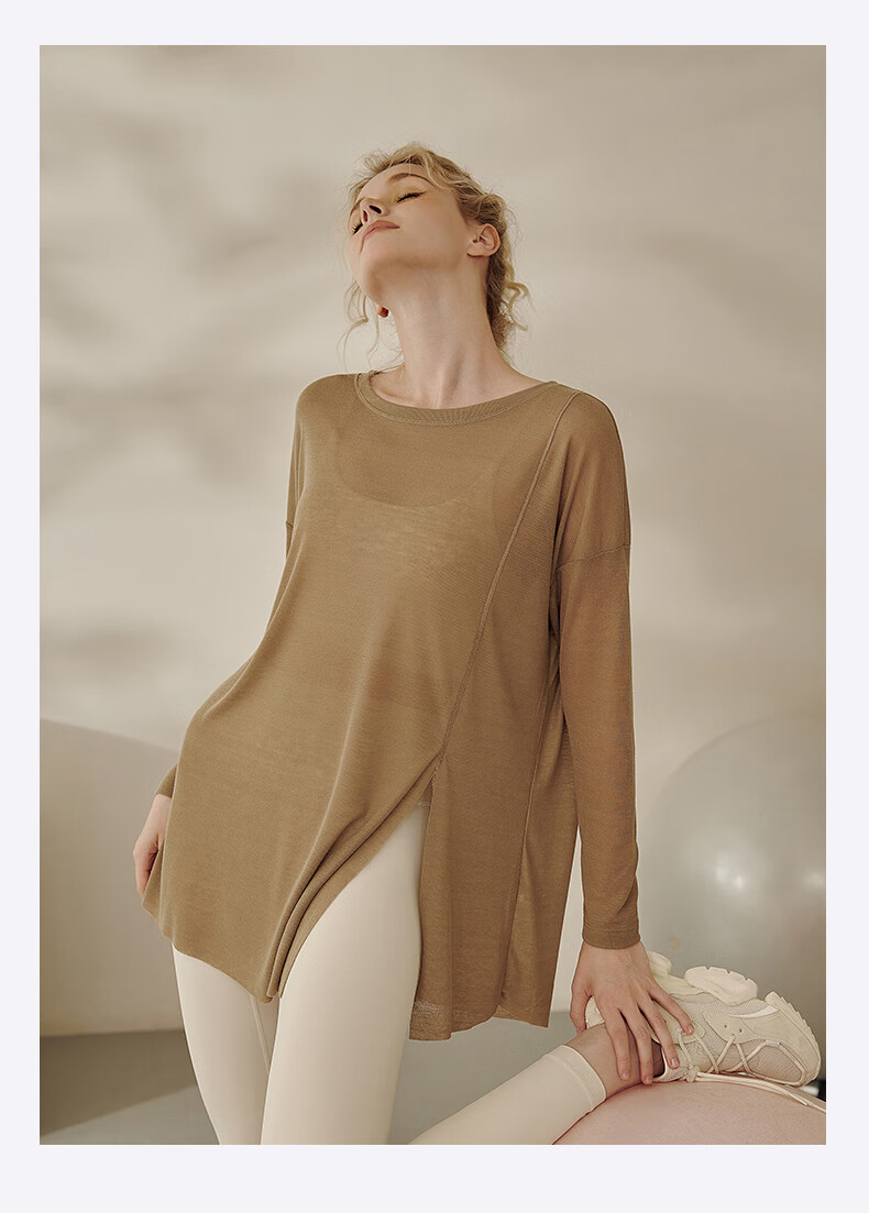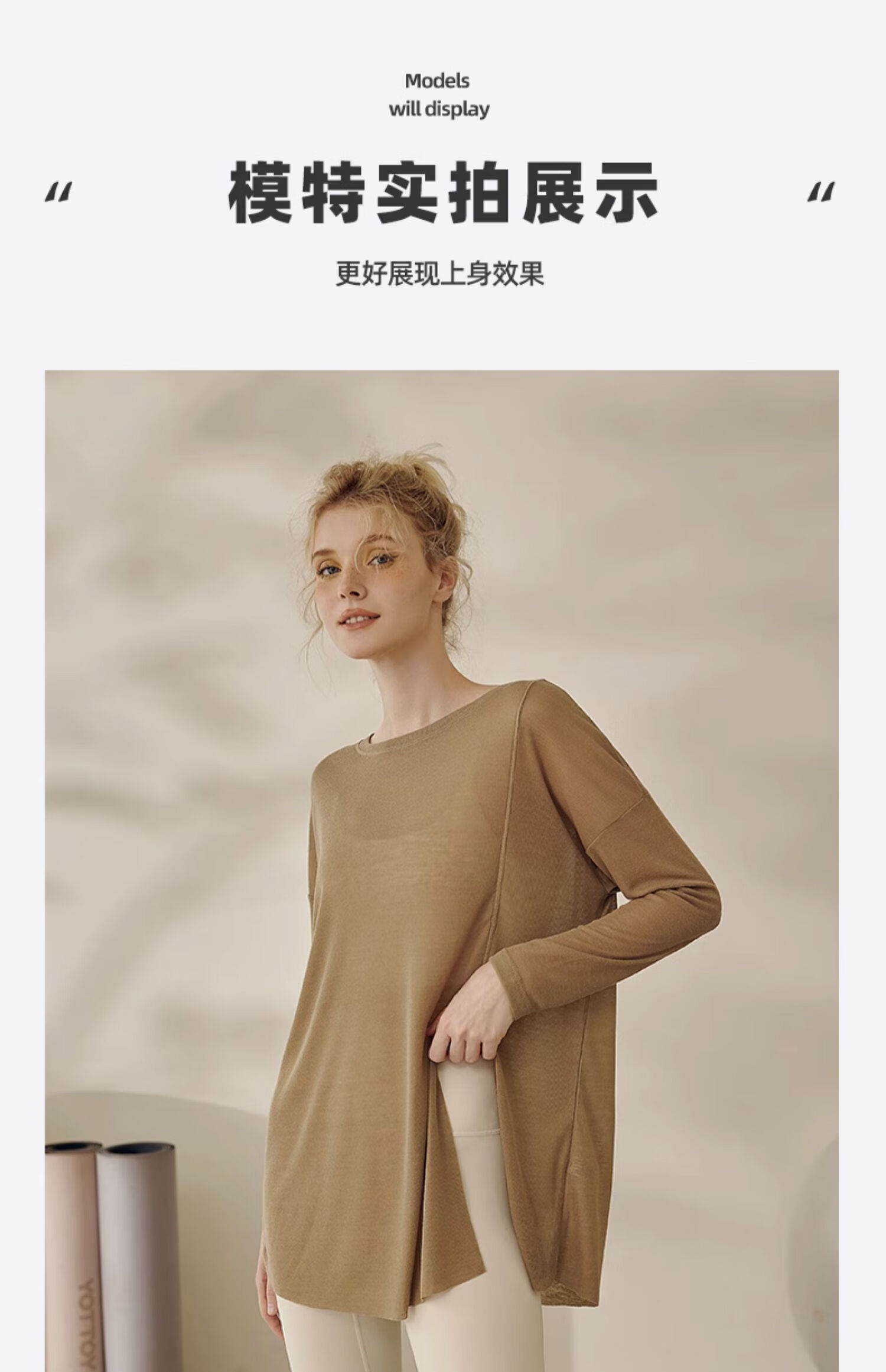 LULU CENTURY loose sports top women's breathable running Pilates training fitness cover-up long hip-covering yoga wear long-sleeved khaki brown S/M