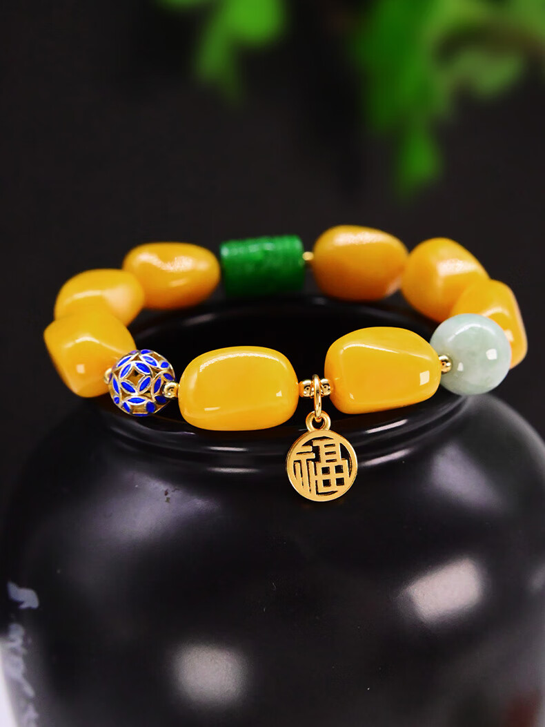 La Yun Feiyin Chicken Fat Yellow Amber Beeswax Bracelet Women's Hetian Jade Round Beads Lutong Jasper Blessing Hand Ornaments Generous Bracelets