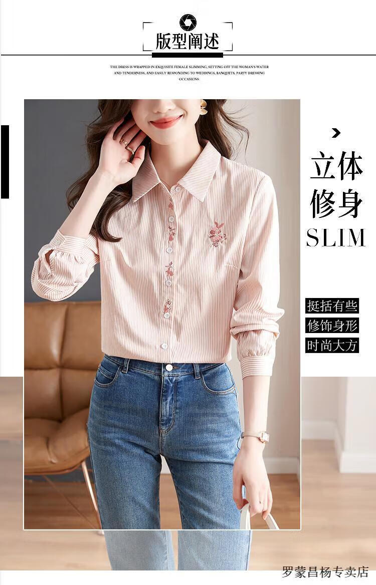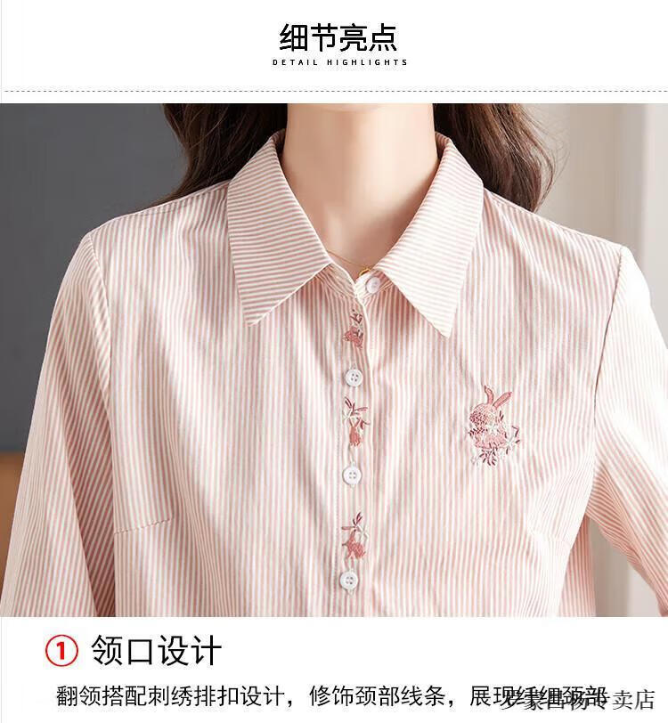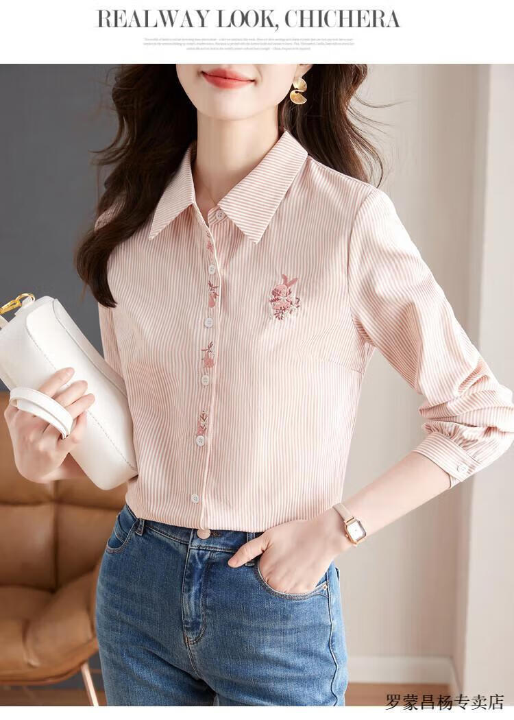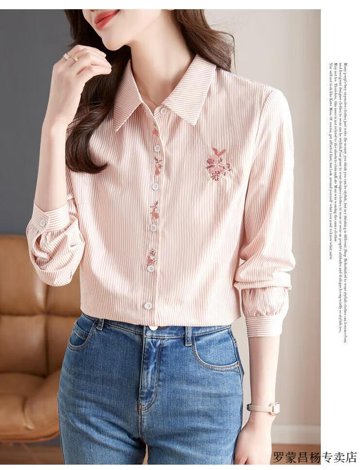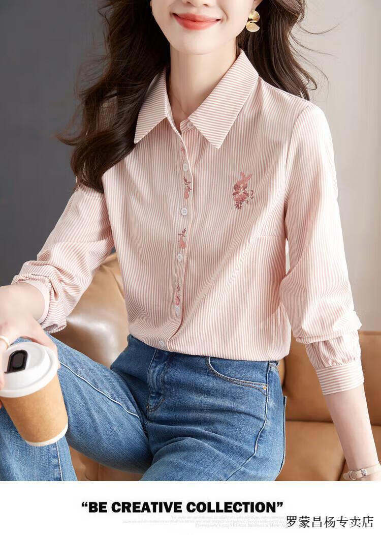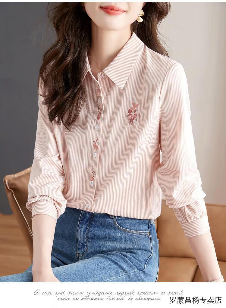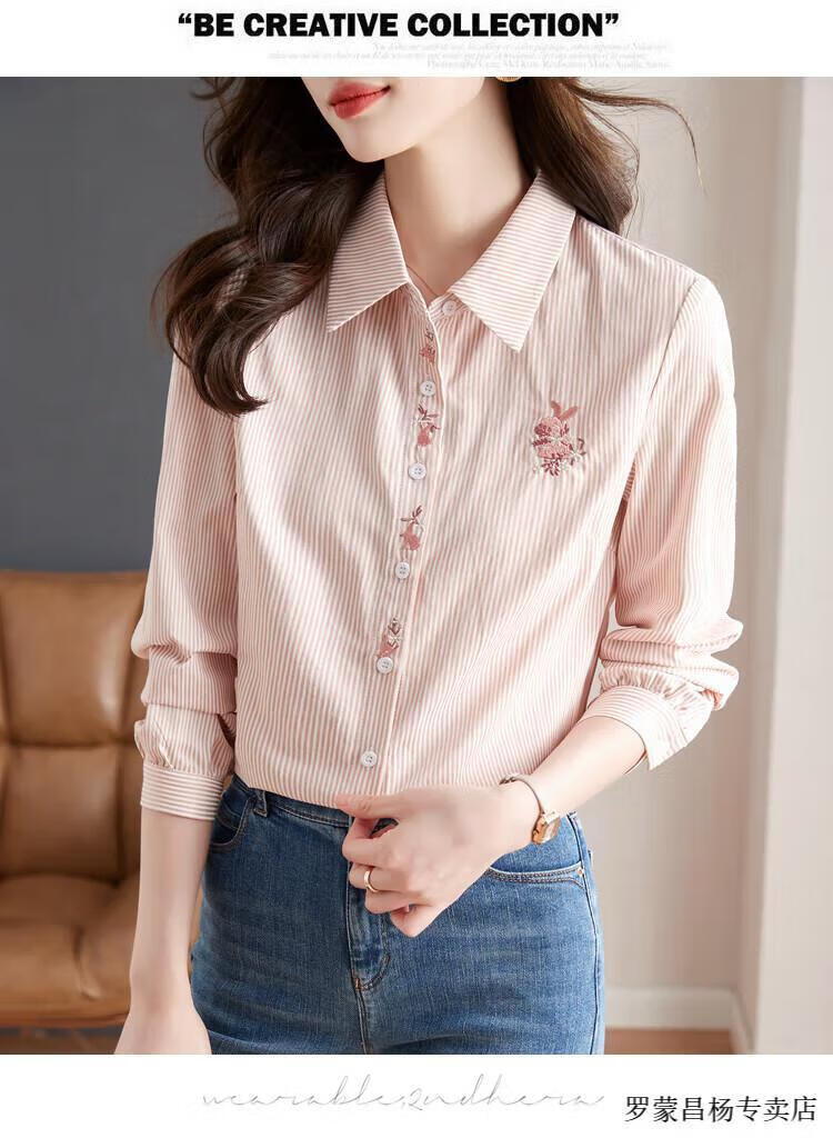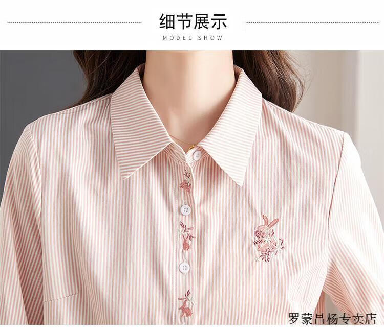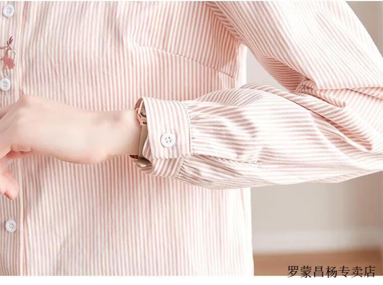 ROMON cotton striped embroidered shirt women's single-breasted shirt 2026 autumn new loose and versatile top pink L (recommended 100-110Jin Jin equals 0.5 kg)