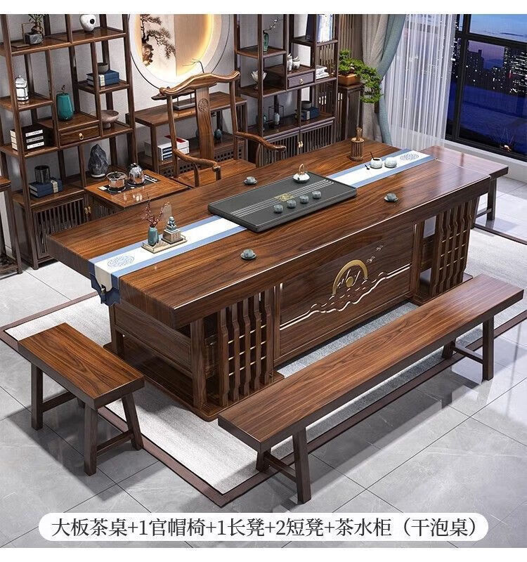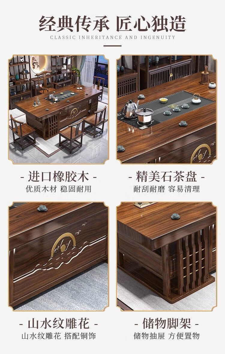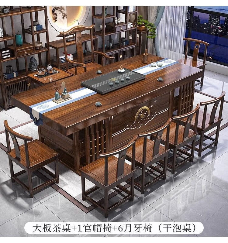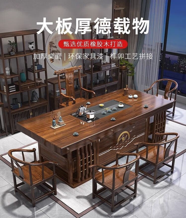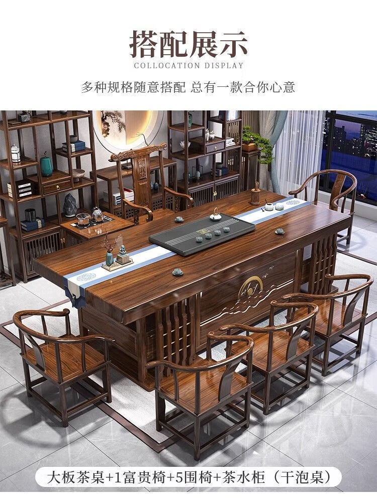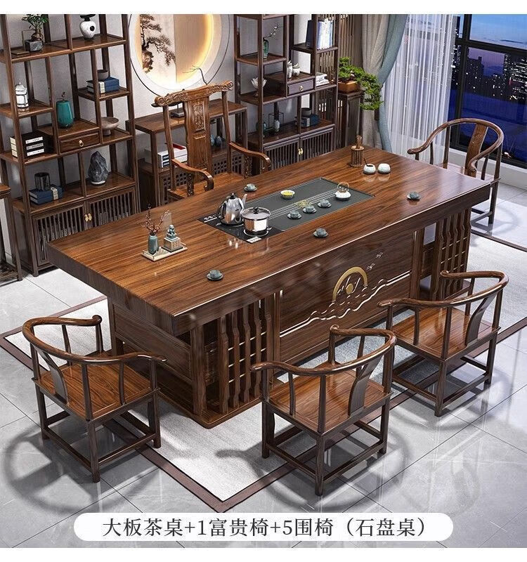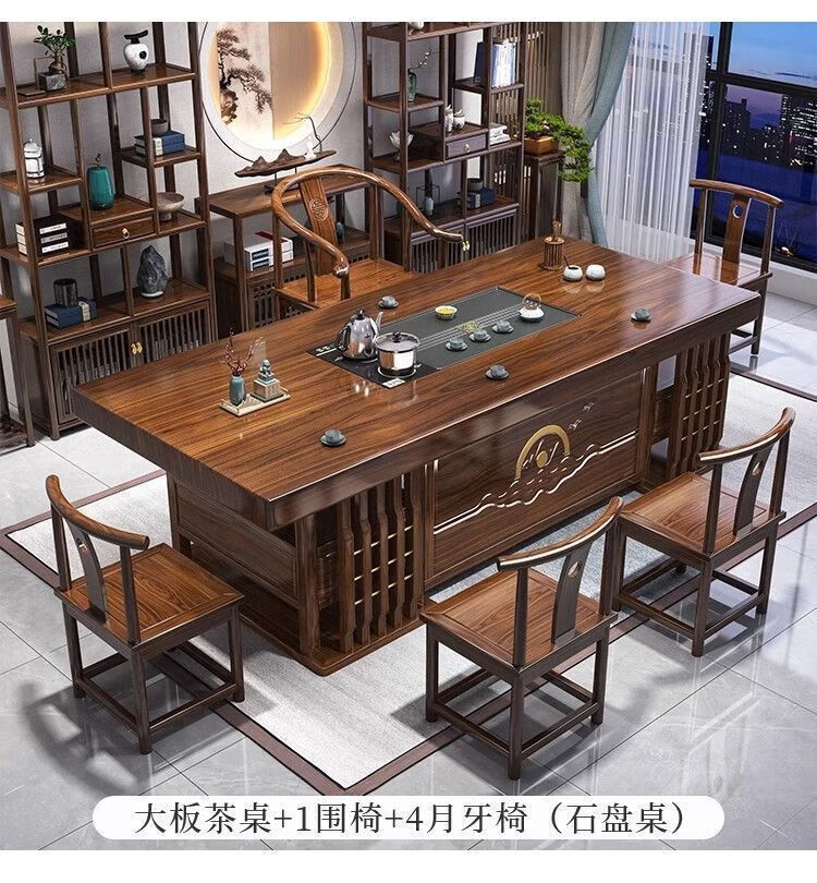 New Chinese style solid wood large board tea table and chair combination, a complete set of home storage tea table, office tea making table, 1.6 meters lucky stone plate style 1 surround chair 4 crescent chairs