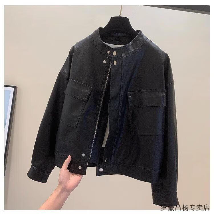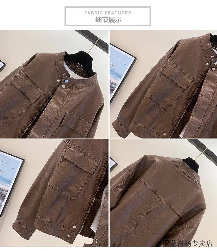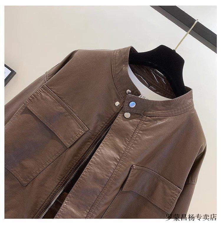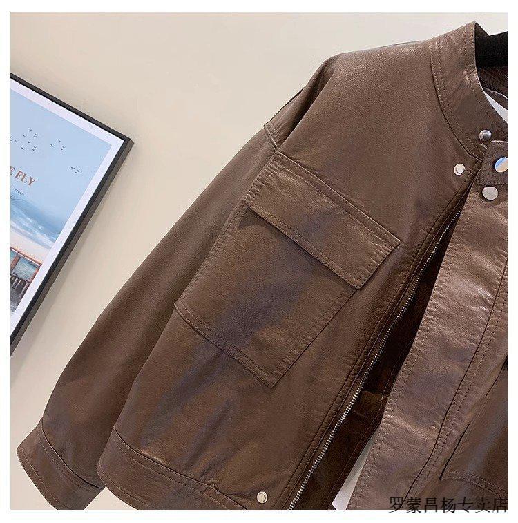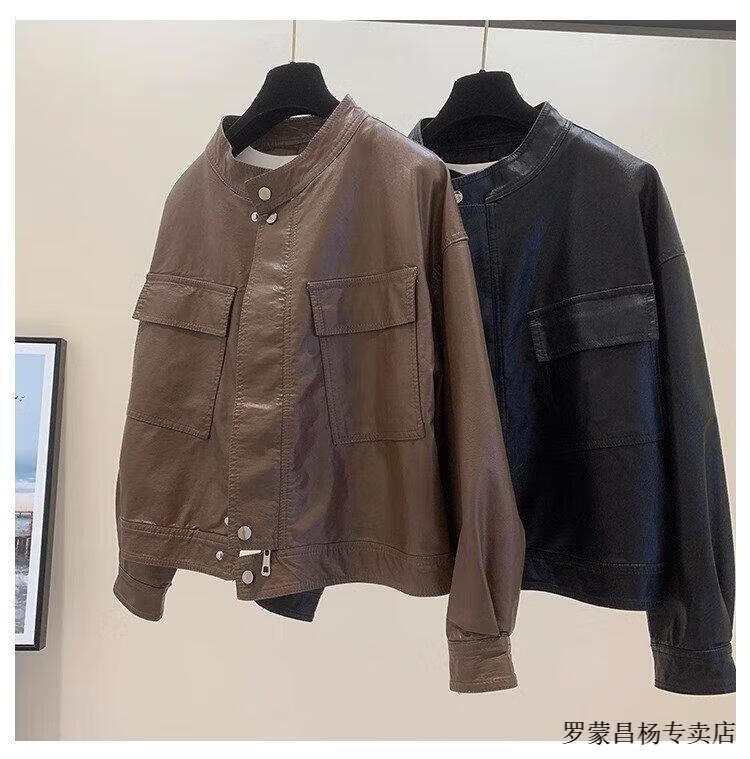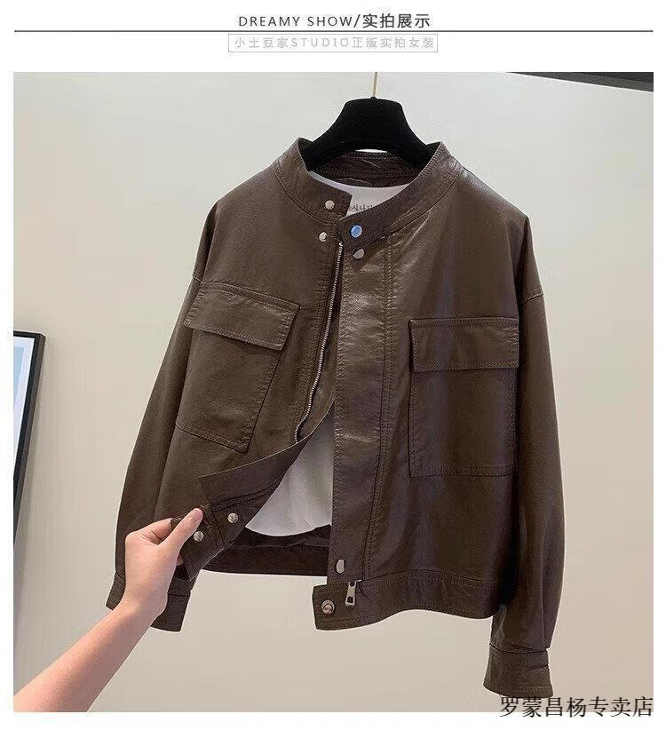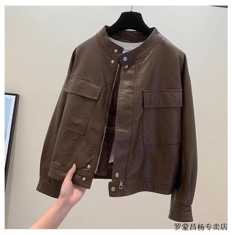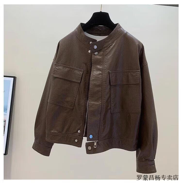 Luo Meng Fashion Motorcycle PU Leather Jacket Women's 2025 Autumn New Retro Design Top Versatile Short Leather Jacket Coat Brown M Recommendation 100-110Jin Jin is equal to 0.5 kg