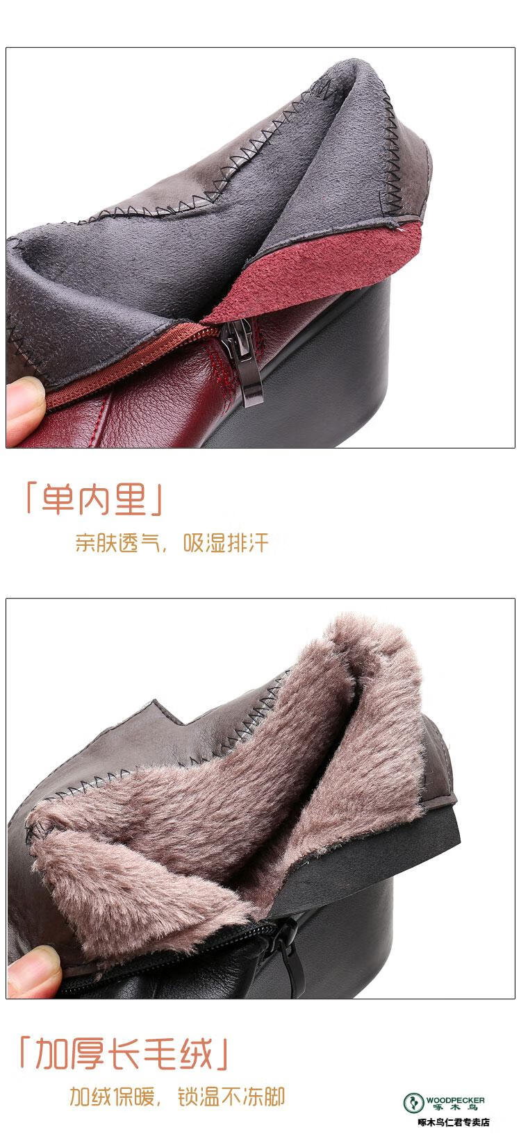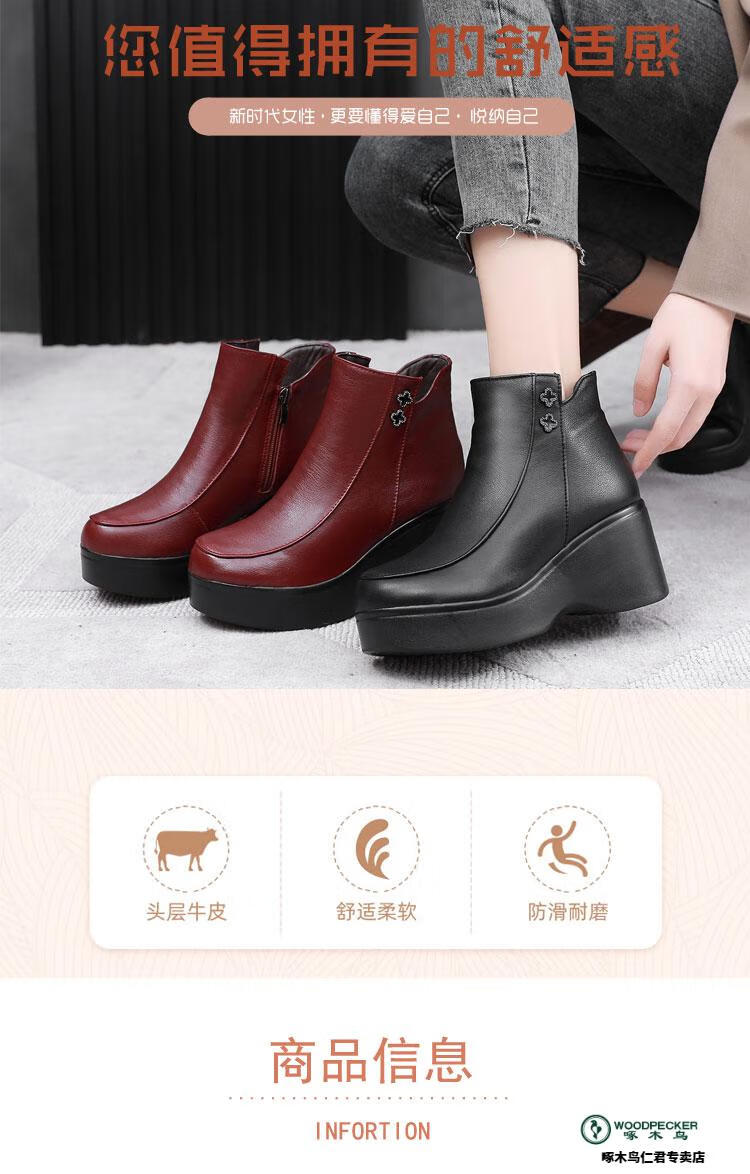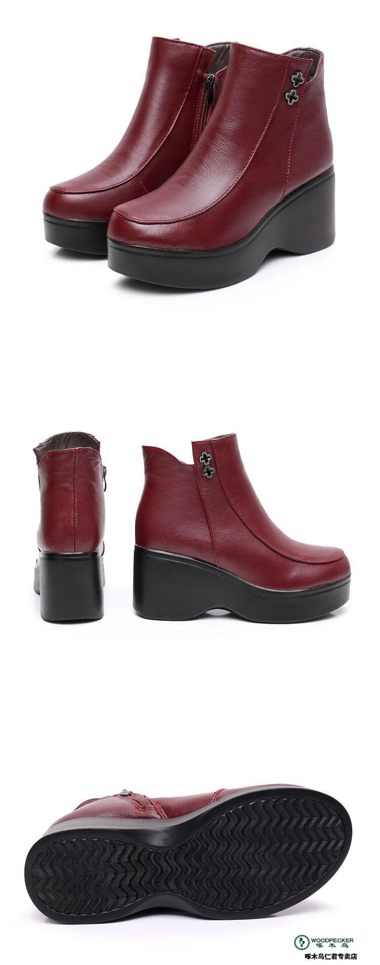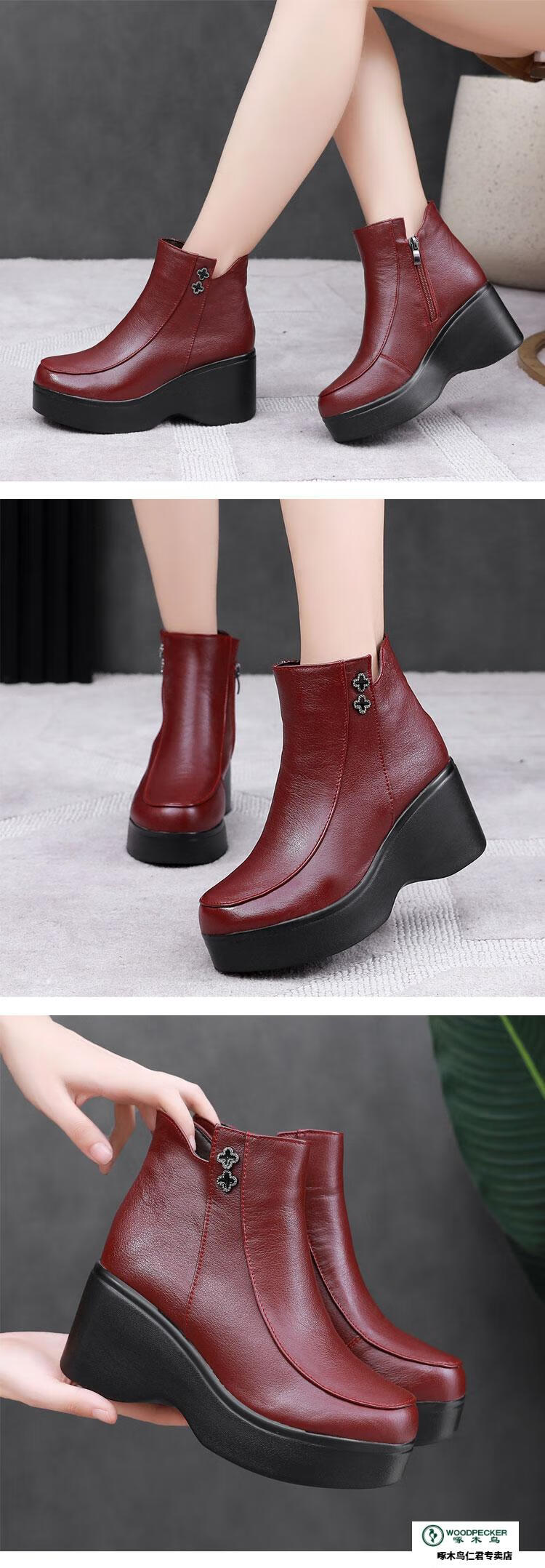 Woodpecker 2026 Autumn and Winter Women's Boots Red Ethnic Style Short Boots Mother's Cotton Boots Thick-soled Platform Heel Wedge Genuine Leather Women's Cotton Shoes Burgundy Cotton Boots 37