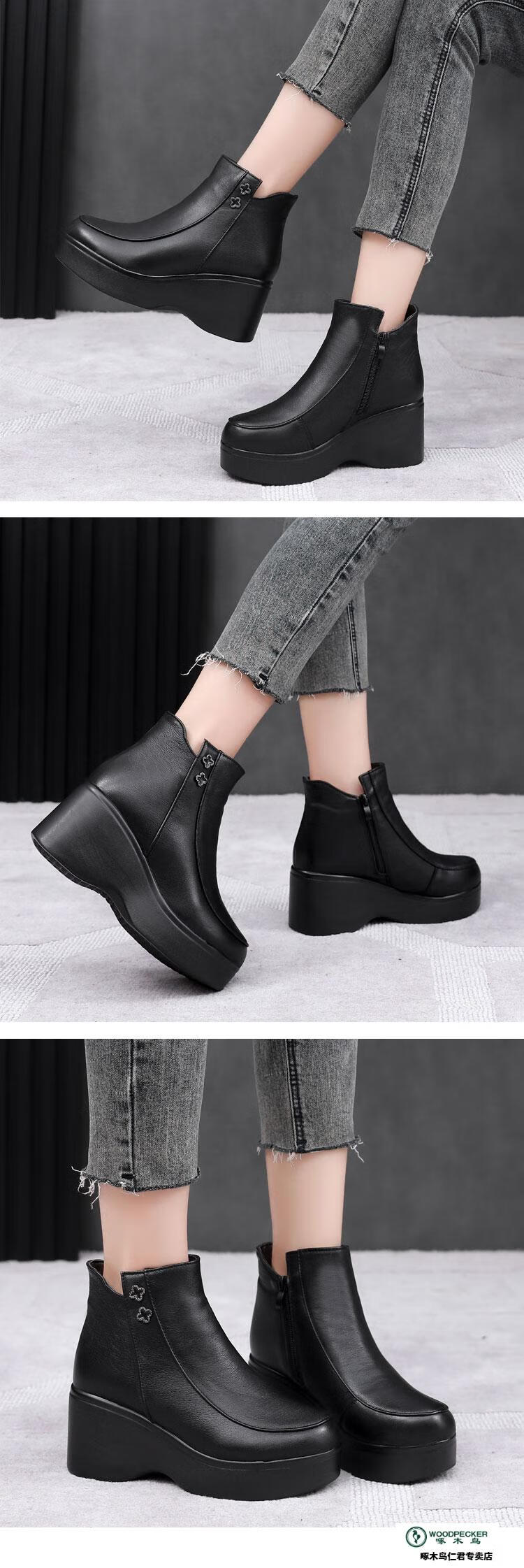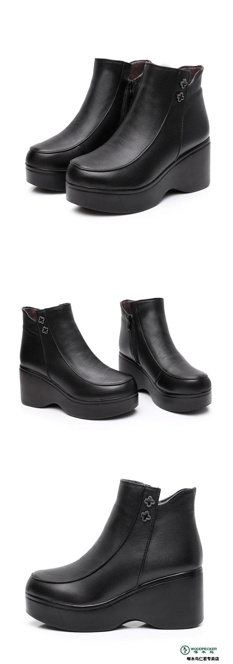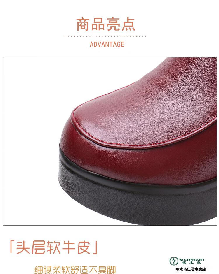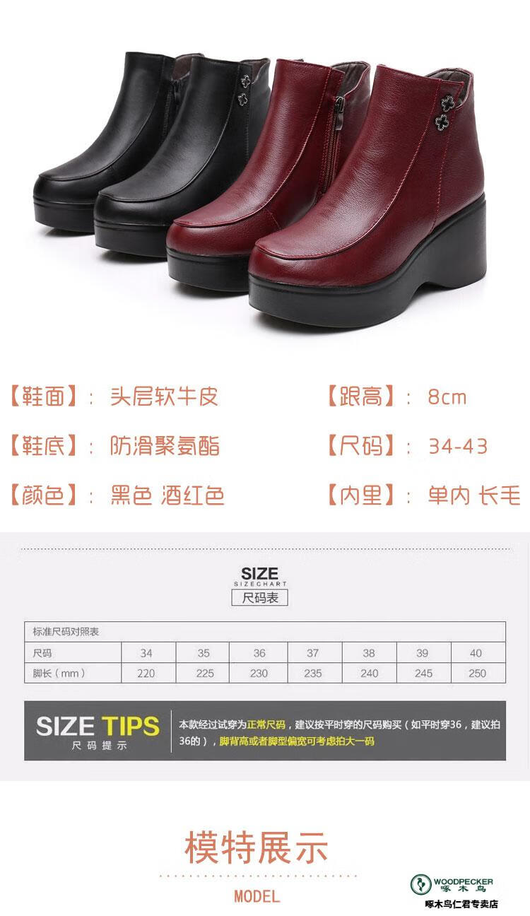 Woodpecker 2026 Autumn and Winter Women's Boots Red Ethnic Style Short Boots Mother's Cotton Boots Thick-soled Platform Heel Wedge Genuine Leather Women's Cotton Shoes Burgundy Cotton Boots 37