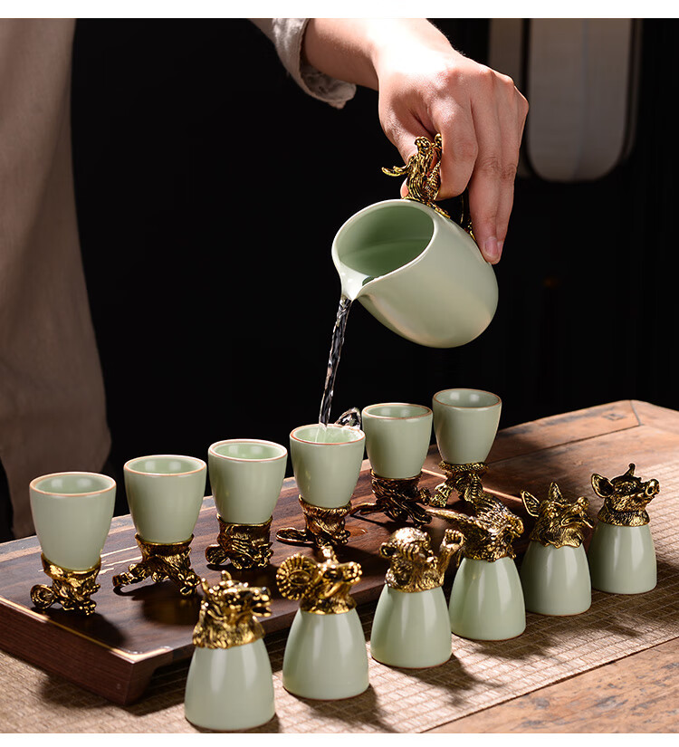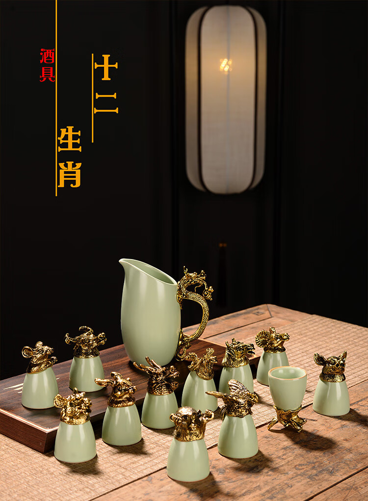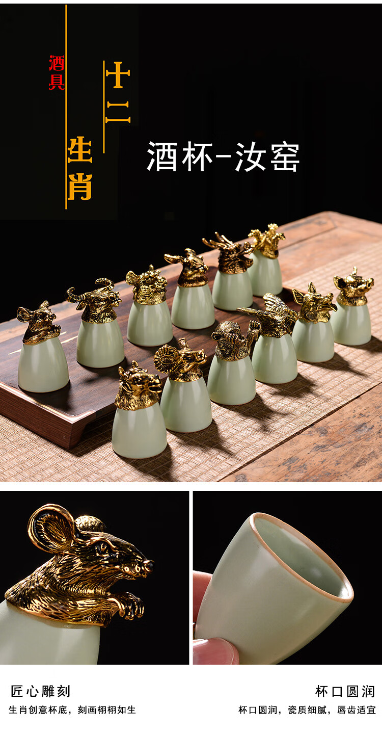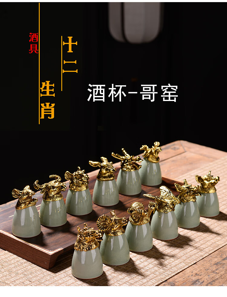 Cup Language (LANGUAGE OF CUP) Twelve Zodiac Ge Kiln Ru Kiln Ceramic Small Wine Glass Wine Set 12 Animal Head Liquor Spirit Cup Chinese Style Household Ge Kiln Complete Set with Fen Liquor (Including Gift Box)