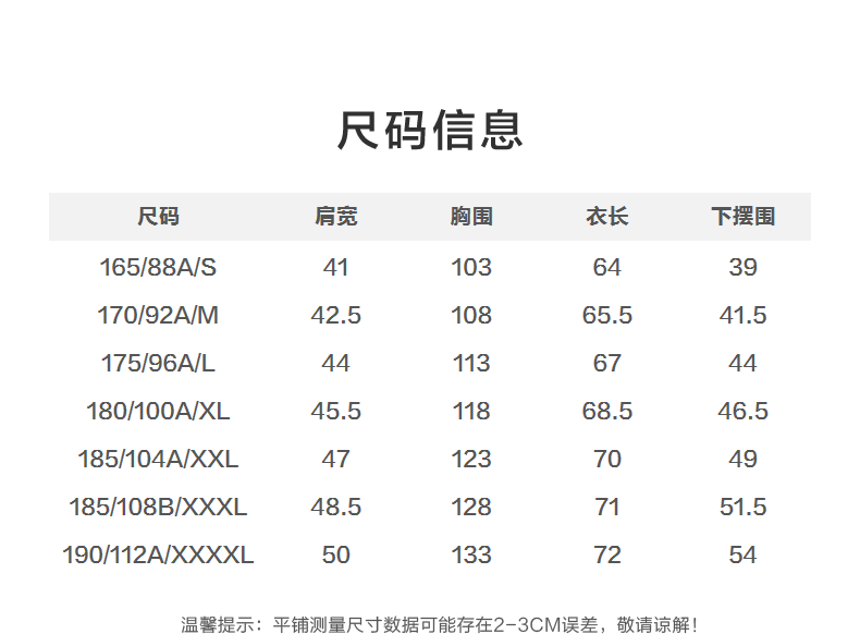 China (cm) 165 / 88-90 170 / 96-98 175 / 108-110 180 / 118-122 185 / 126-130