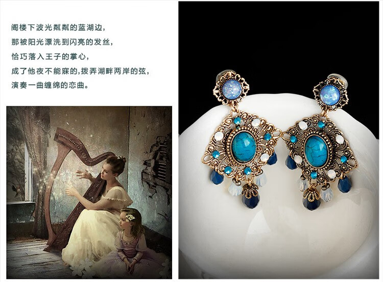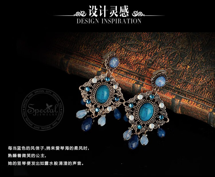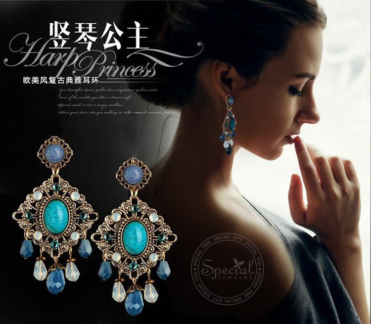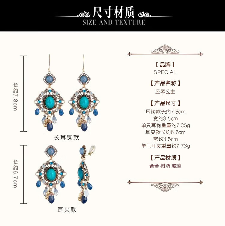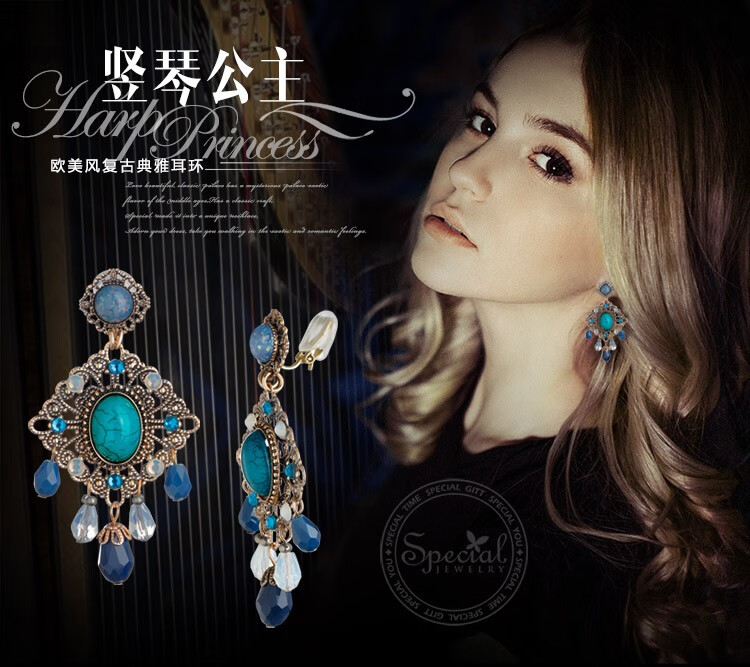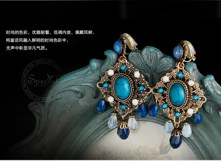 Special European and American retro fashion jewelry non-pierced ear clips women's earrings temperament tassel sweeping shoulders blue non-pierced ear clips