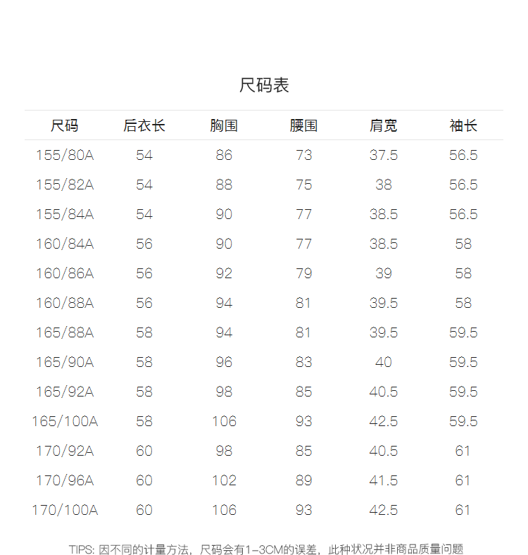 China (cm) 160-165/84-86 165-170 / 88-90 167-172 / 92-96 168-173 / 98-102 170-176 / 106-110