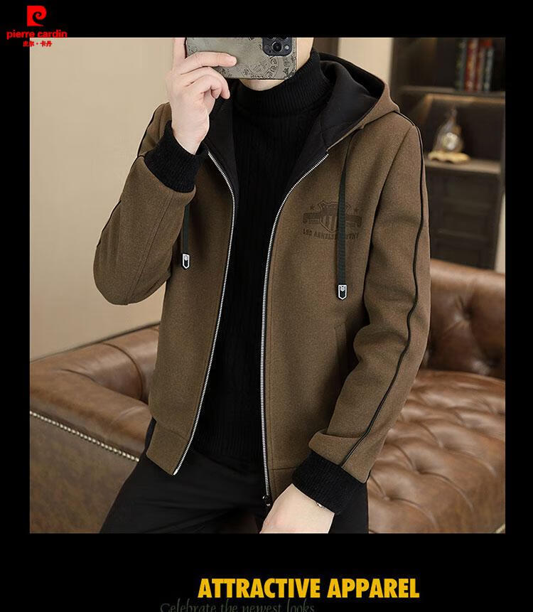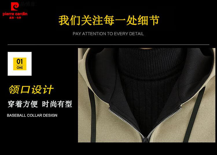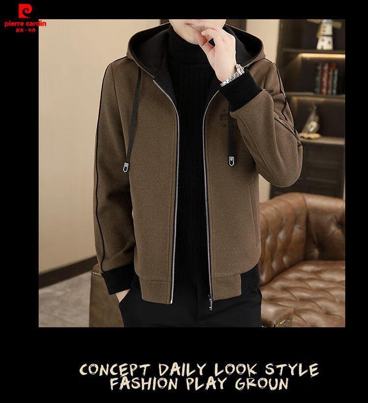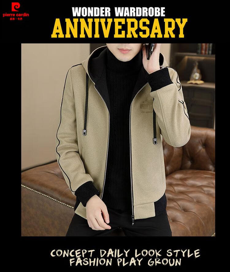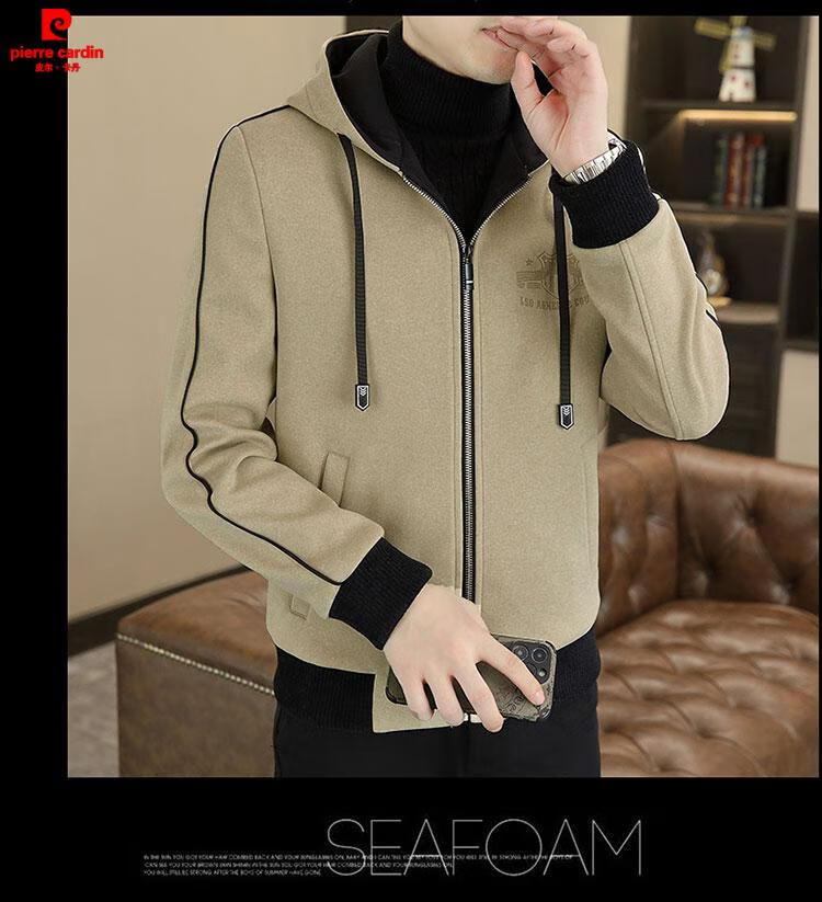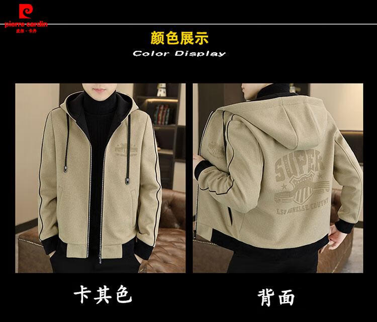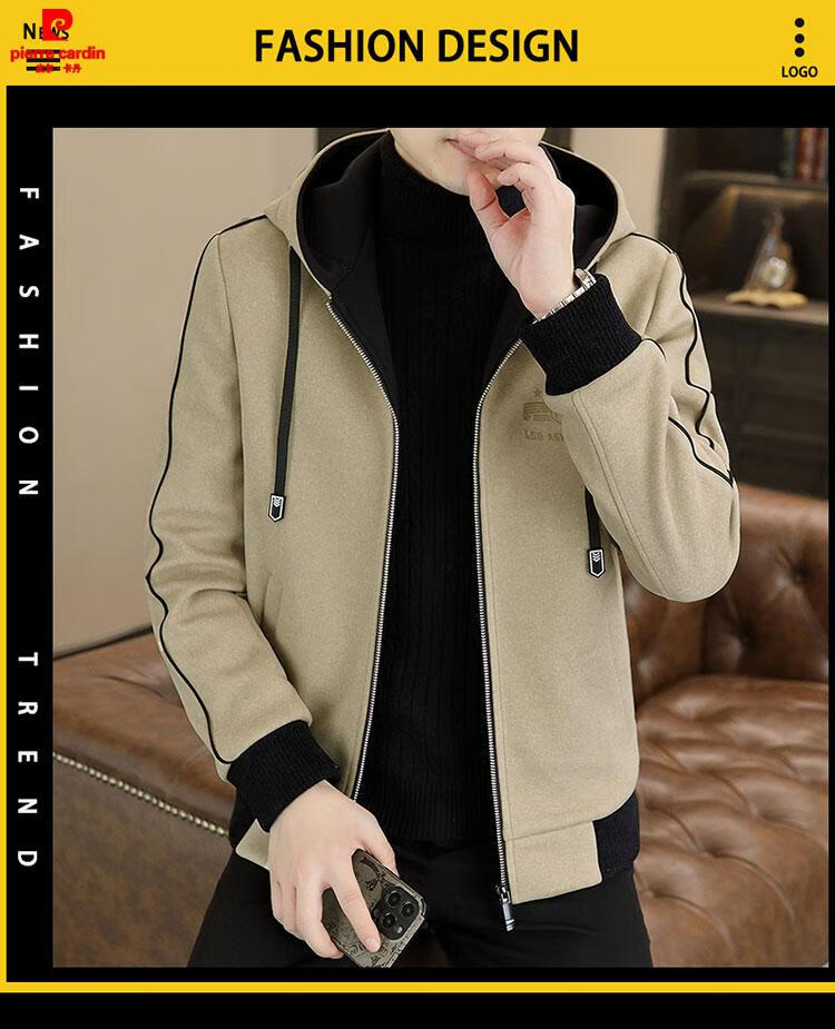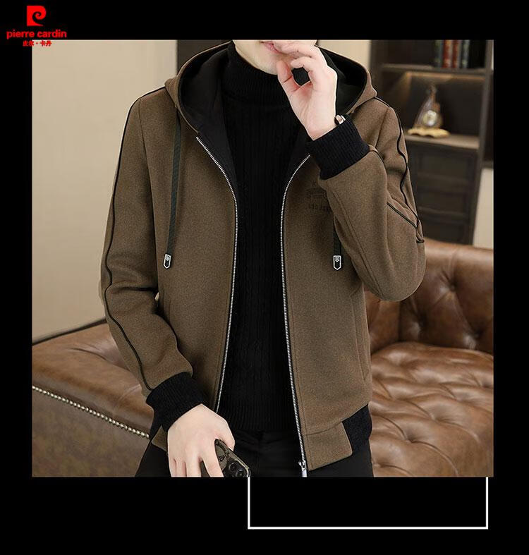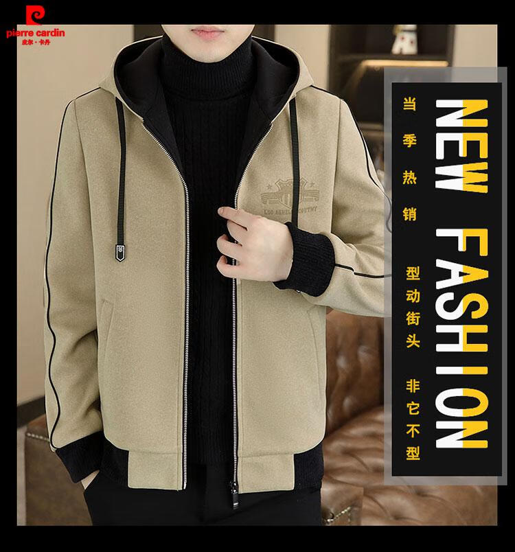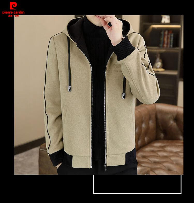 Pierre Cardin high-end woolen coat men's spring and autumn new casual hooded jacket men's winter short woolen coat khaki-regular-M76 XL