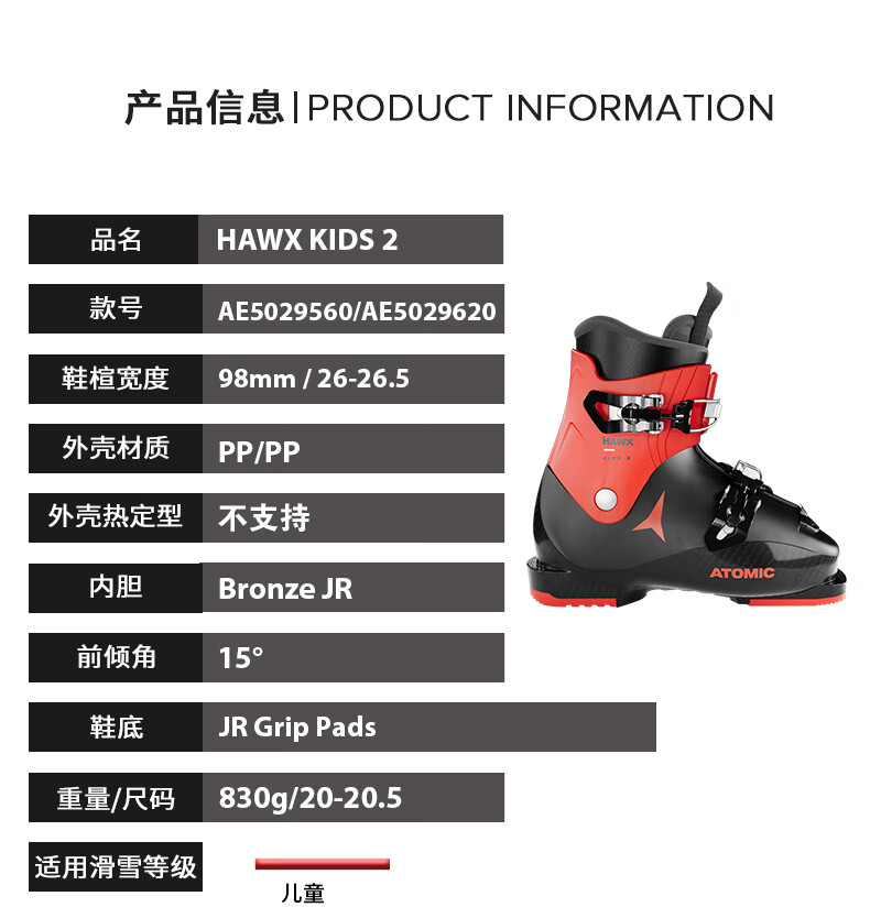 ATOMIC阿托米克儿童滑雪鞋青少年滑雪运动专业装备双板雪鞋 黑红色 *中童*HAWX KIDS 2 19-19.5