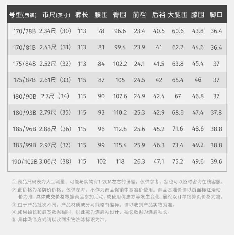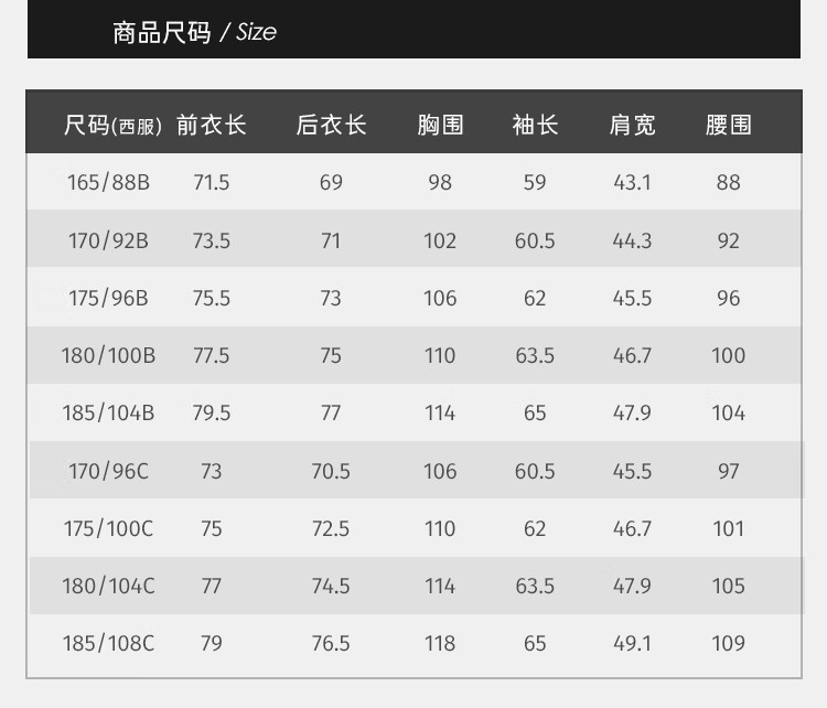 China (cm) 160-165/84-86 165-170 / 88-90 167-172 / 92-96 168-173 / 98-102 170-176 / 106-110