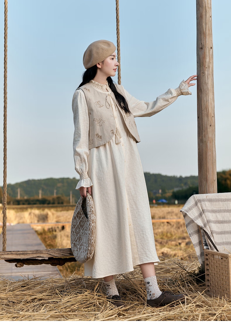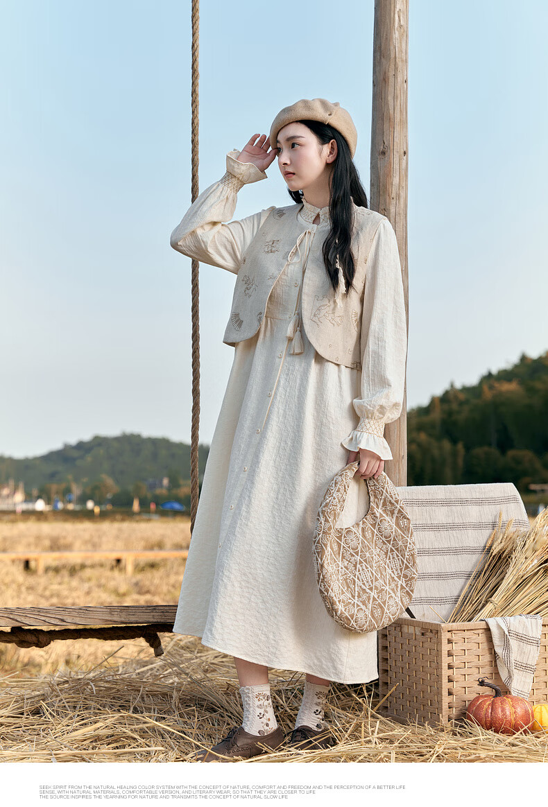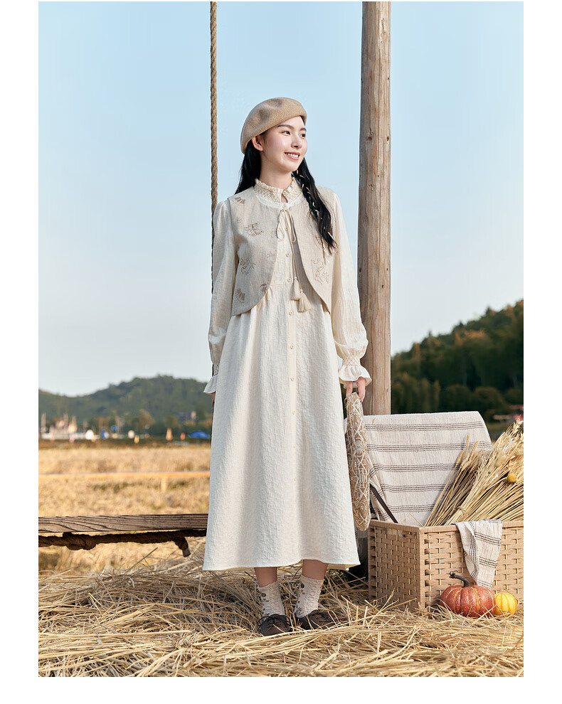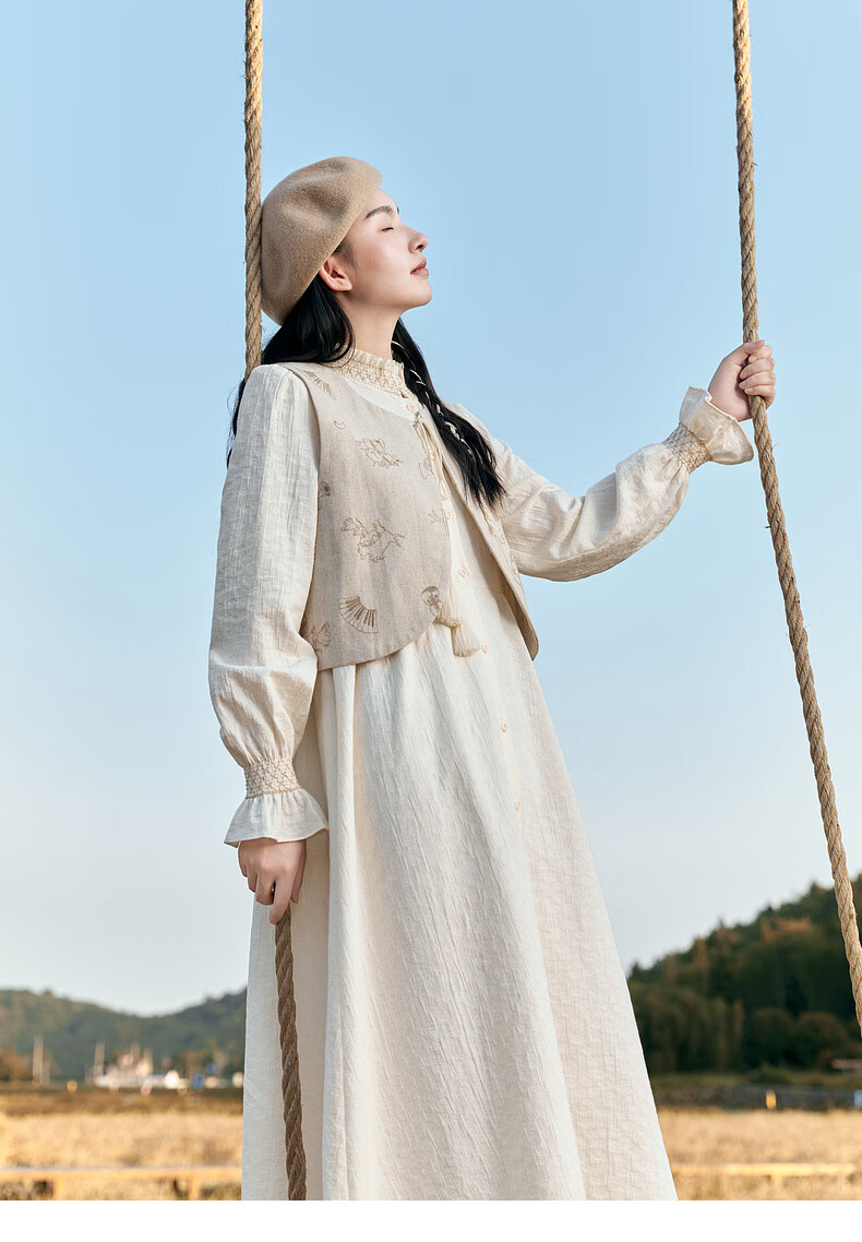 Zihan (ZIHAN) Zihan Japanese embroidered vest, stand collar, loose shirt dress, two-piece suit for women, autumn, beige S