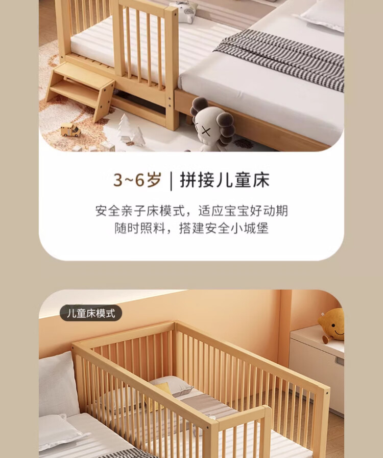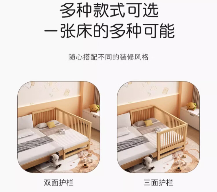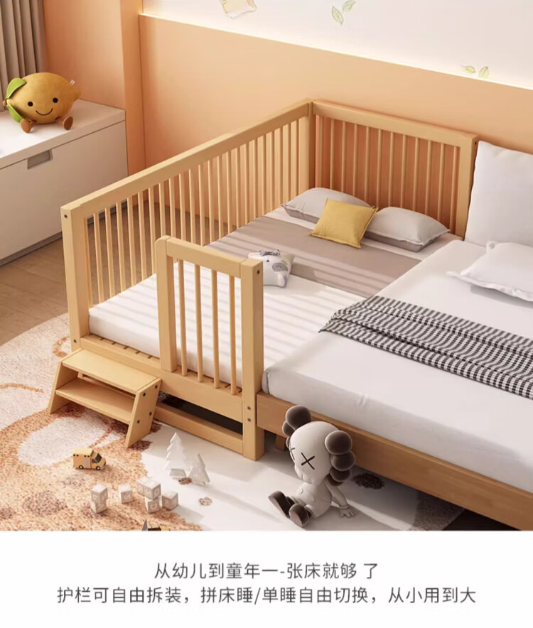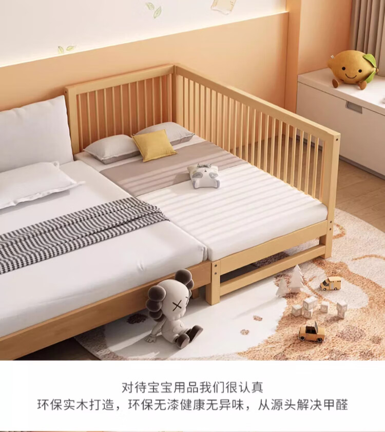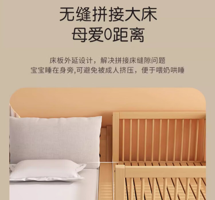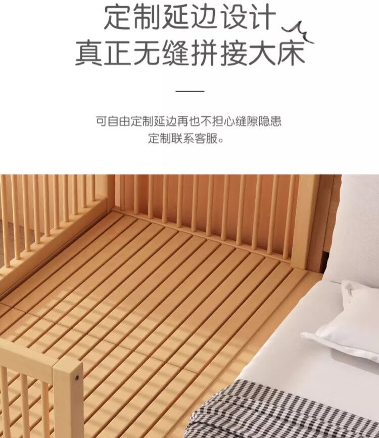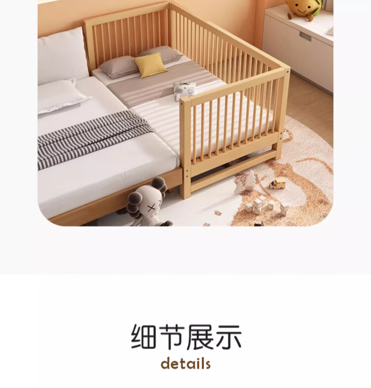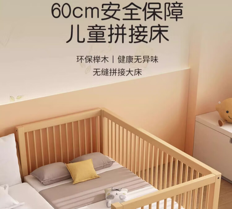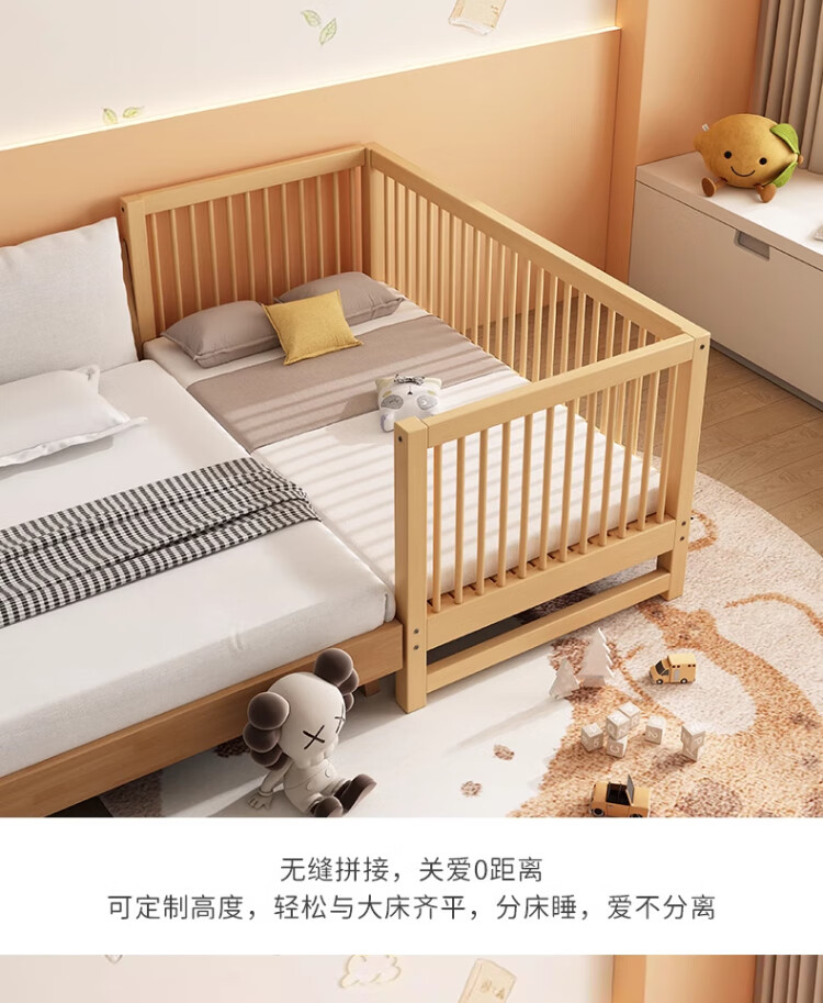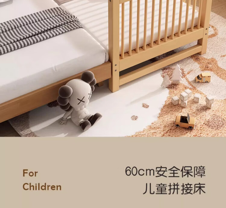 Jiaomei beech children's spliced bed newborn baby widened bedside solid wood seamless splicing large bed extra bed flat bed three-sided guardrail (log) 9cm coconut palm mattress + latex 180x60cm