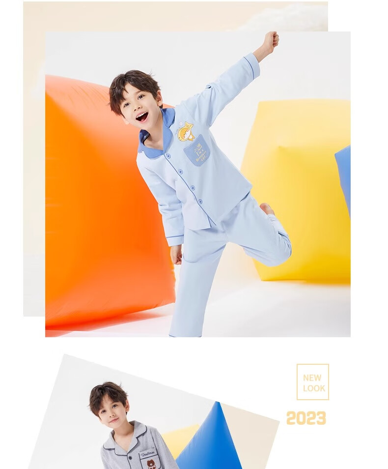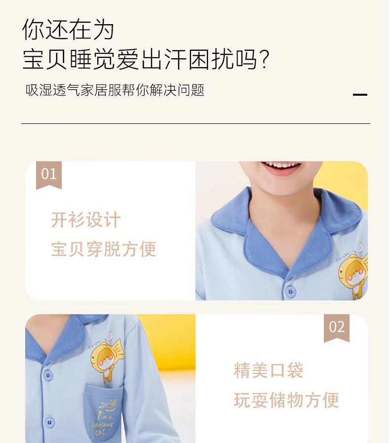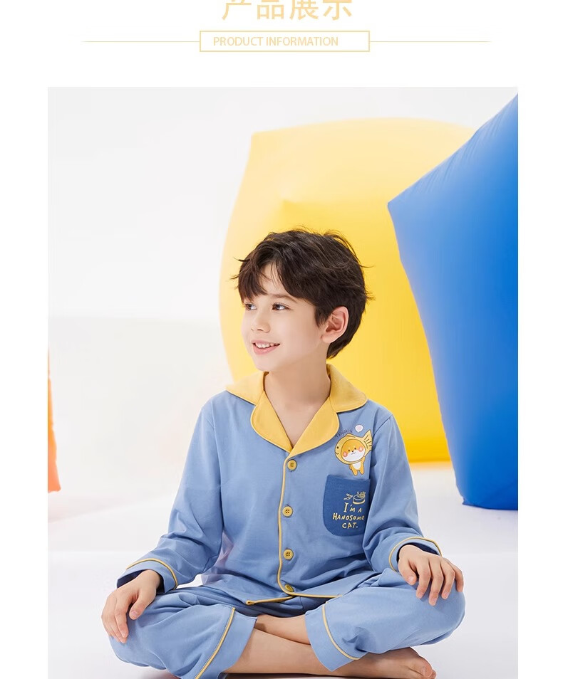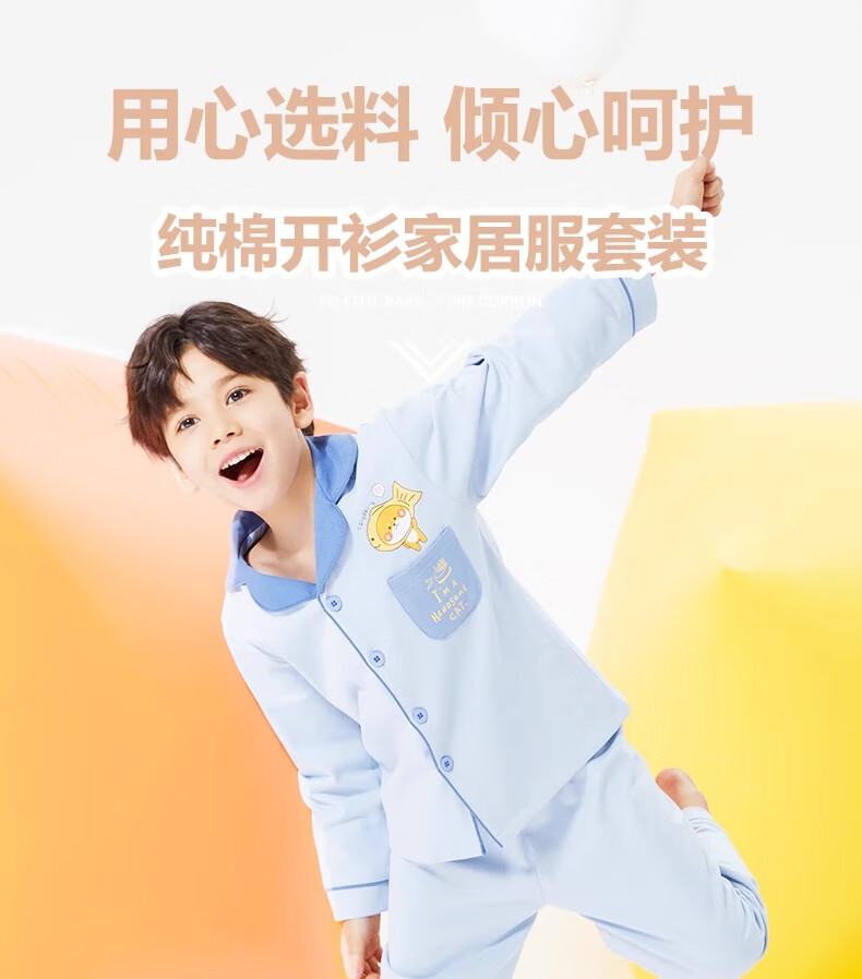 Catman children's pajamas, boys' pure cotton long-sleeved suit, autumn and winter style, medium and large children's cardigan, boy's cotton, can be worn outside the house, cat fish light blue pure cotton two-piece suit 160 Height 141-150丨70-93Jin Jin is equal to 0.5 kg