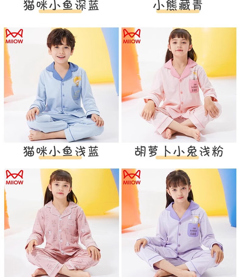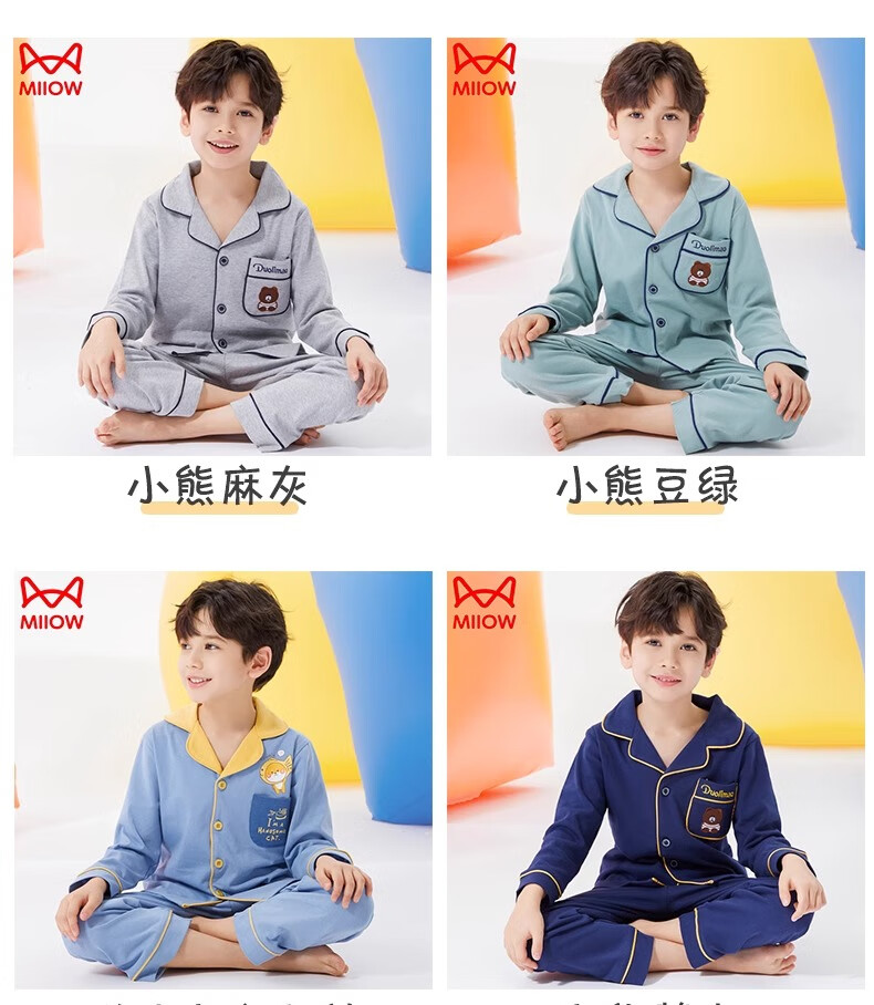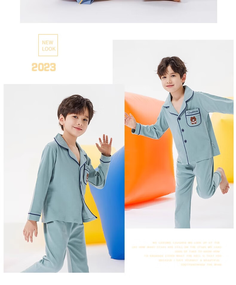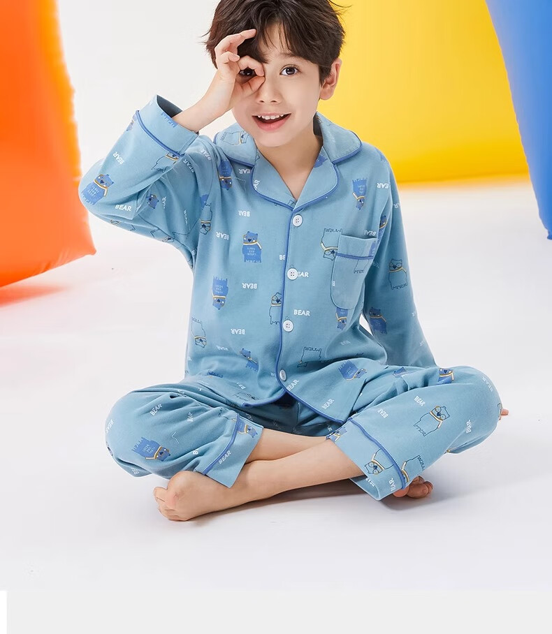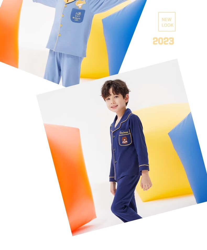 Catman children's pajamas, boys' pure cotton long-sleeved suit, autumn and winter style, medium and large children's cardigan, boy's cotton, can be worn outside the house, cat fish light blue pure cotton two-piece suit 160 Height 141-150丨70-93Jin Jin is equal to 0.5 kg