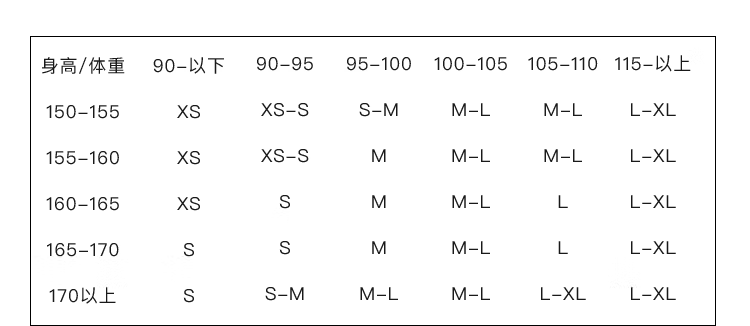 China (cm) 160-165/84-86 165-170 / 88-90 167-172 / 92-96 168-173 / 98-102 170-176 / 106-110