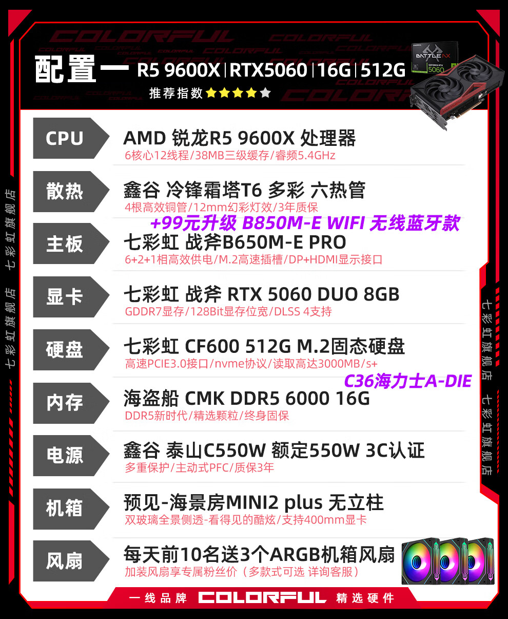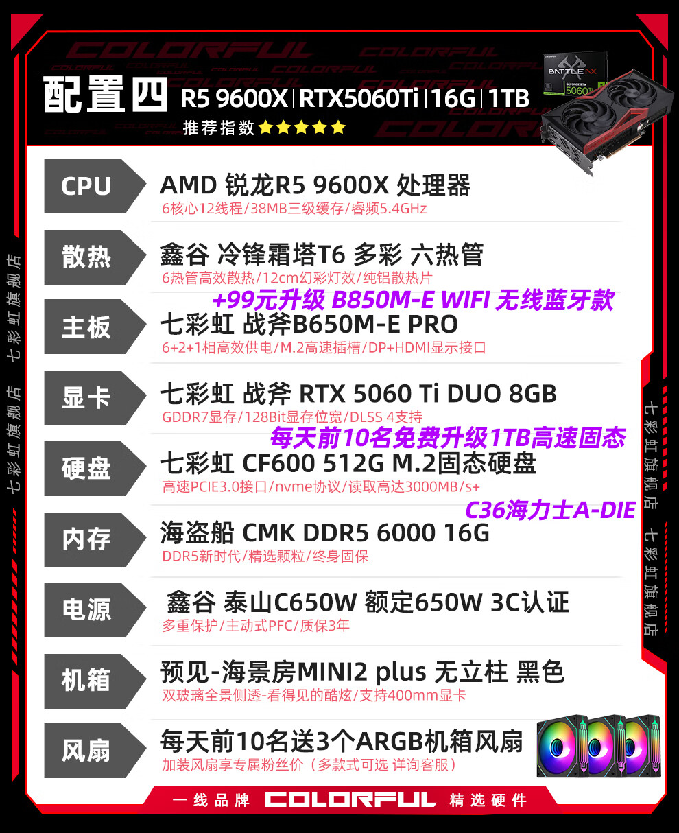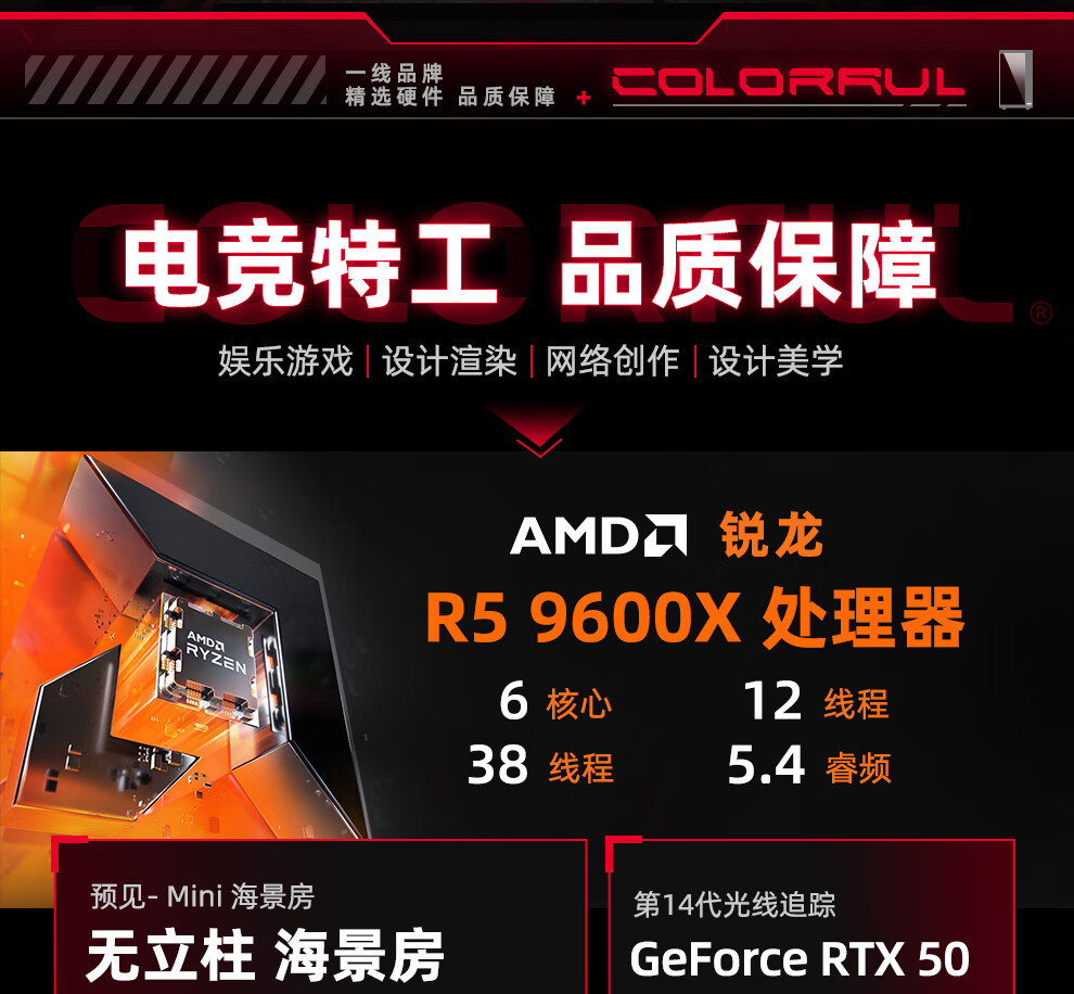 Colorful sea view room AMD Ryzen R5 9600X RTX5060TI/5070TI graphics card E-sports game design office computer host desktop assembly machine with two R5 9600X丨16G丨1TB丨5060 graphics card original box