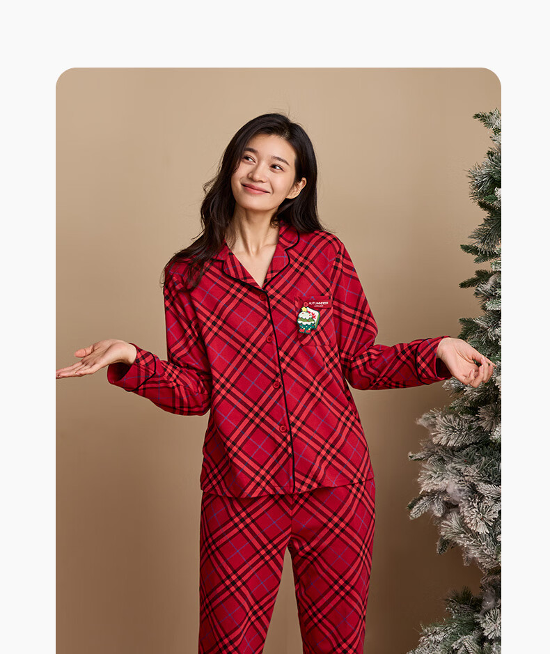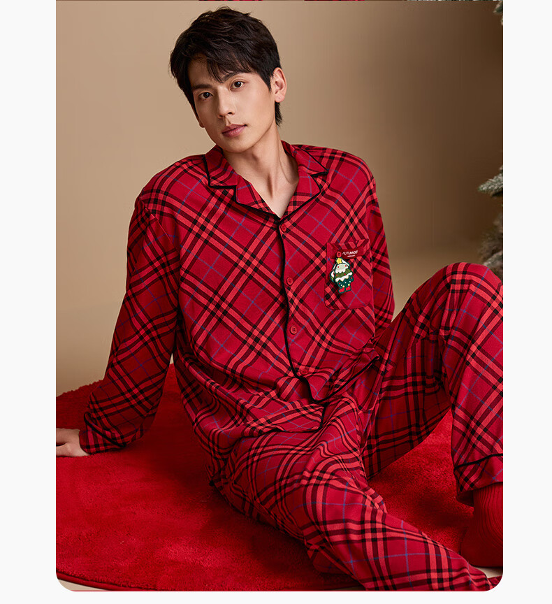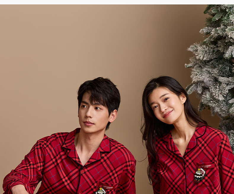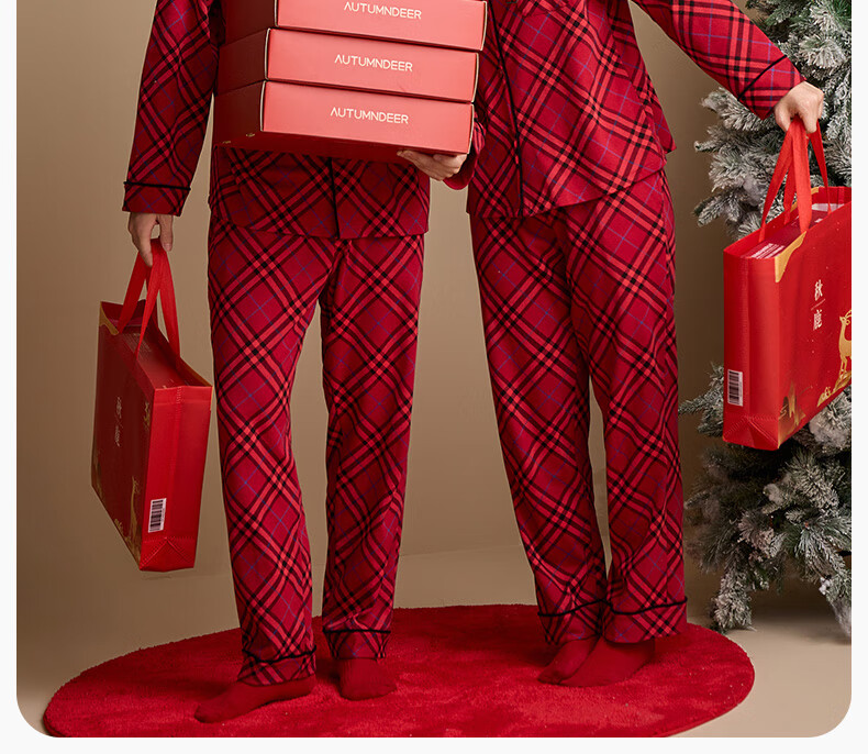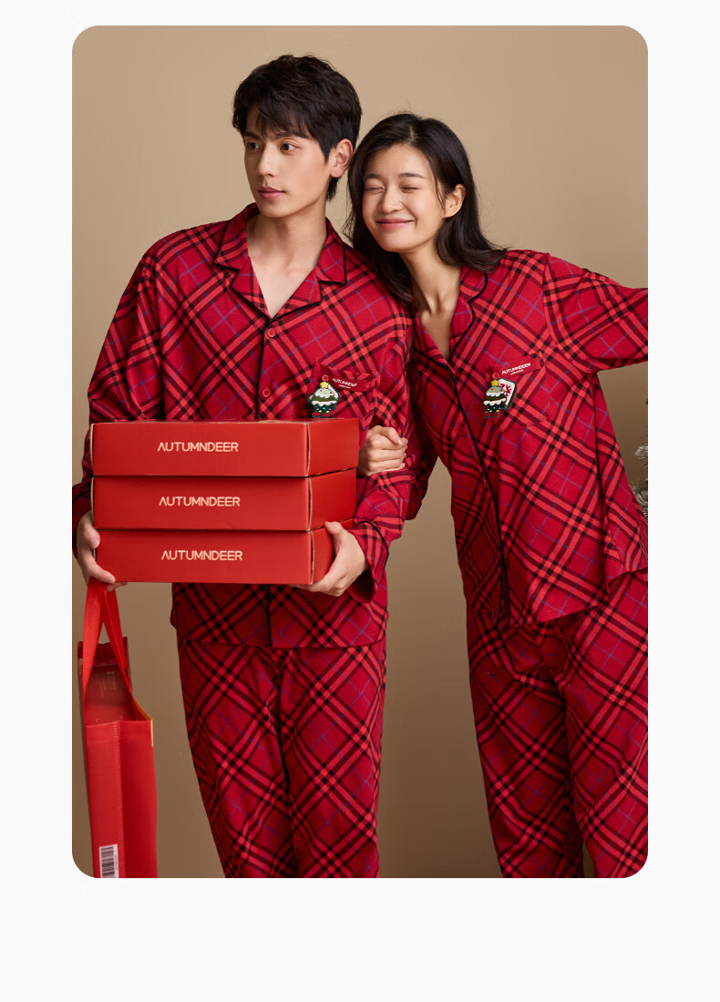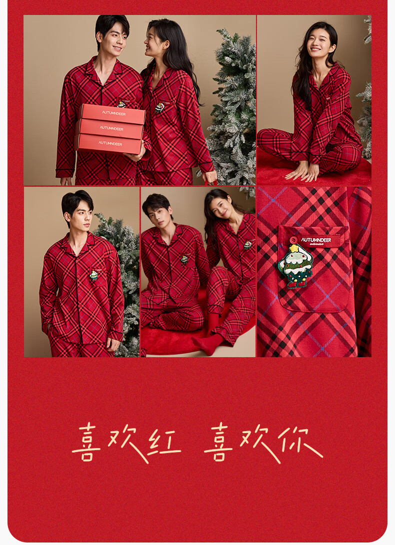 Autumn Deer Couple Pajamas Women Autumn Red Modal Cotton Plaid Cardigan Long Sleeve Men Wedding Home Clothes Suit New Year Gift Big Red Women (01) M