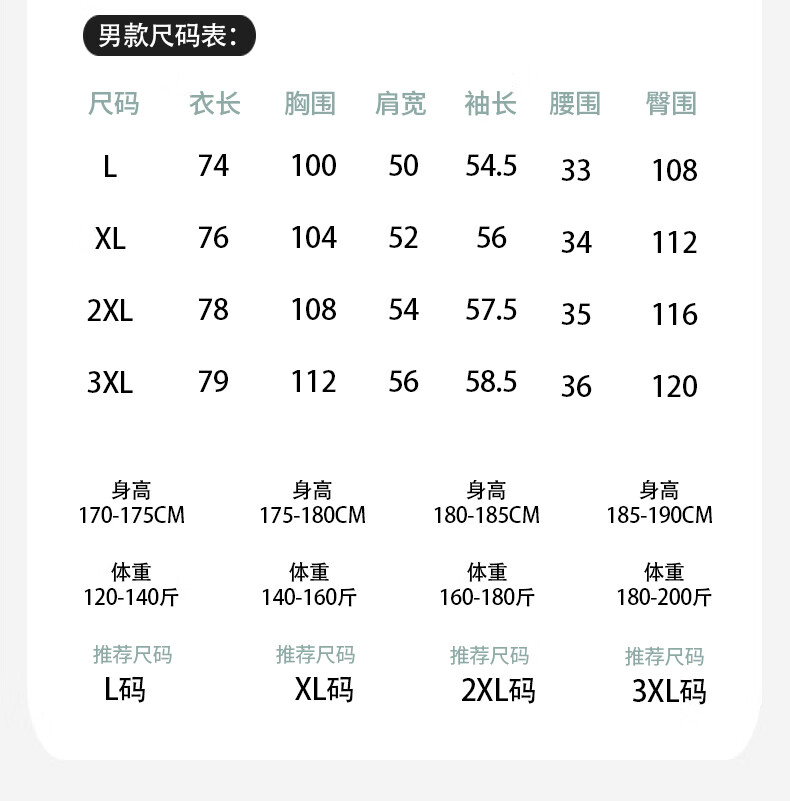 China (cm) 165 / 88-90 170 / 96-98 175 / 108-110 180 / 118-122 185 / 126-130