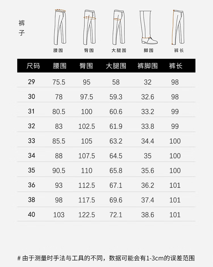 Outseam (cm) 99 cm 101.5 cm 104 cm 106.5 cm 109 cm