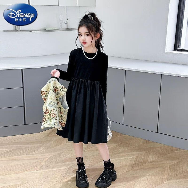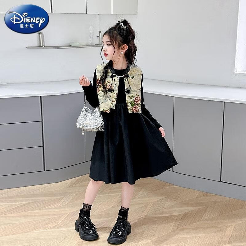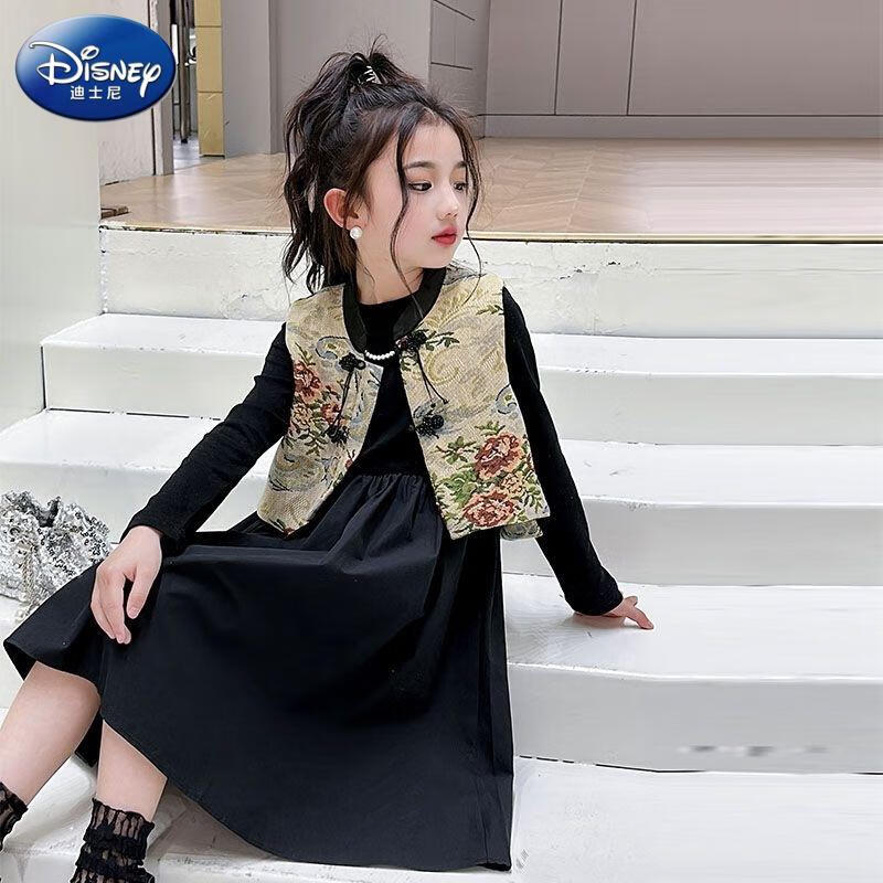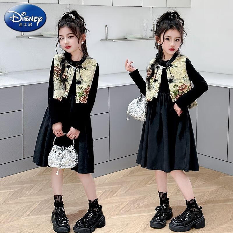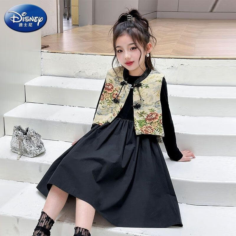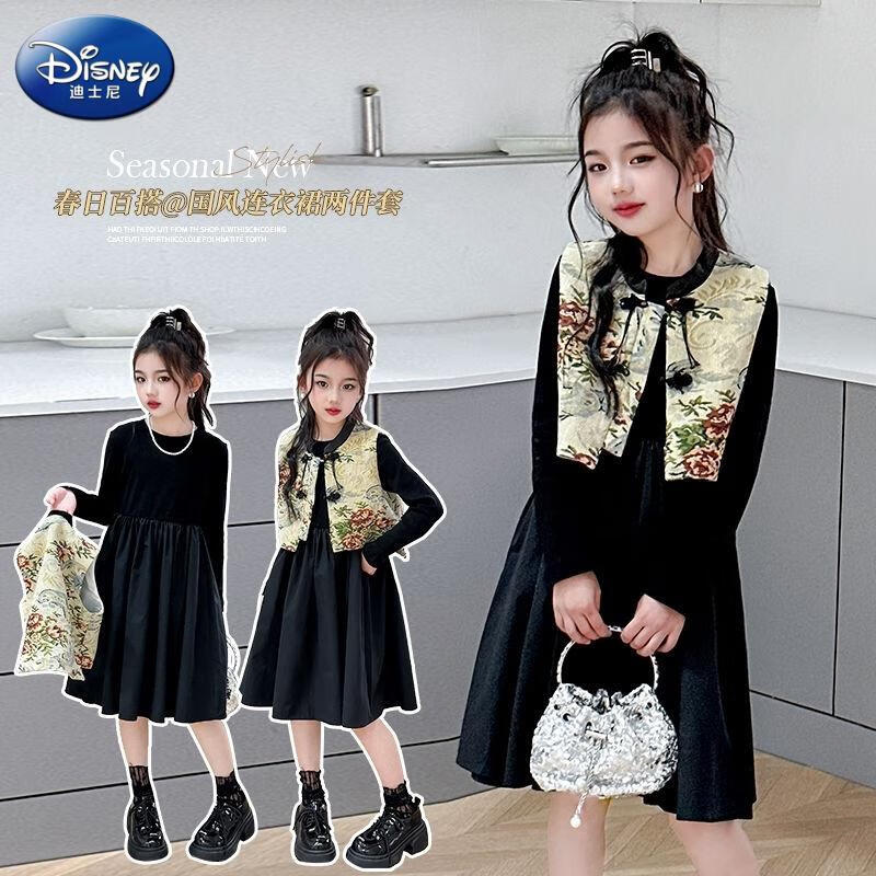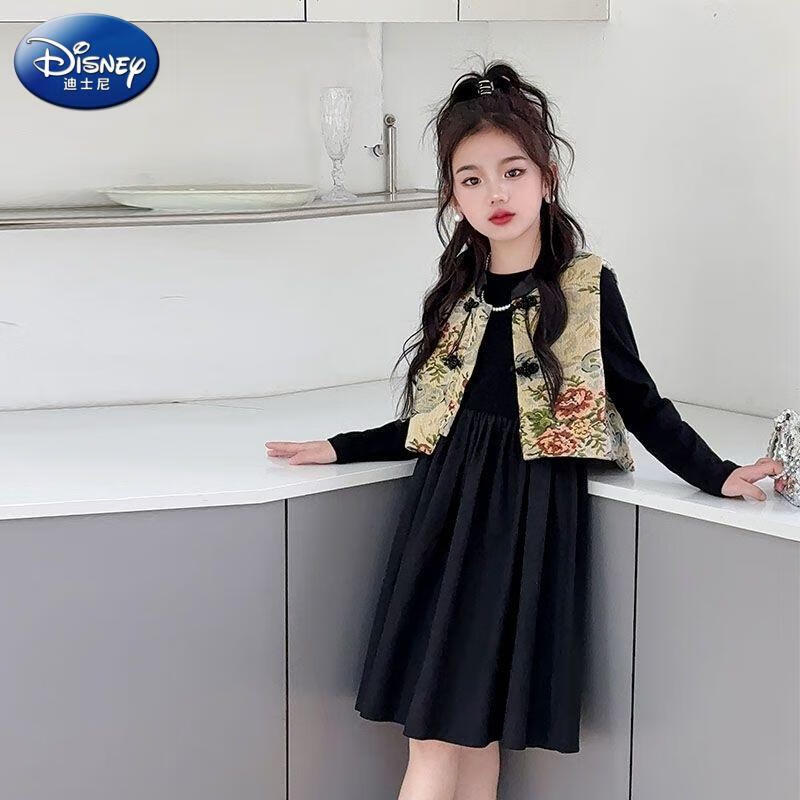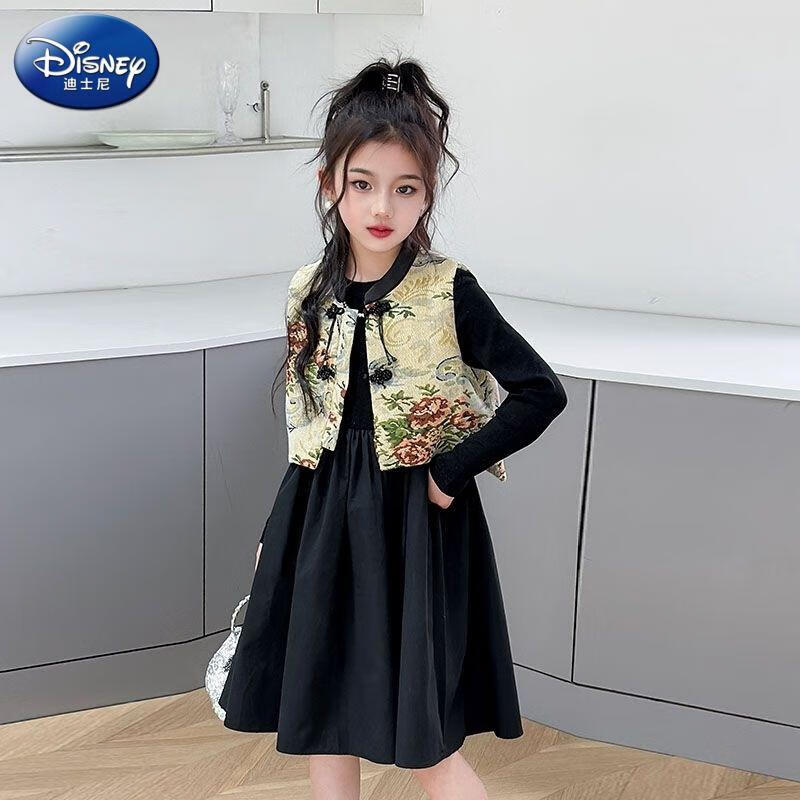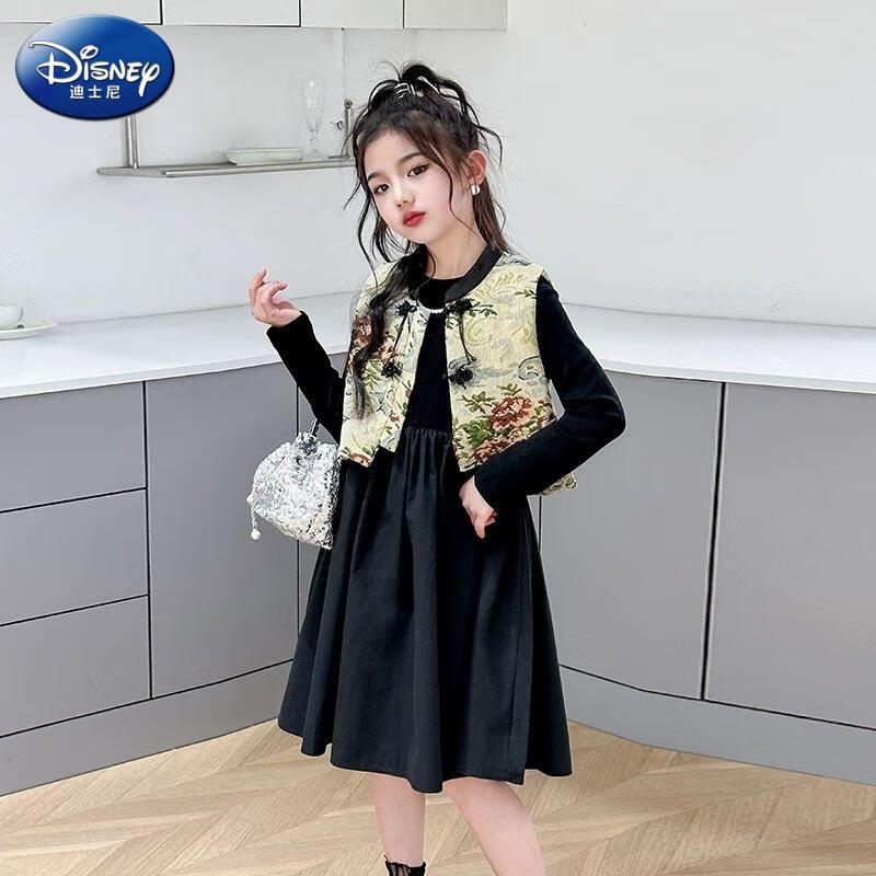Disney Girls' Dress Spring and Autumn Style Children's Western Style Chinese Style Princess Dress Suit Middle and Older Children's Tang Suit Two-piece Trendy Black Suit Vest + Dress 170 Size