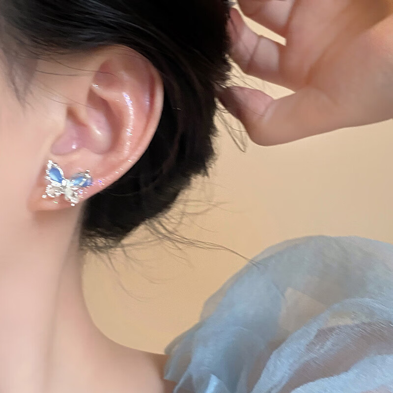S925 Silver Needle Dream Bow Earrings for Women Simple Fairy Earrings Lighter Luxury Earrings Niche Design Earrings Blue Butterfly Earrings