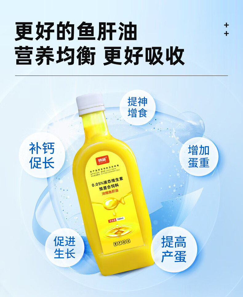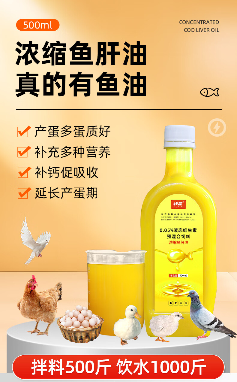Animal husbandry concentrated cod liver oil for chickens, ducks, geese and pigeons to supplement multivitamin, mineral and trace element feed additives. Concentrated cod liver oil 500ml/bottle