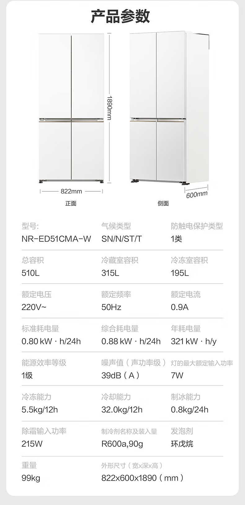 Panasonic's 24-year-old new product Big Seal 2.0 ultra-thin zero-embedded 510-liter large capacity first-class energy efficiency automatic ice making cross-door built-in refrigerator NR-ED51CMA-W NR-ED51CMA-W 510L condensed white