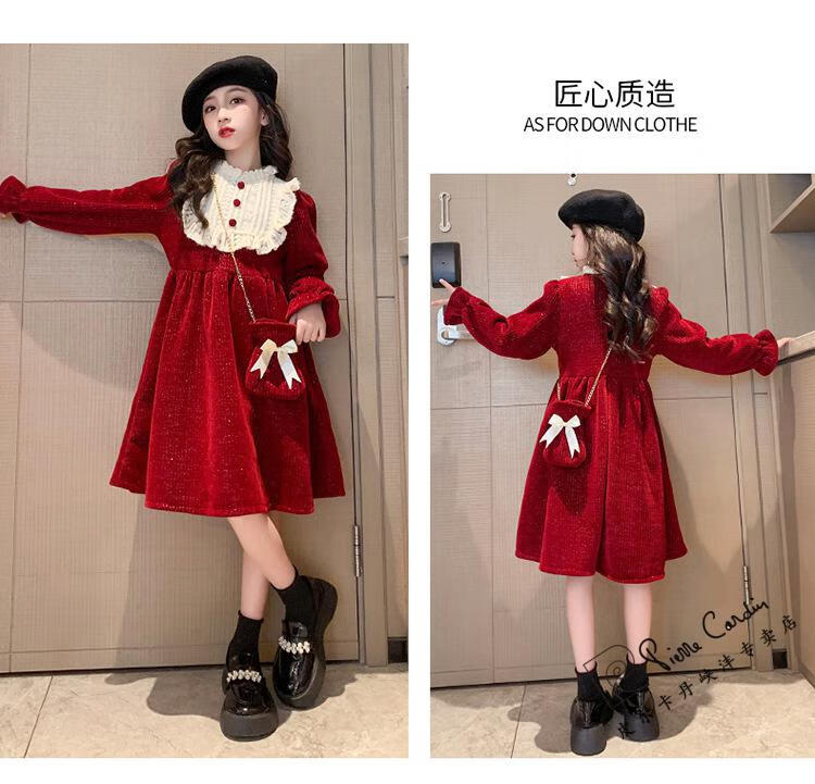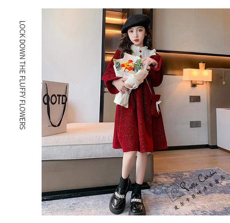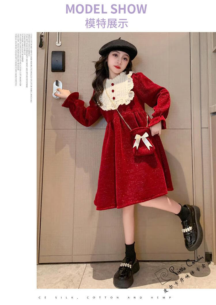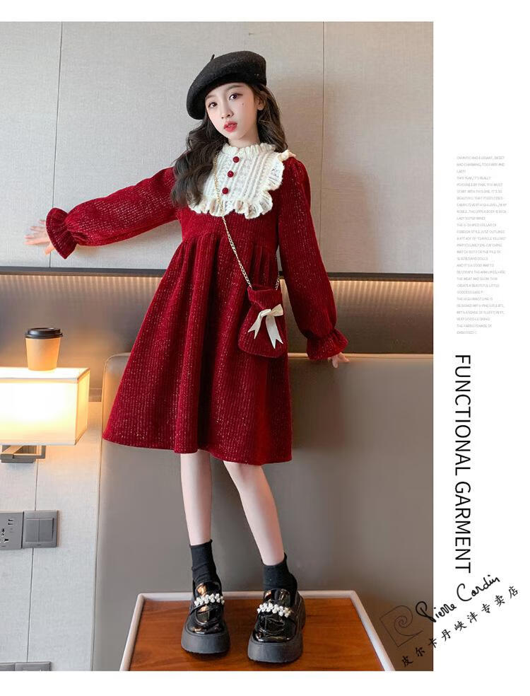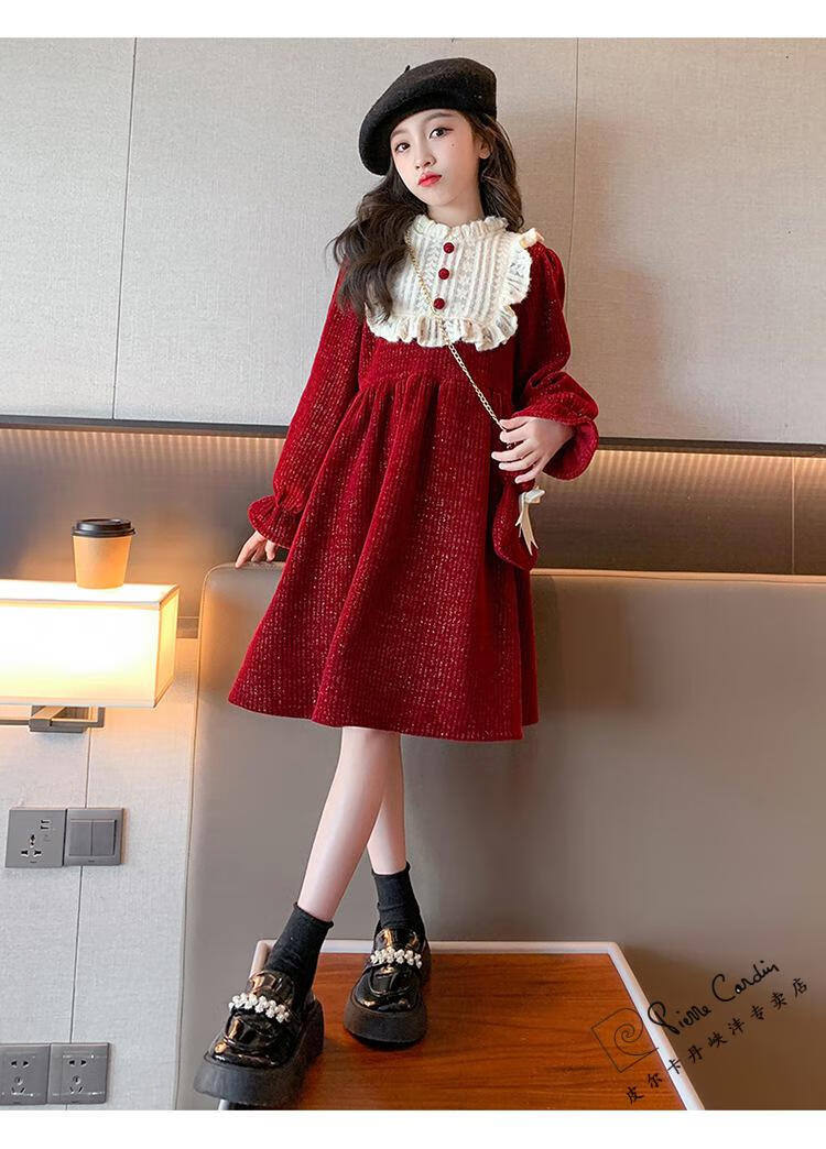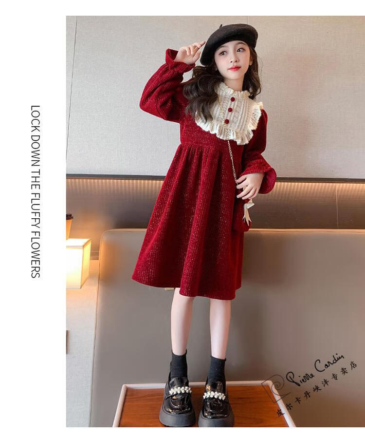 Pierre Cardin Girls' Autumn and Winter Velvet Dress 2025 New Big Children's Winter Thickened Bright Silk New Year's Dress Princess Dress Velvet Skirt Red 150 cm