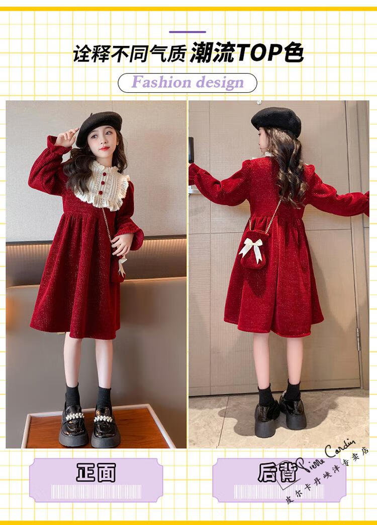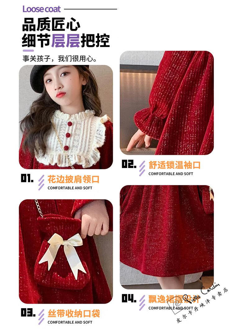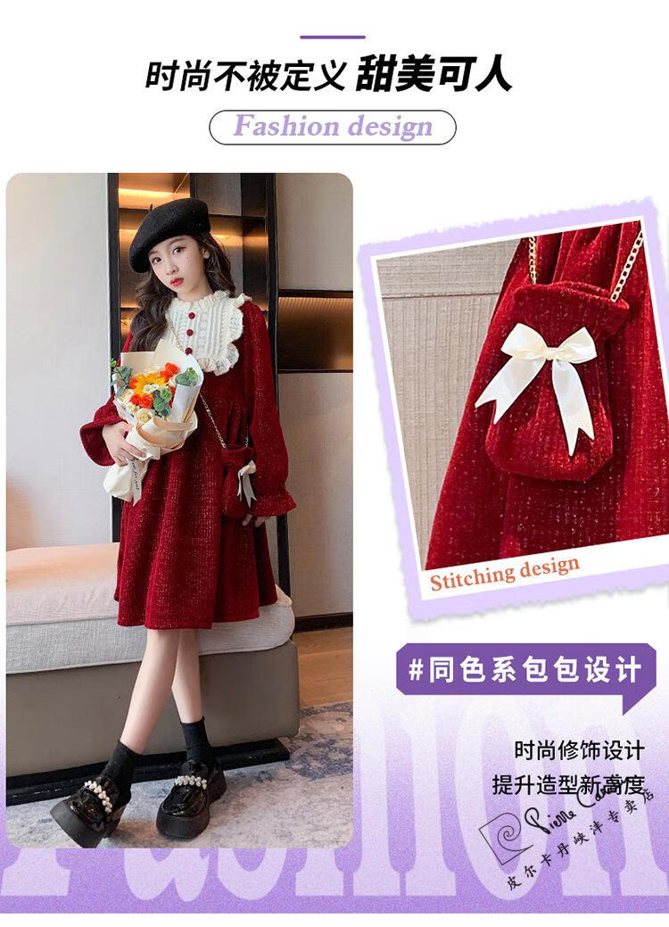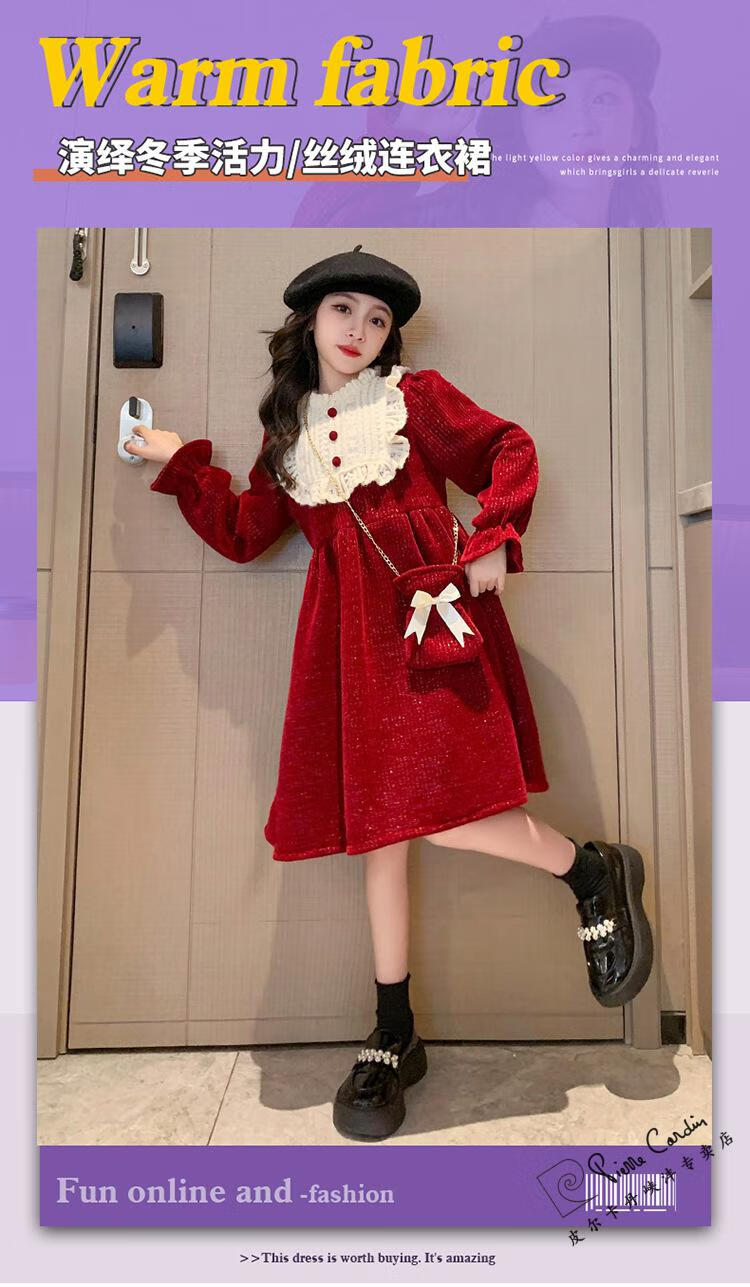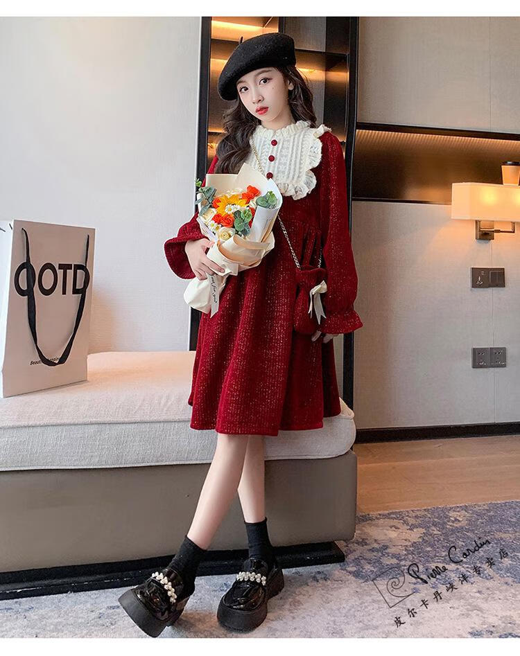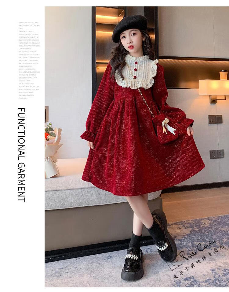 Pierre Cardin Girls' Autumn and Winter Velvet Dress 2025 New Big Children's Winter Thickened Bright Silk New Year's Dress Princess Dress Velvet Skirt Red 150 cm