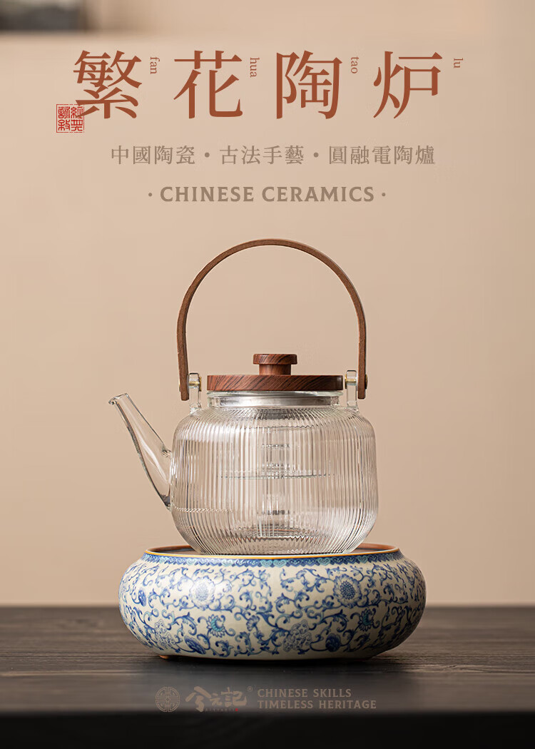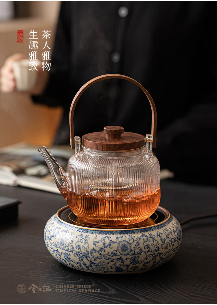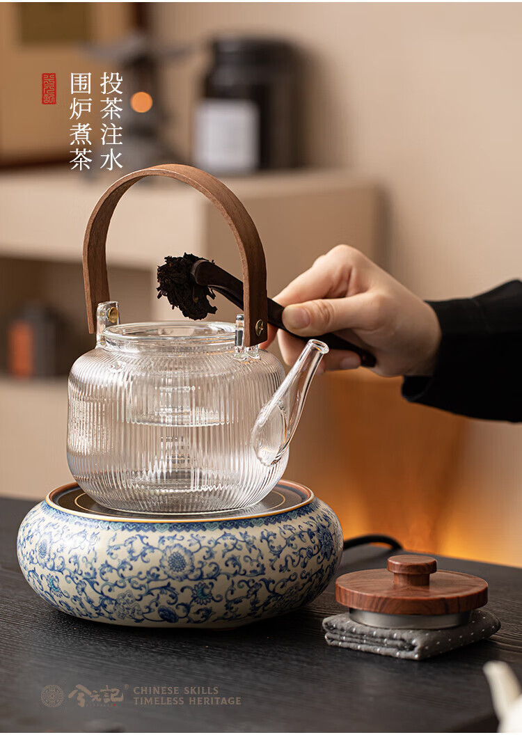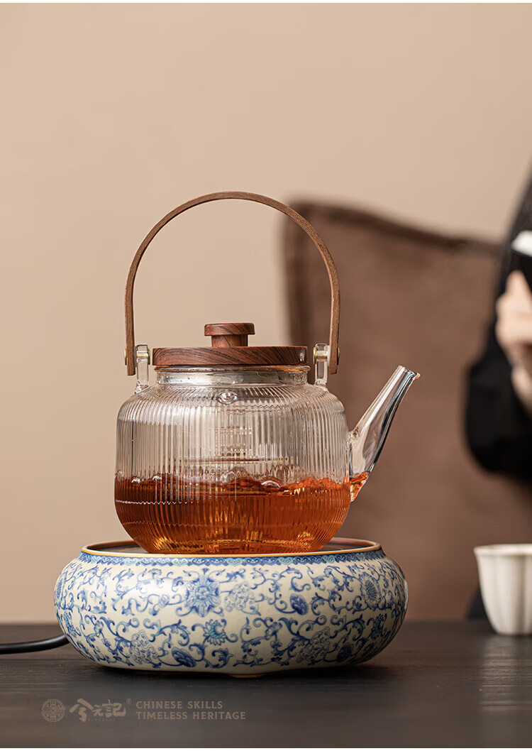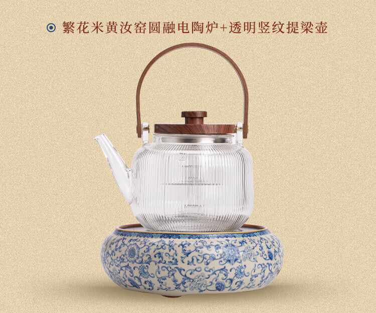 Xi Yuanji blue and white Ru kiln electric pottery stove for tea kettle and stove tea pot household thickened high temperature resistant glass tea kettle and kettle flowery beige Ru kiln round melt electric pottery stove + transparent vertical pattern lifting beam kettle