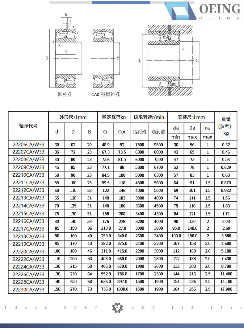 OEING Harbin Bearing 22212 13 22215 22216 22218 22220 double row spherical roller Luo axis LYC 22212C/W33 steel guaranteed straight hole