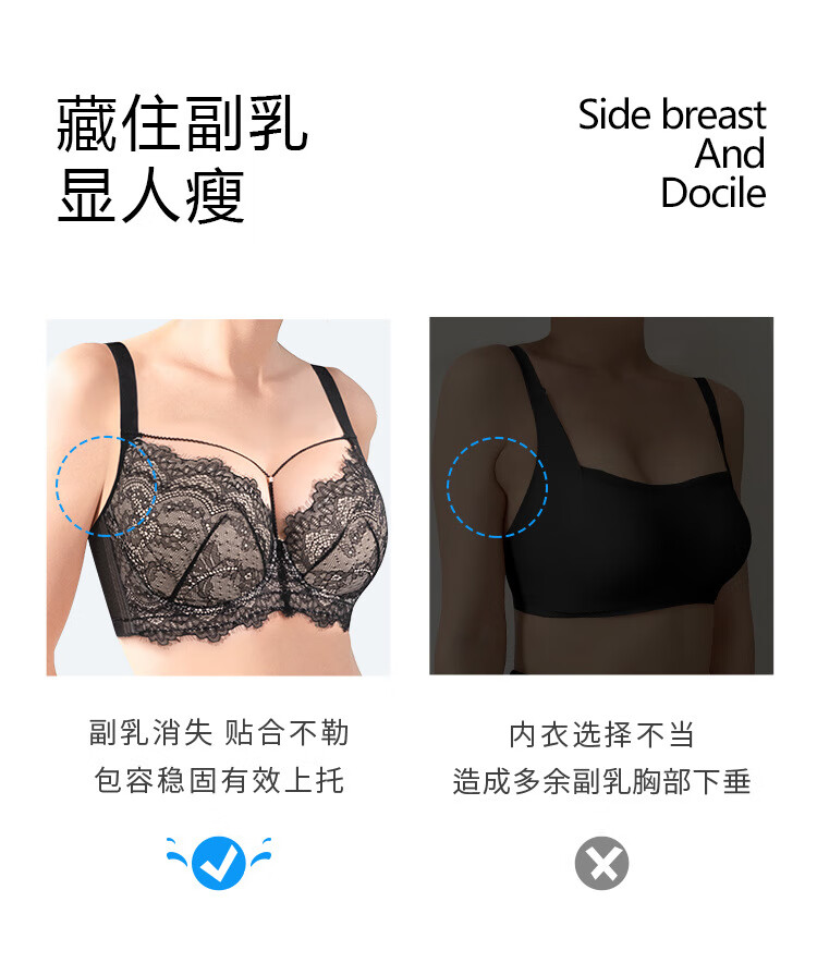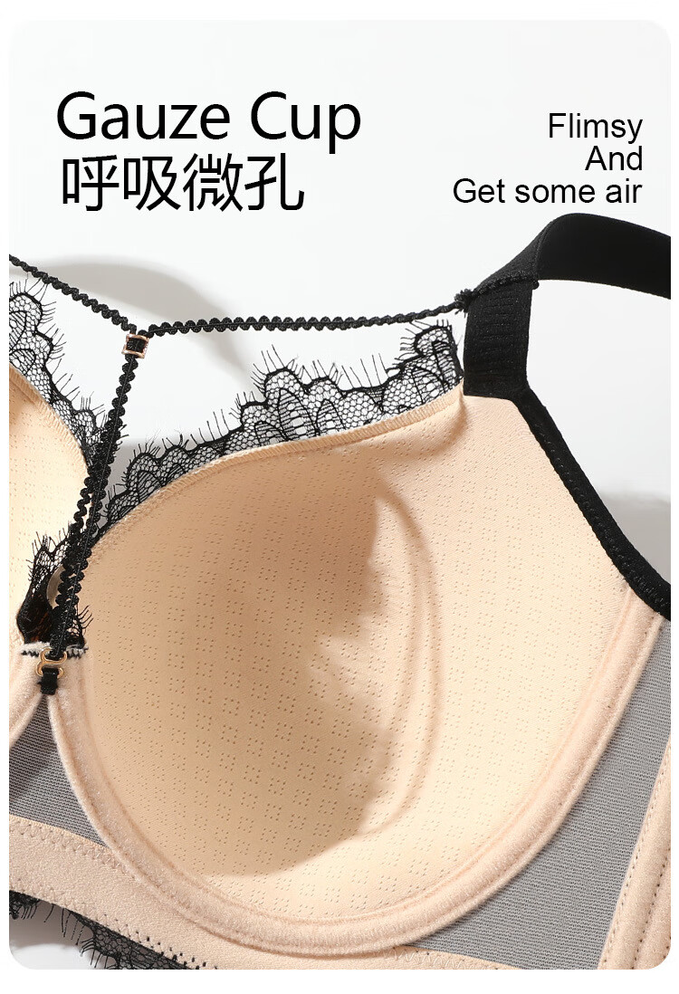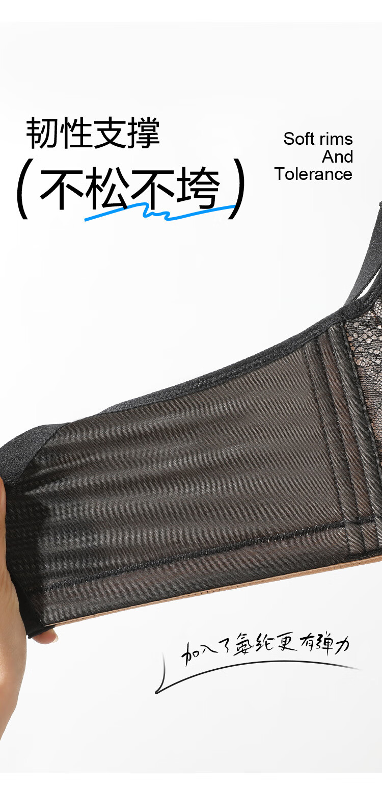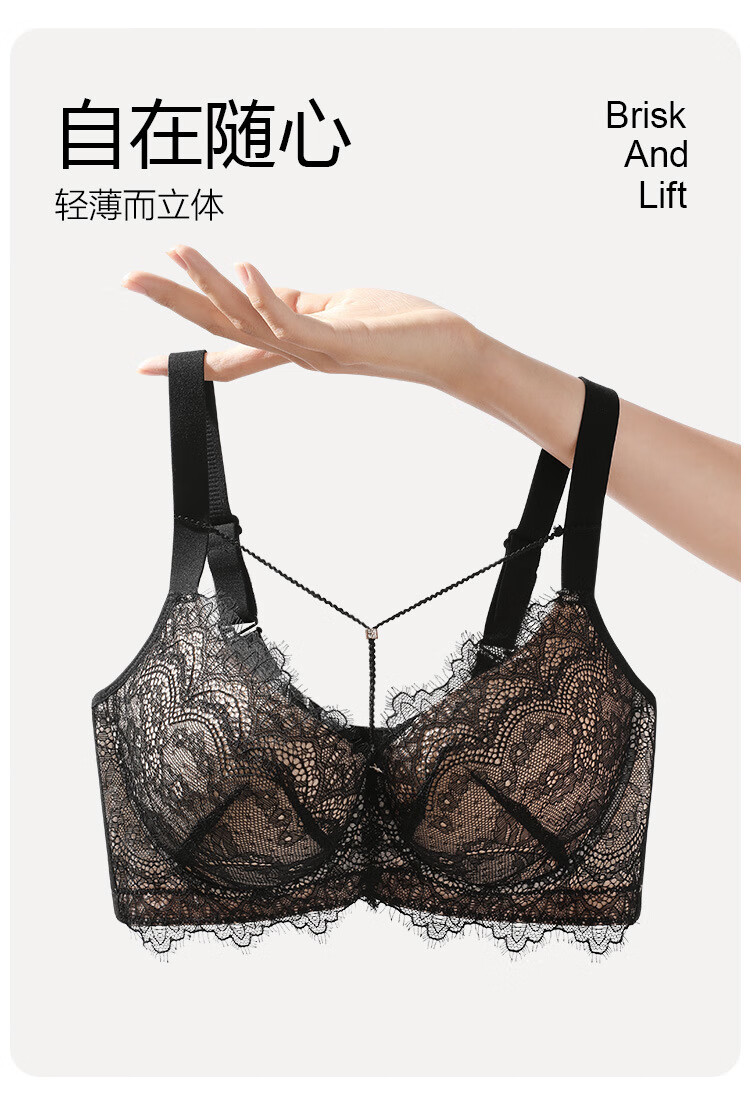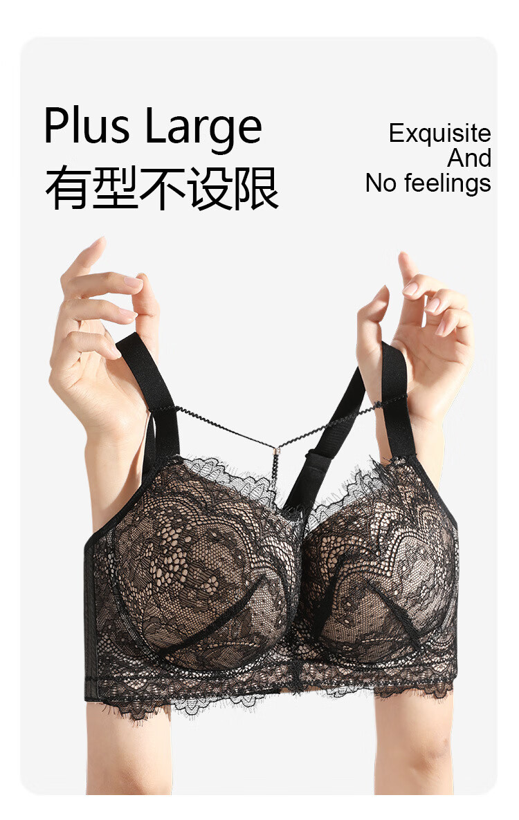 Sugar grain large size underwear for women with big breasts and small breasts, sexy lace push-up support to prevent sagging and reduce side breasts, thin bra, black and translucent 90C
