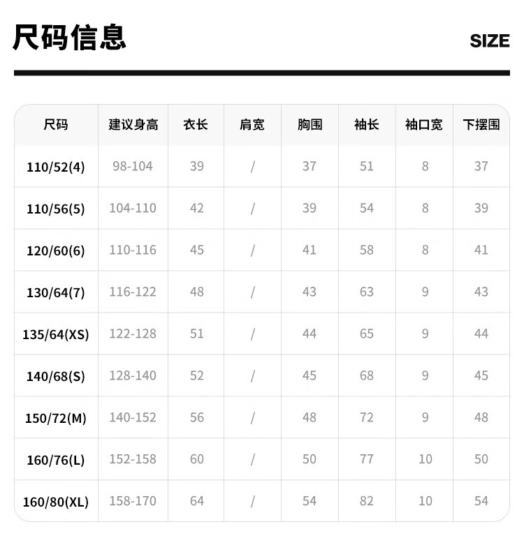 China (cm) 160-165/84-86 165-170 / 88-90 167-172 / 92-96 168-173 / 98-102 170-176 / 106-110