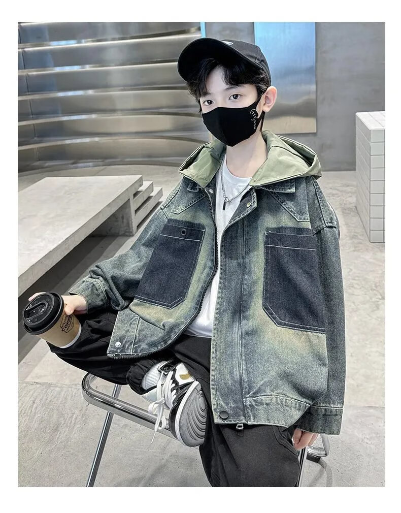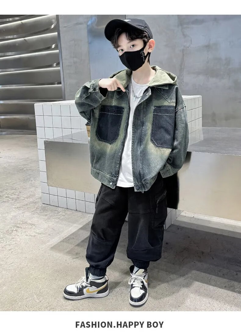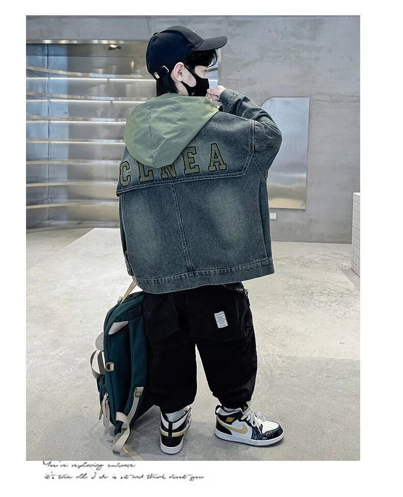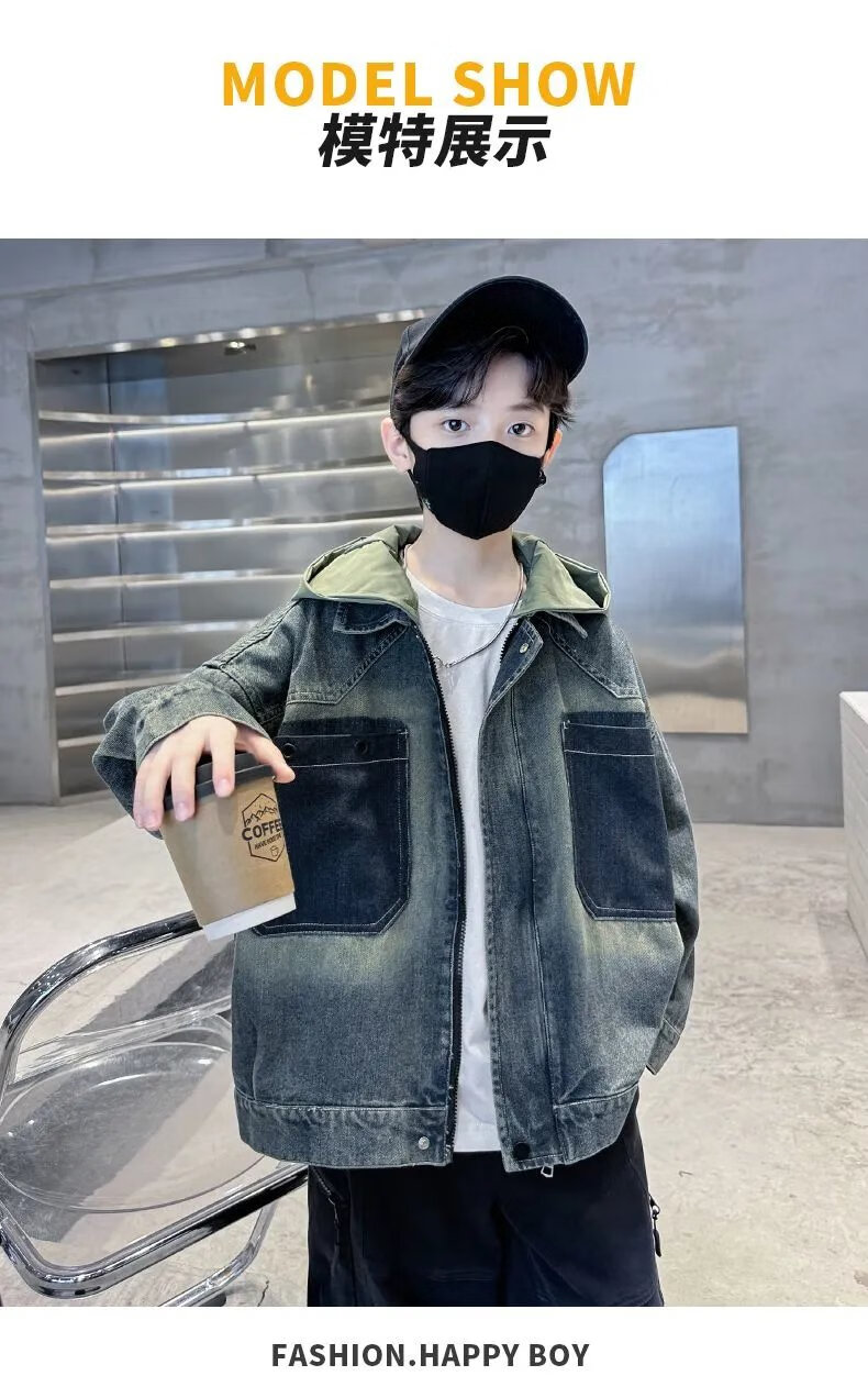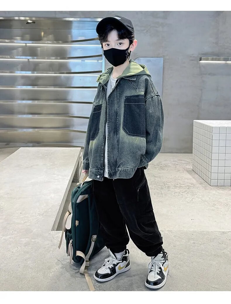 Disney (Disney) children's clothing, boys' autumn jackets, spring and autumn new models, medium and large children's boys handsome denim autumn hooded trend, retro color 130
