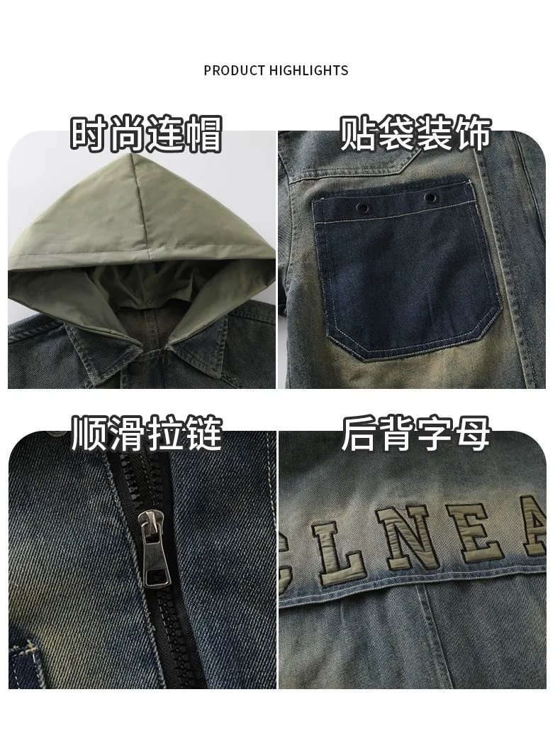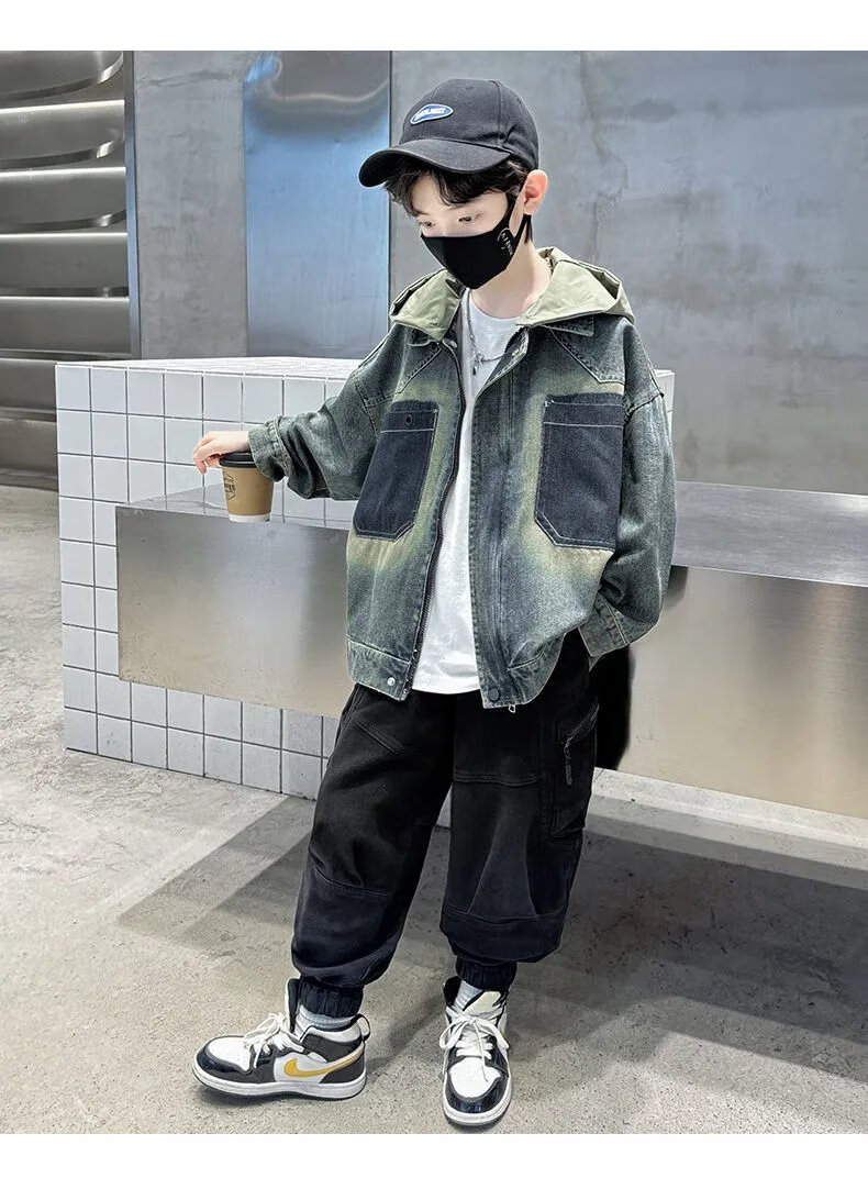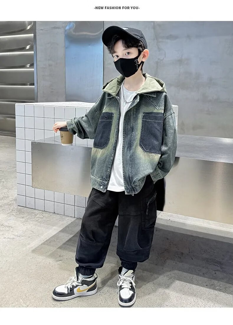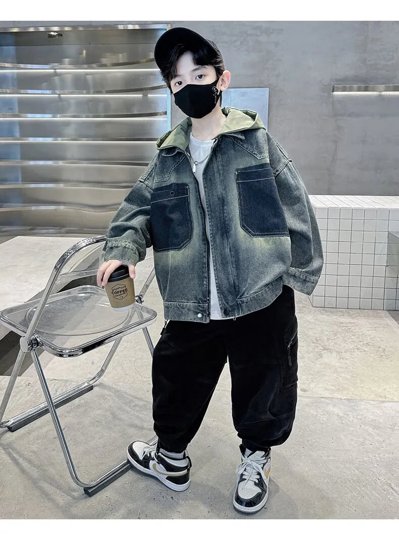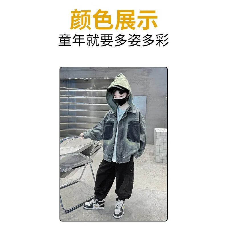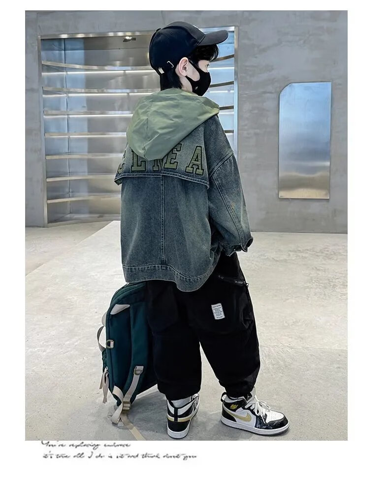 Disney (Disney) children's clothing, boys' autumn jackets, spring and autumn new models, medium and large children's boys handsome denim autumn hooded trend, retro color 130