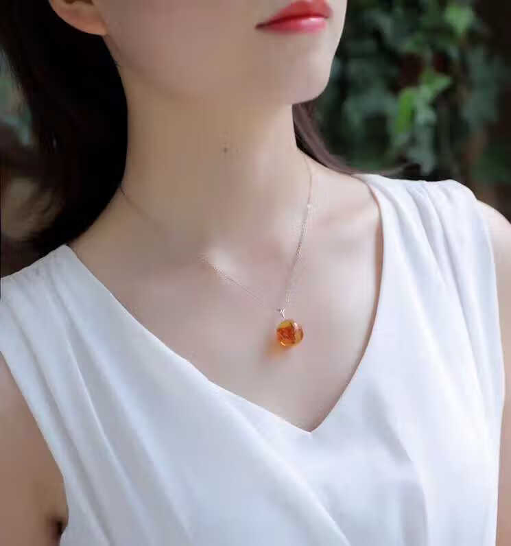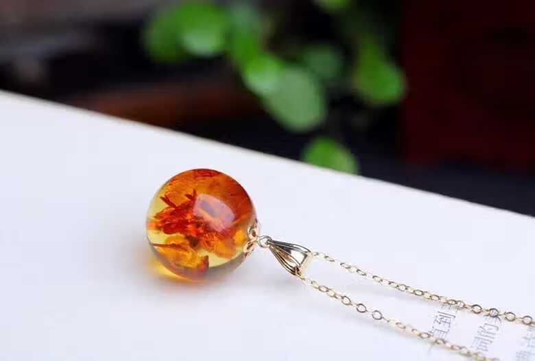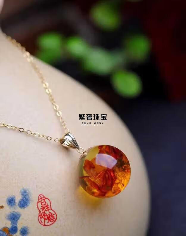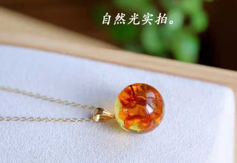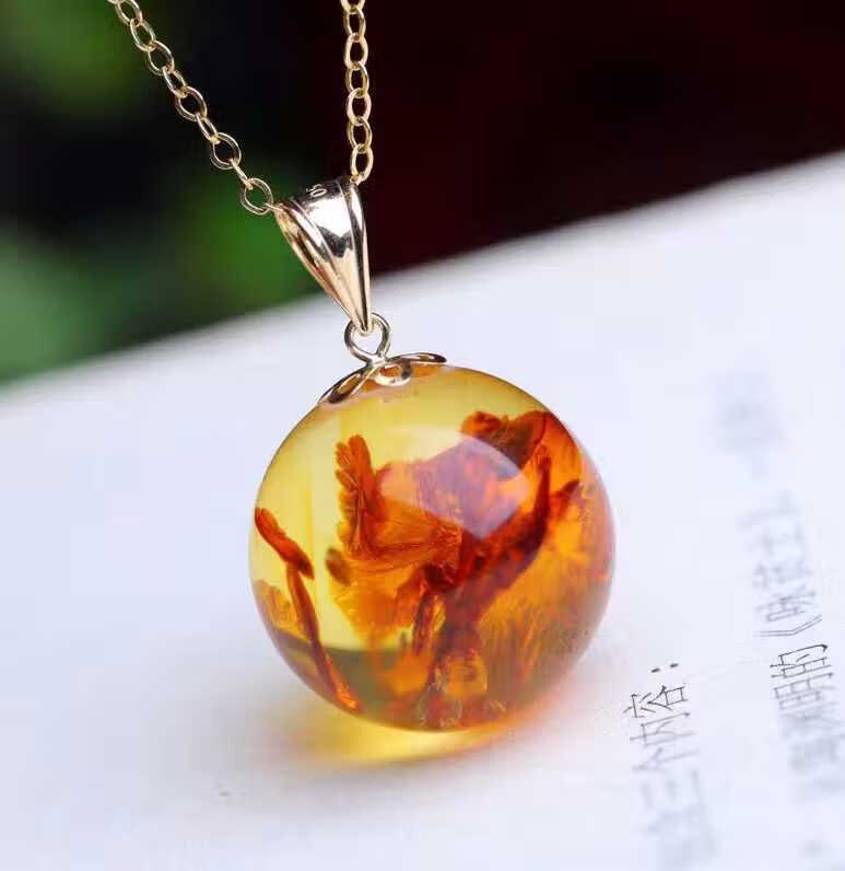 Extravagant 18k gold inlaid with natural flower amber 14mm round bead pendant for women amber transfer beads small ball versatile necklace clavicle chain