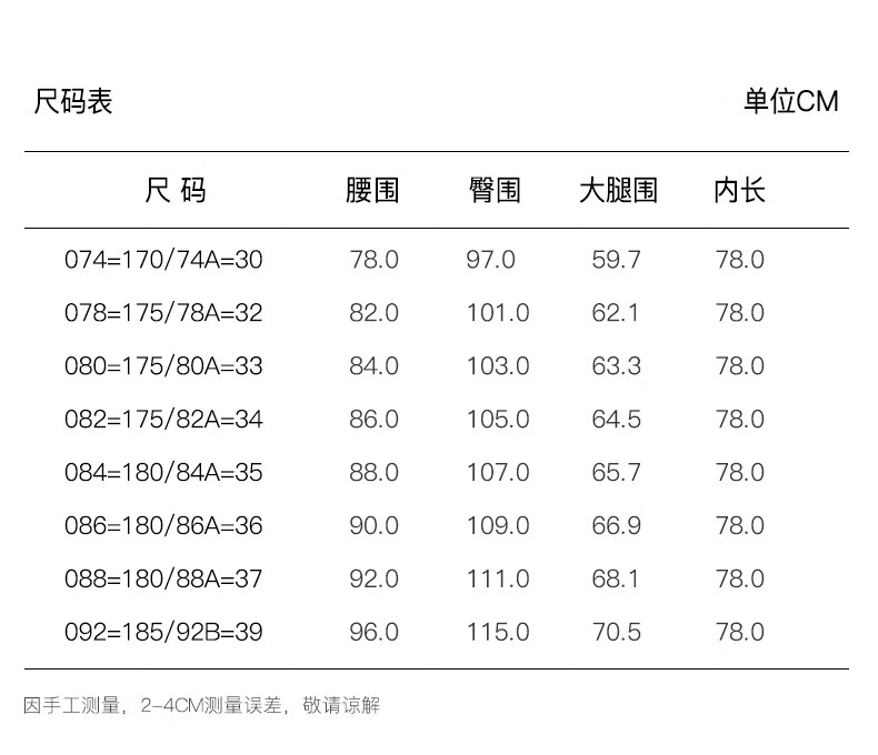 China (cm) 160-165/84-86 165-170 / 88-90 167-172 / 92-96 168-173 / 98-102 170-176 / 106-110