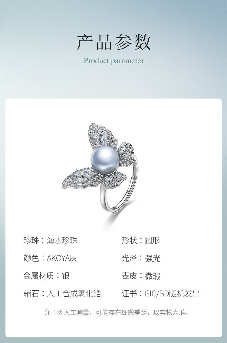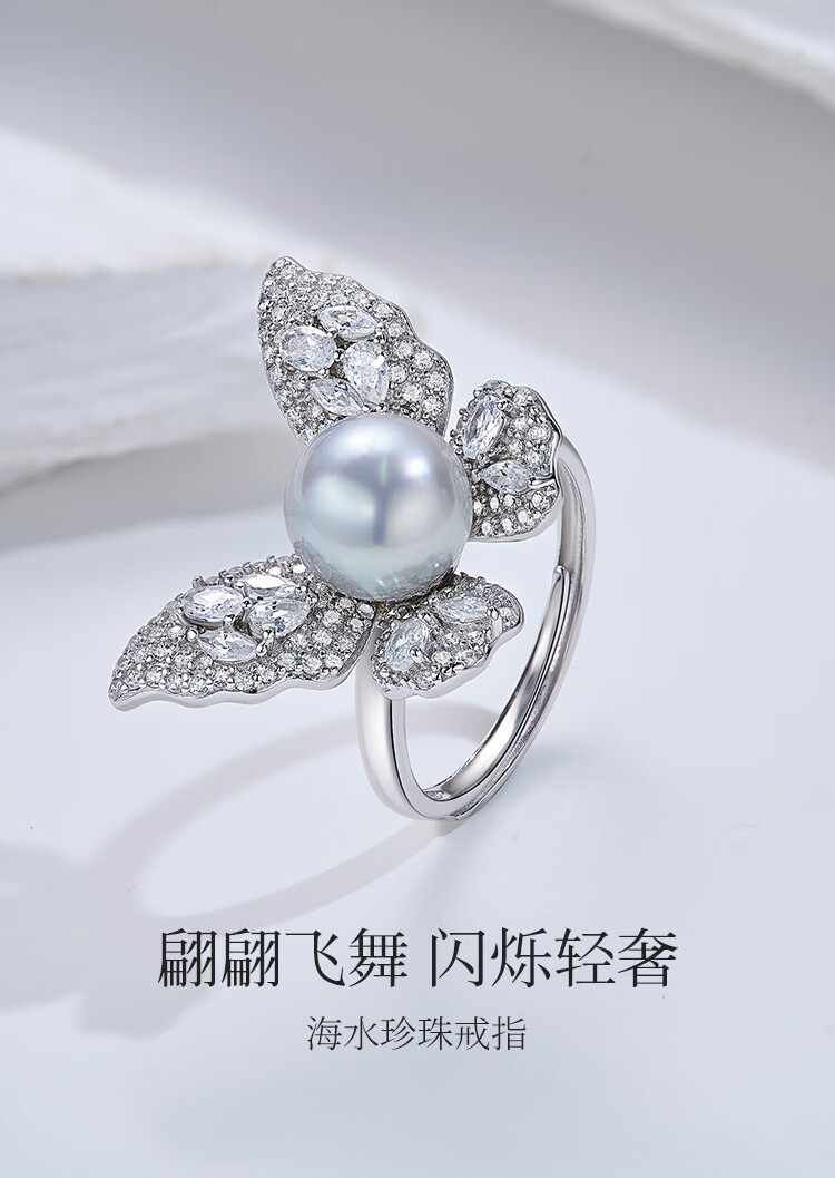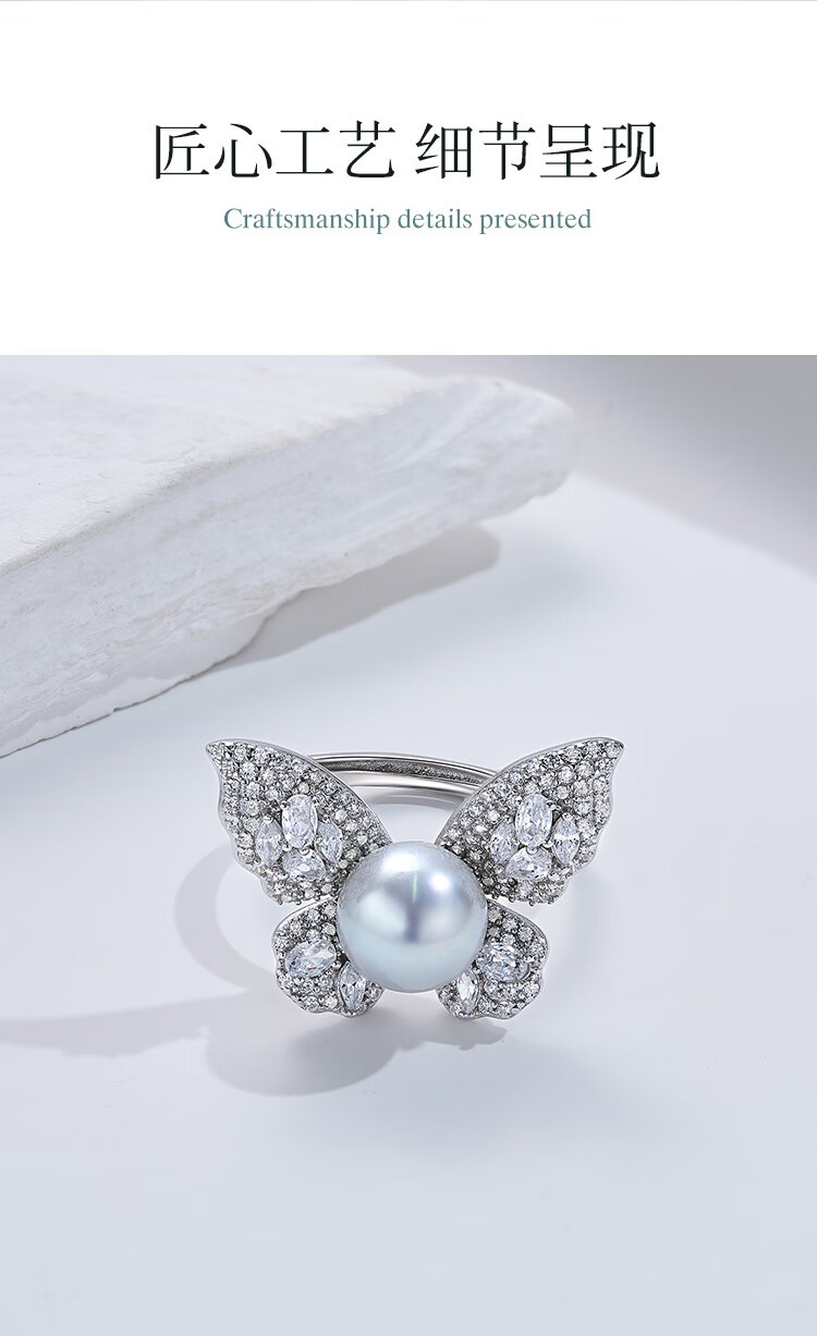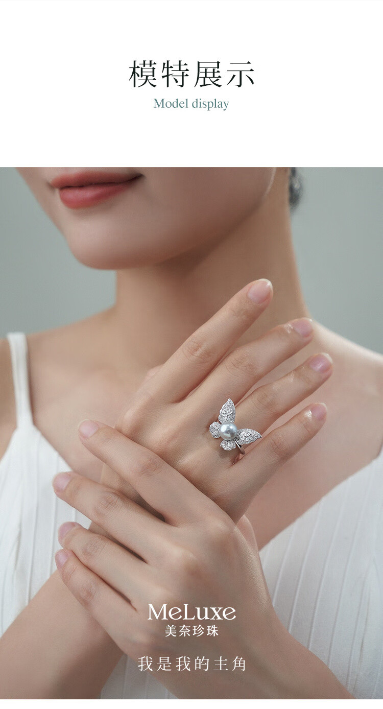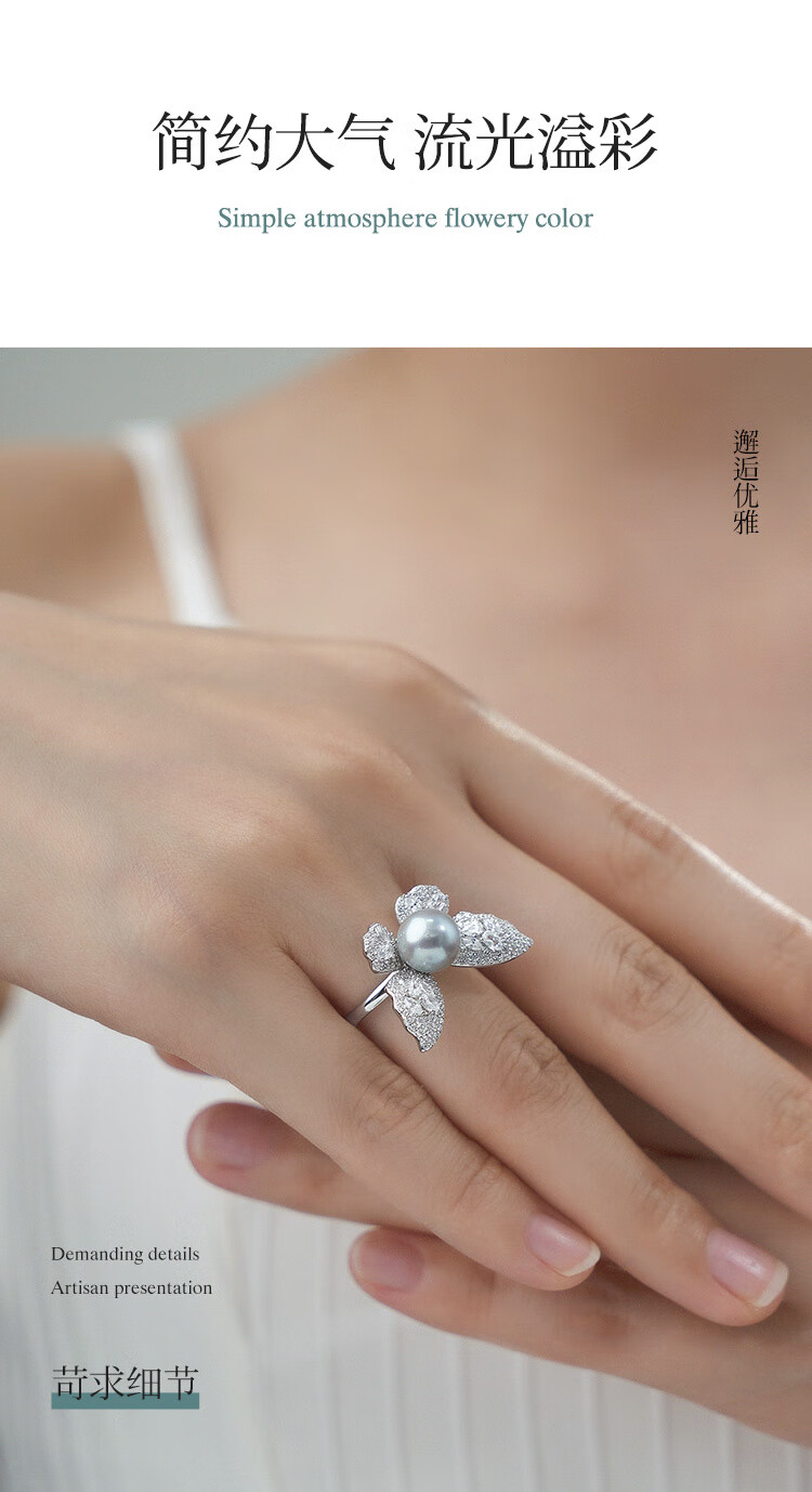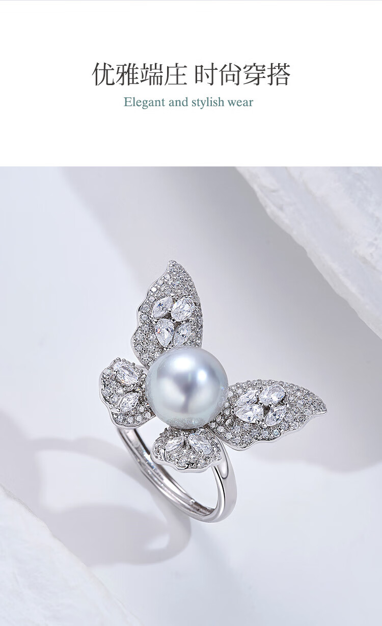 Meluxe S925 silver akoya gray seawater pearl ring butterfly live pearl female ring birthday gift for wife akoya gray 6-6.5mm