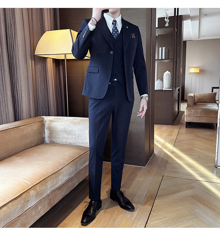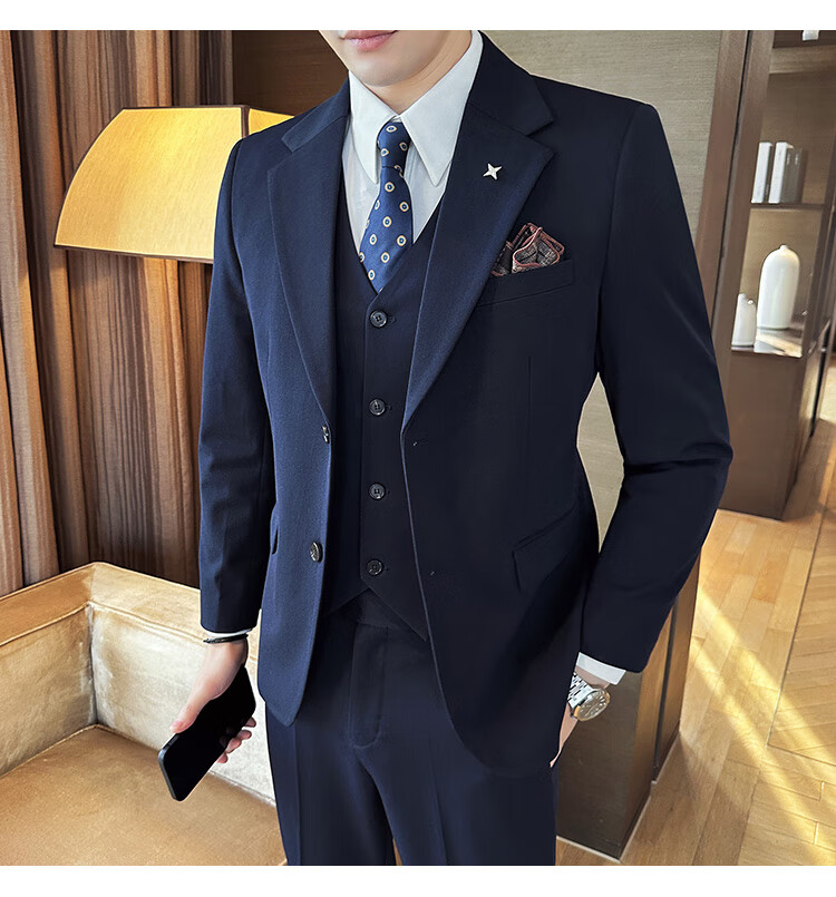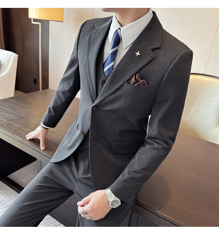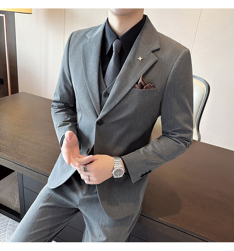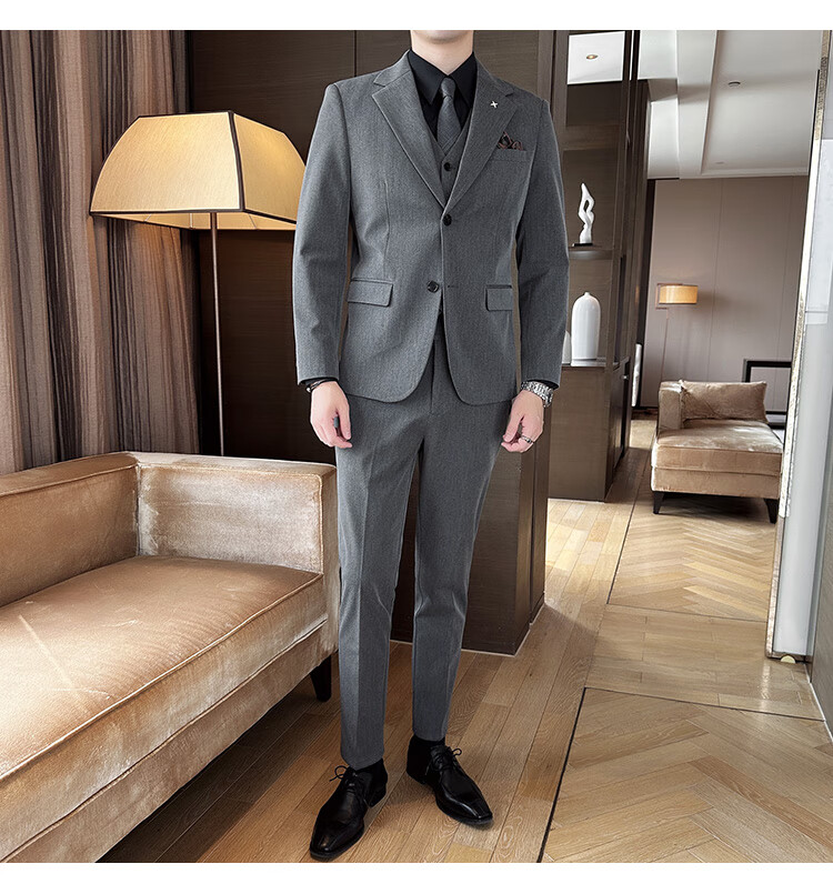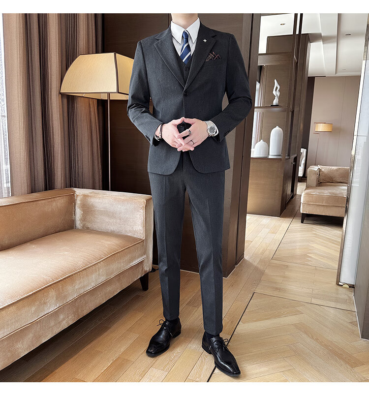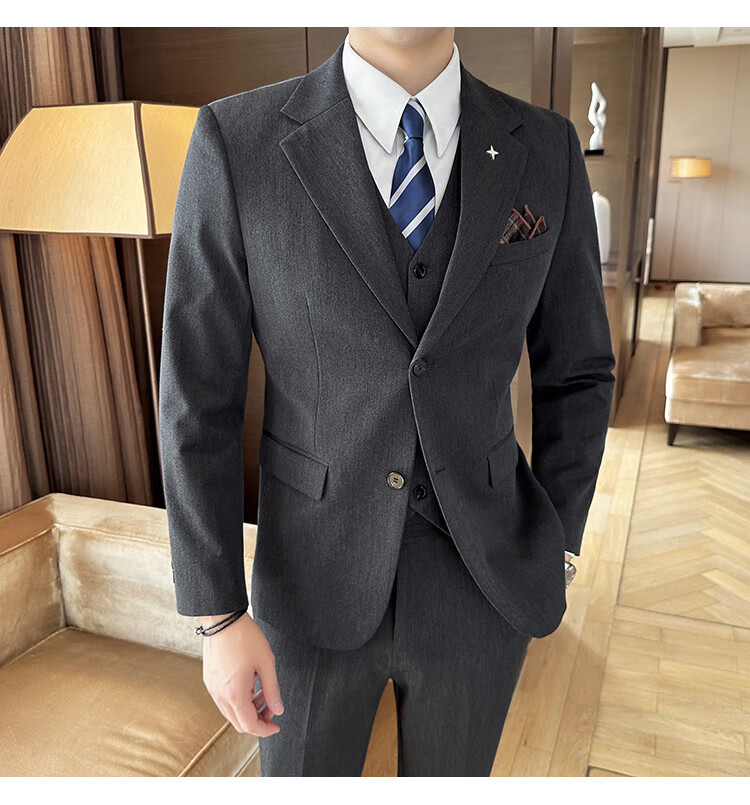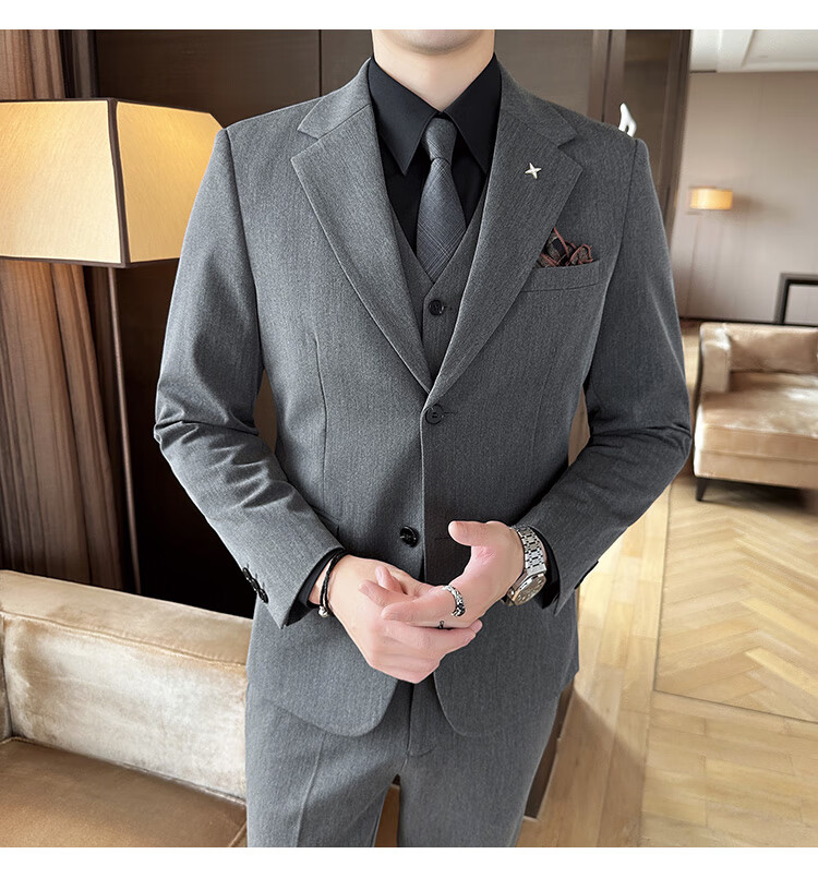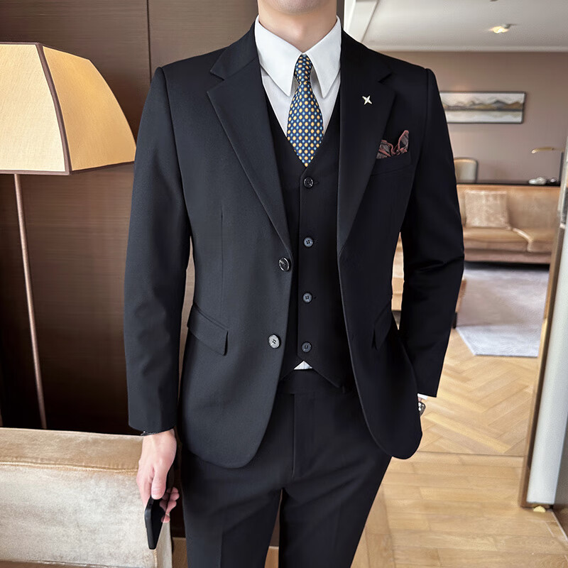 ROMON high-end suit suit men's slim large size suit business professional formal dress groom and best man wedding dress black suit + vest + trousers M