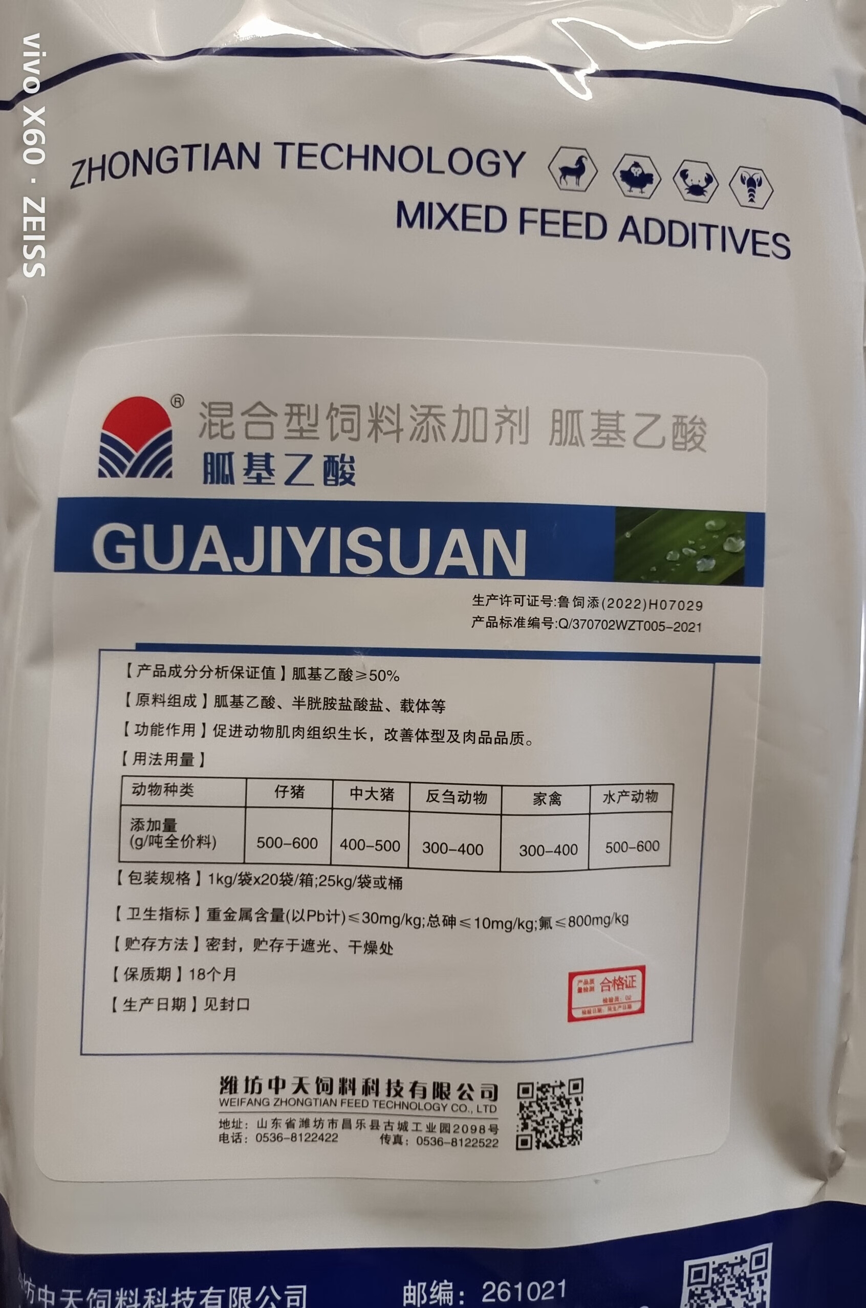 Weifang Zhongtian 50 Guanidino Acetic Acid General Veterinary Mixed Feed Additive for Pigs, Chickens, Cattle, Sheep and Aquatic Products 50 Guanidino Acetic Acid 1kg per bag